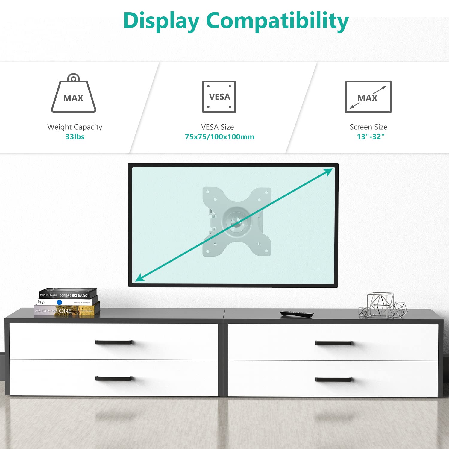 Wide Compatibility: The WALI Full Motion TV Wall Mount for most 13 to 32 inches flat panel screen display up to 33lbs, with Mounting Holes 75x75mm to 100x100mm. Detail: 75x75mm(3”x3”),100x100mm(4”x4”).