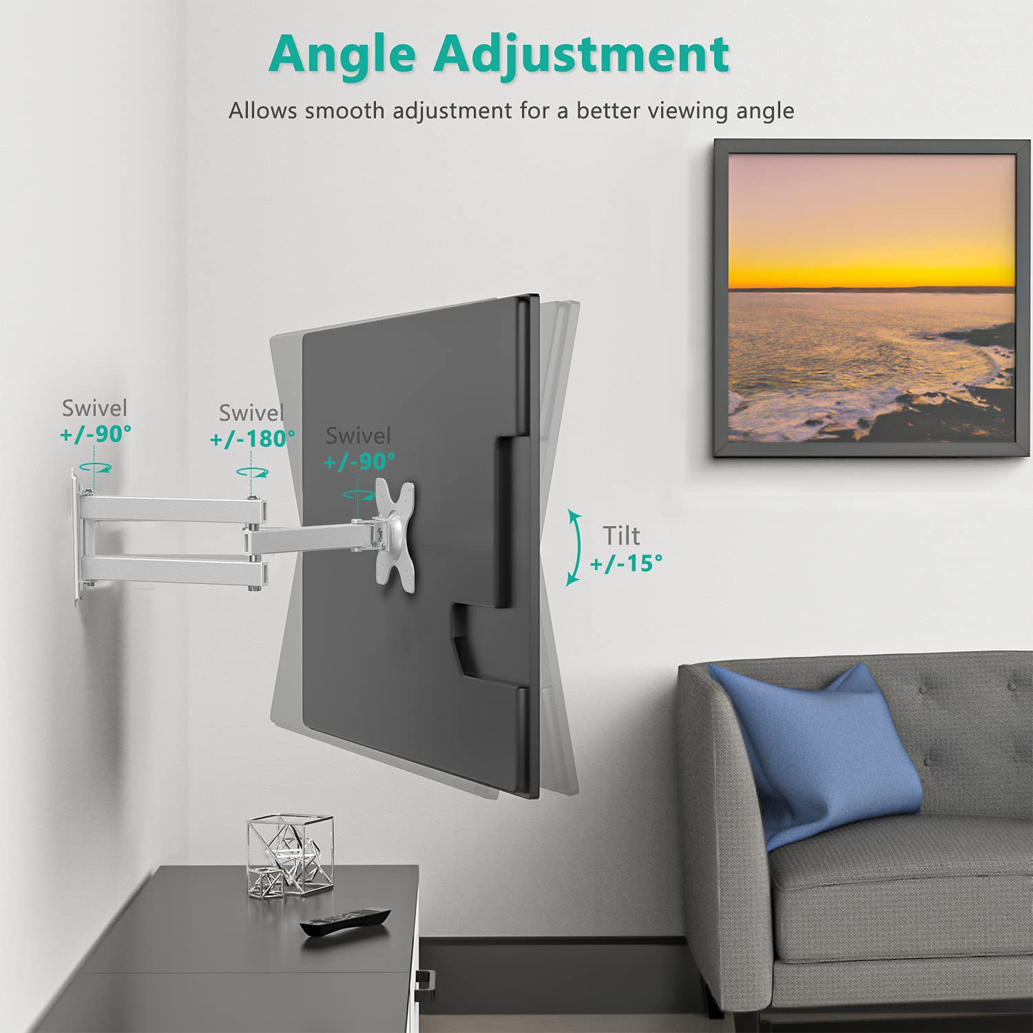 Flexible Positioning for Optimal Comfort: Our articulating monitor wall mount features ±15° tilt, 180° swivel, and 360° rotation, providing enhanced viewing flexibility. Easily adjust the screen to your ideal position for a comfortable and ergonomic viewing experience.