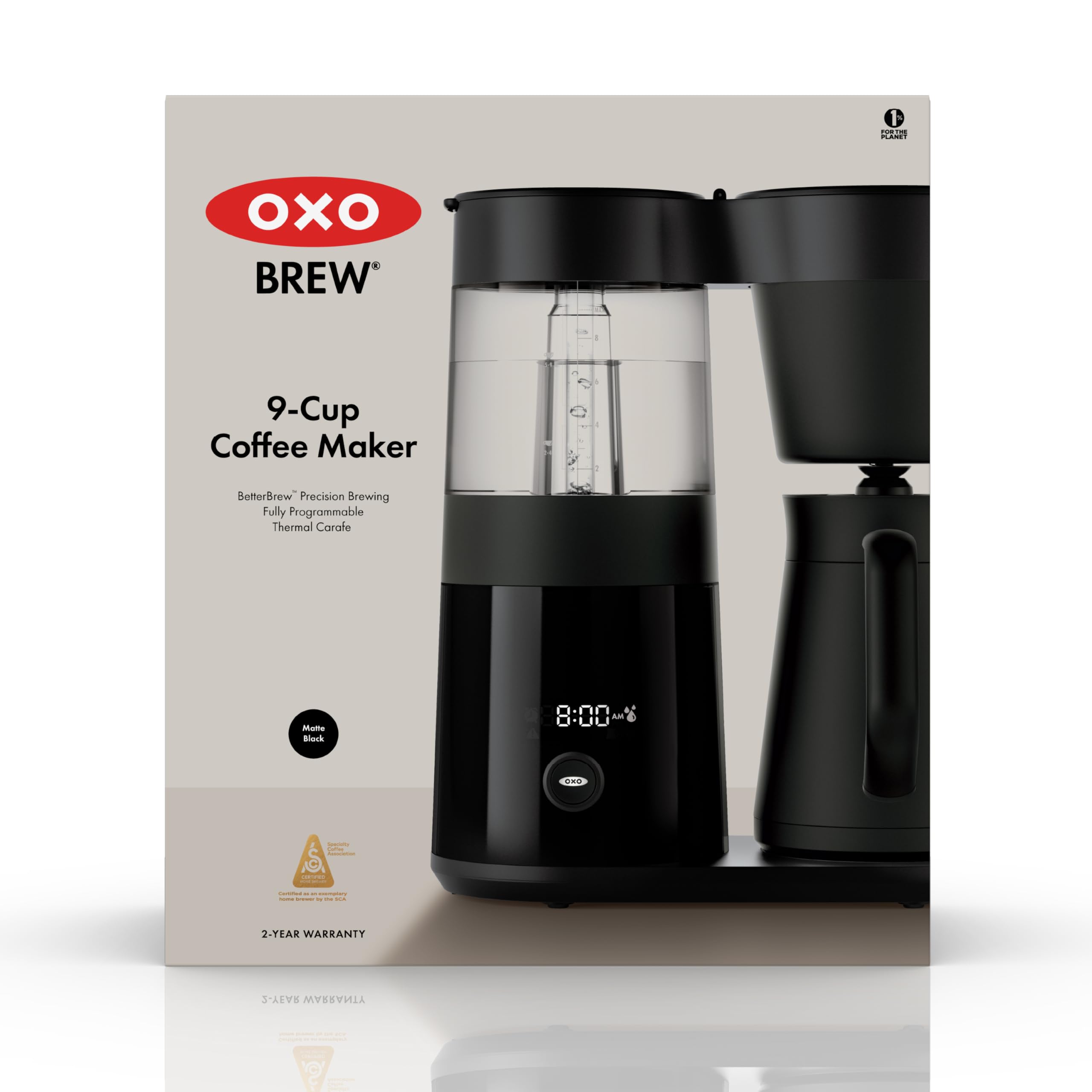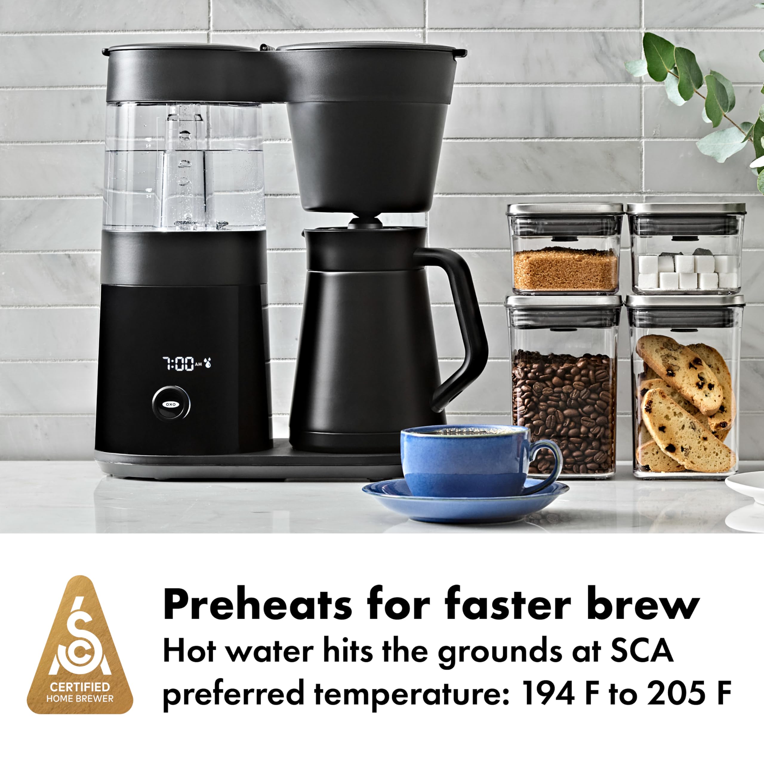 Get rich flavorful coffee at the push of a button. The OXO 9-Cup Coffee Maker uses BetterBrew™ precision technology to optimize brewing time and ensure that water hits the grounds at 194–204.8°F -- the SCA-preferred range for a better-tasting brew. The double-wall thermal carafe keeps your coffee hot while the pause and pour feature lets you grab a grab a cup before brewing is complete. If you depend on fresh coffee, the freshness indicator will make your day, every day. The OXO Brew 9-Cup Coffee Maker is recognized as an exemplary home brewer by the SCA (Specialty Coffee Association) for delivering rich, gold-standard coffee – every time.