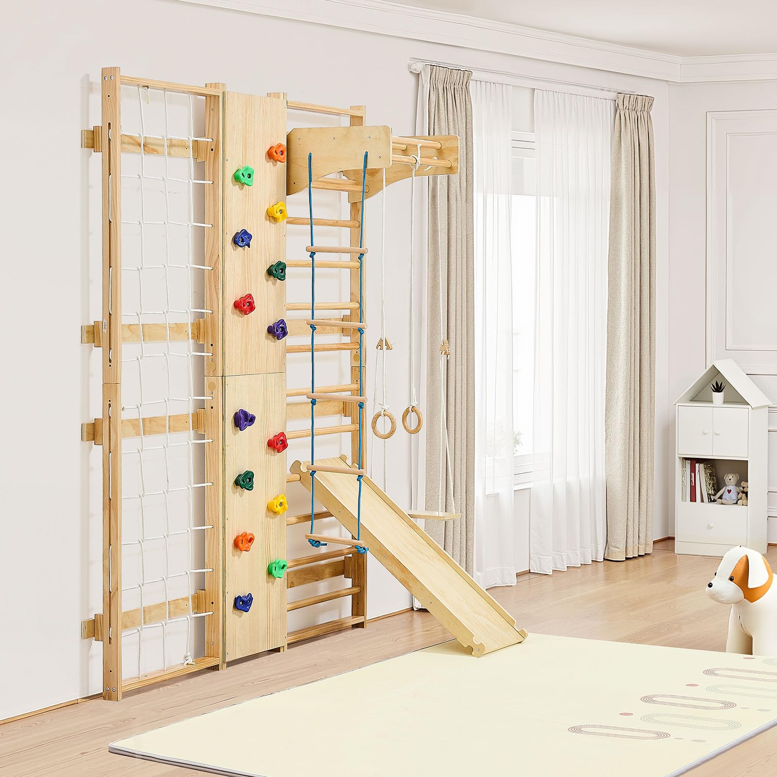 9-in-1 Wall Gym Climbing Playset: This 9-in-1 12-level Swedish ladder wall gym features gym rings, pull-up bar, rock climbing wall, swing, rope wall, rope ladder, wall ladder, climbing board, and slide board, providing endless fun while helping your child stay active and explore new challenges