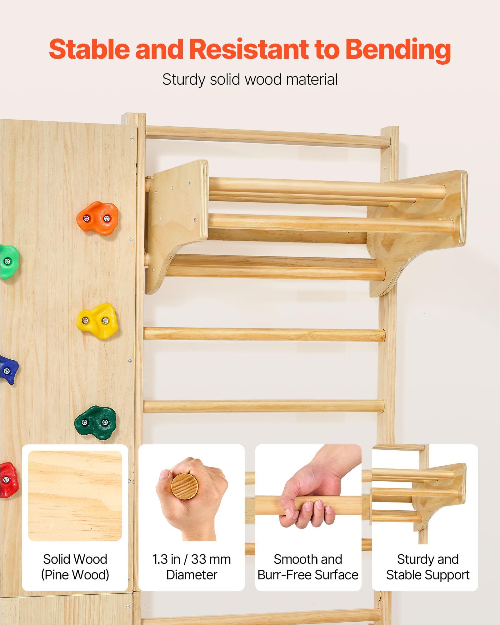 Safe & Comfortable Climbing: The solid wooden gymnastic stall bars feature rounded, polished edges and a smooth, burr-free surface for a secure grip. The step-style climbing design fits children's hand and foot sizes for more stability, and the rope ladder uses thickened anti-slip fiber ropes for safer climbing