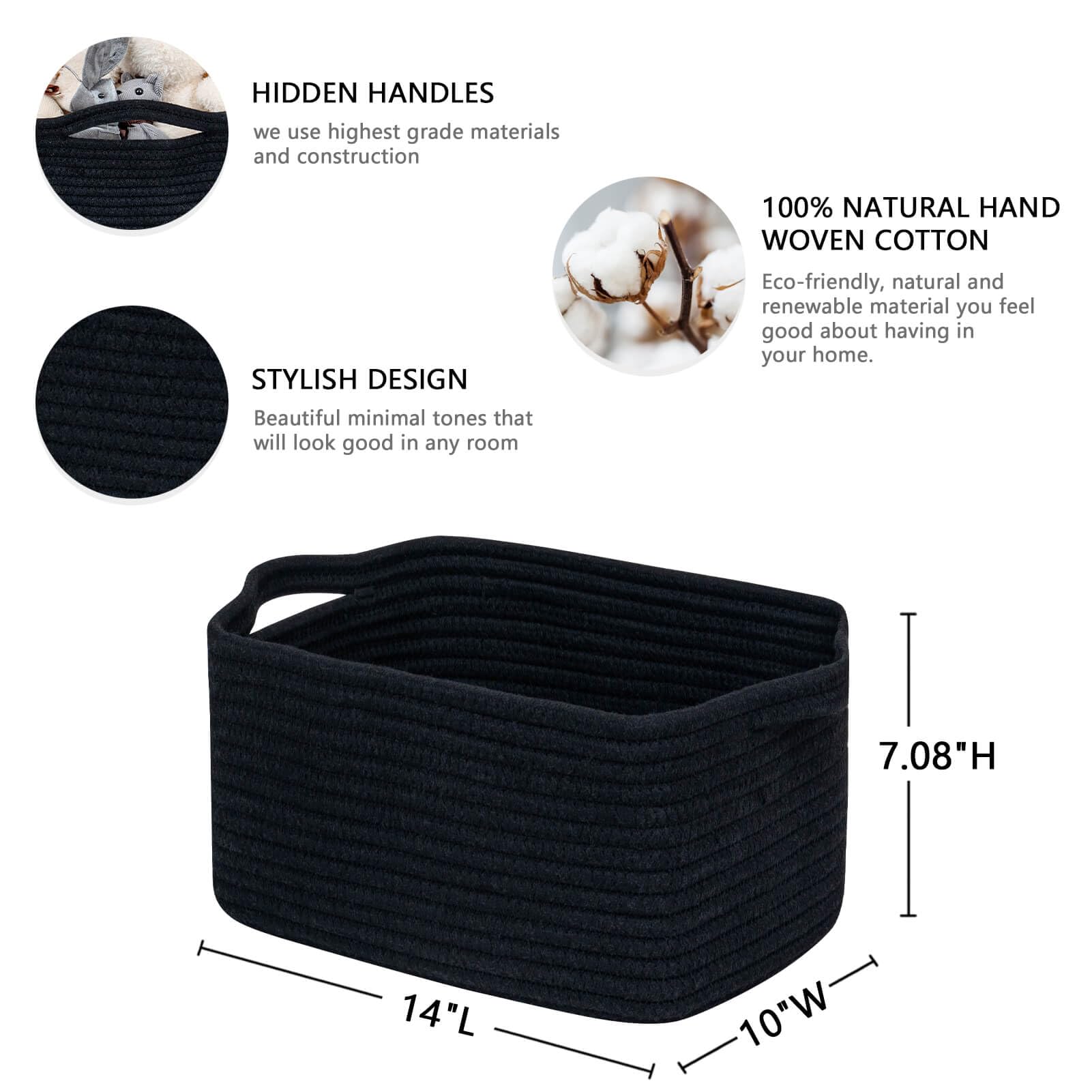 Rectangular Basket. The size of woven rope basket is 14 x 10 x 7.08Inches. Great storage solutions for your laundry room, closet, shelves, entryway, playroom and so on. It also can be used for nursery room as baby baskets or small toy baskets, making your home clean and tidy