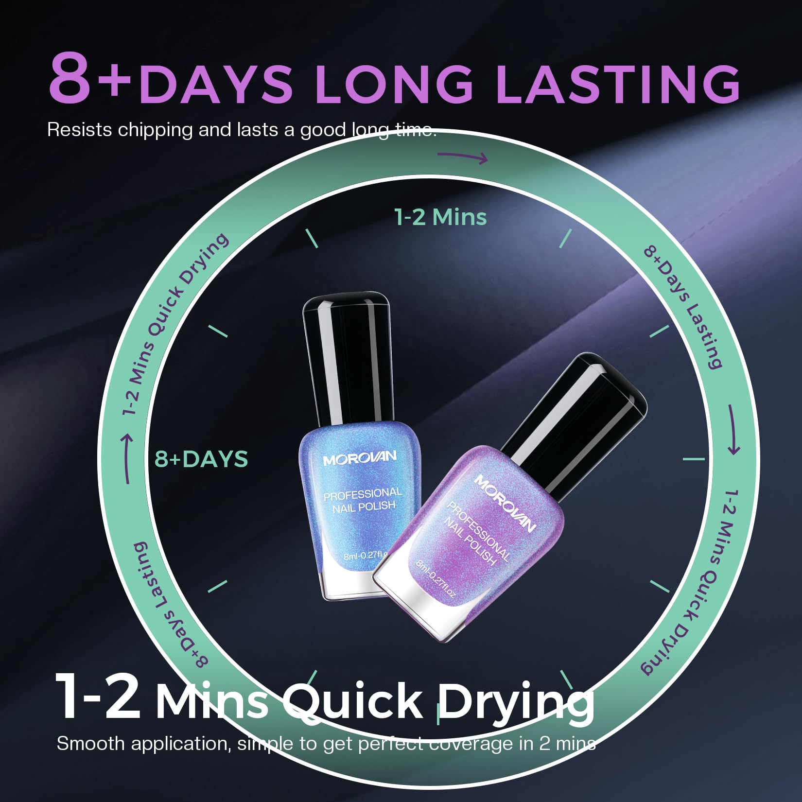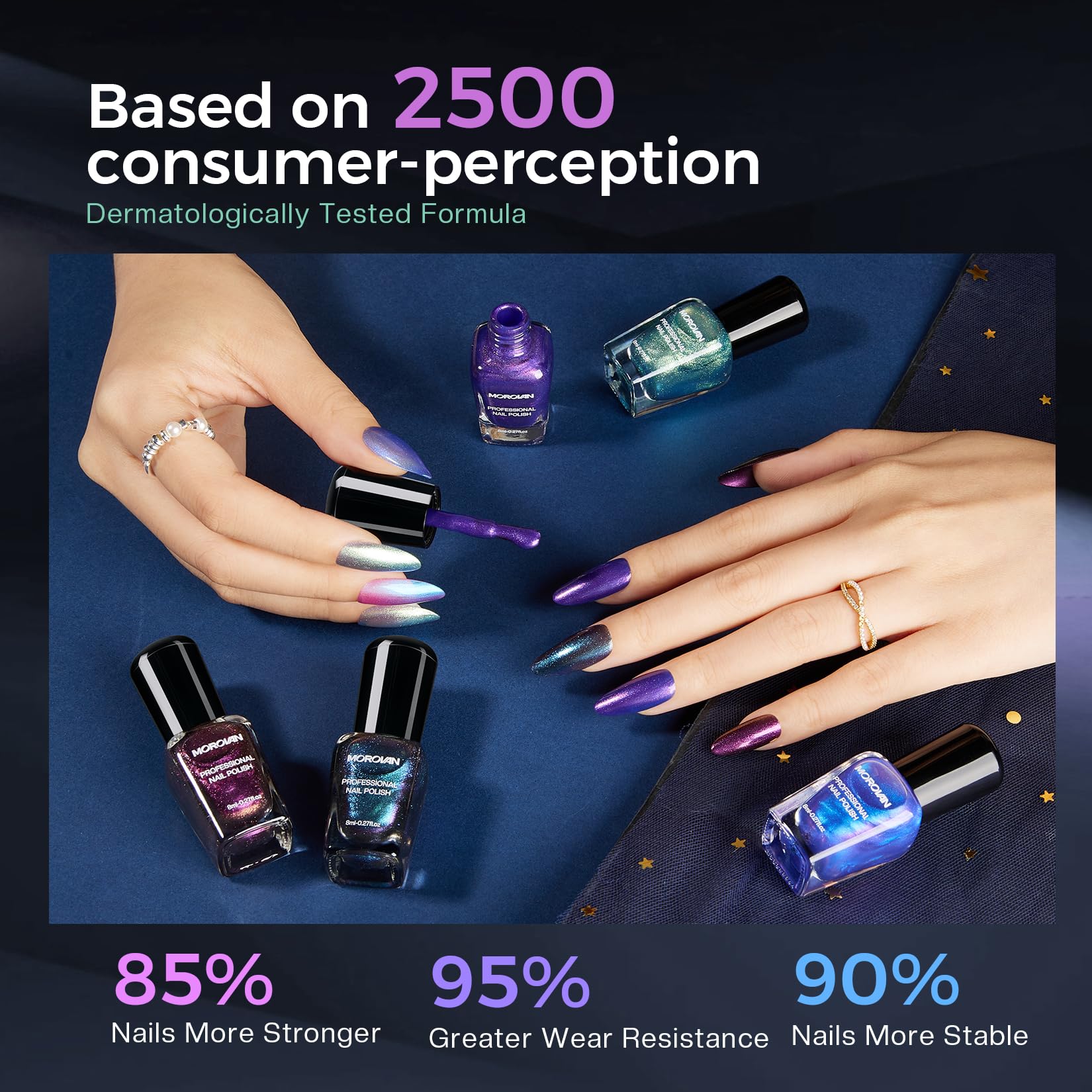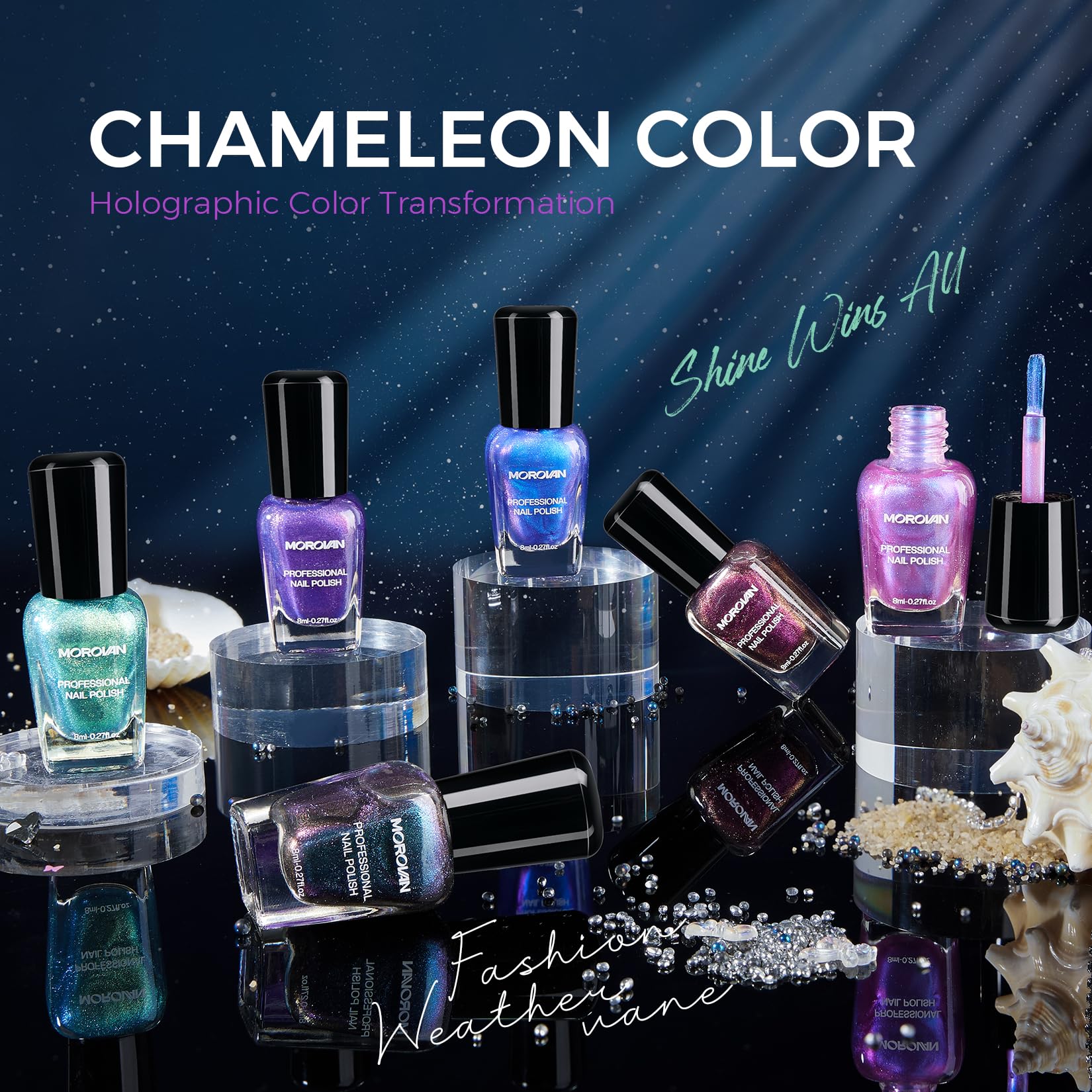 Morovan nail polish set: 2025 Holographic nail polish includes 6 chameleon colors. Under different light sources, it displays different aurora colors. Fast-dry 2min and apply 2-3 layers. Low odor, can be used as both finger nail polish and toe nail polish. Perfectly suitable for any fashion style and theme makeup.