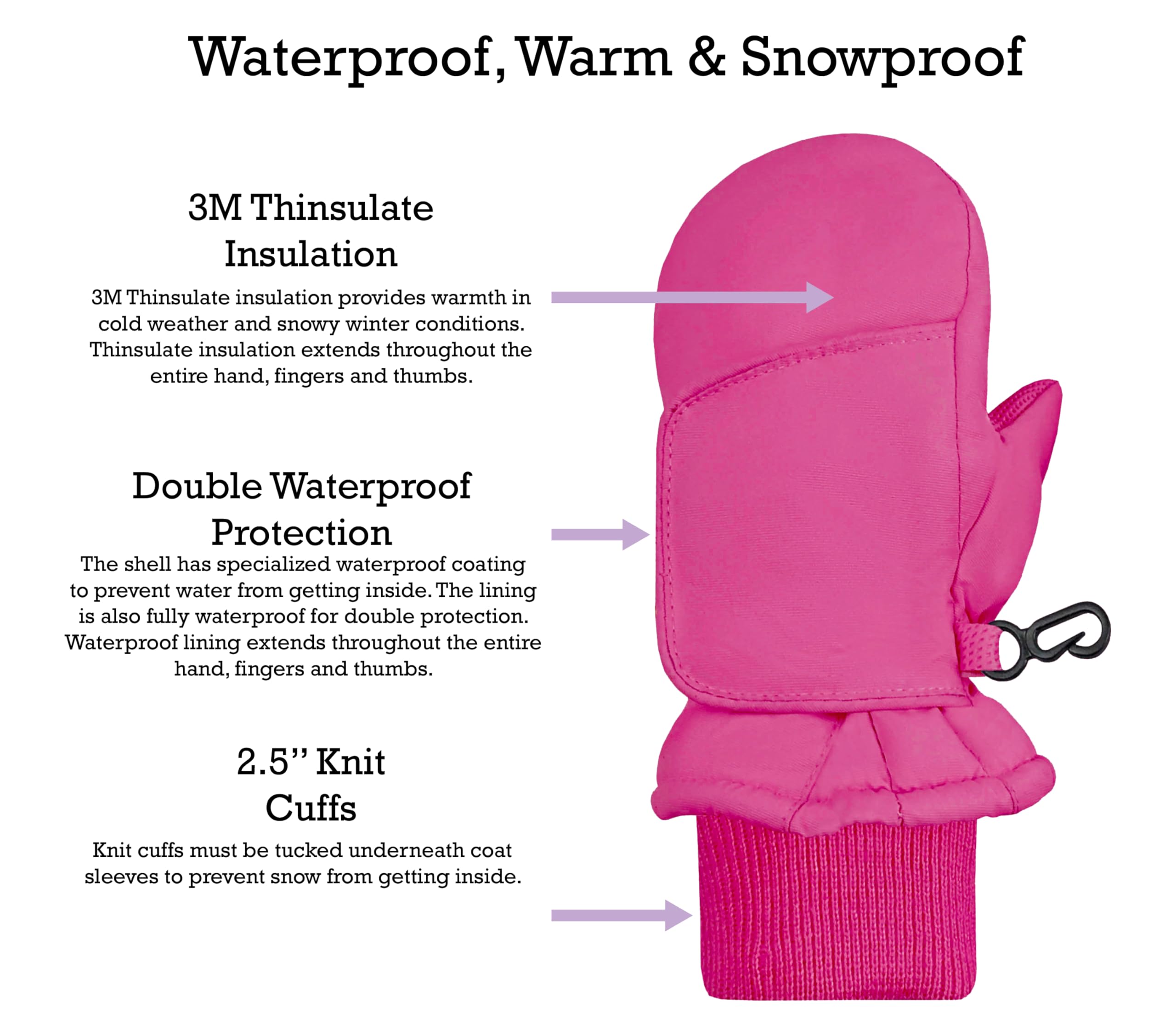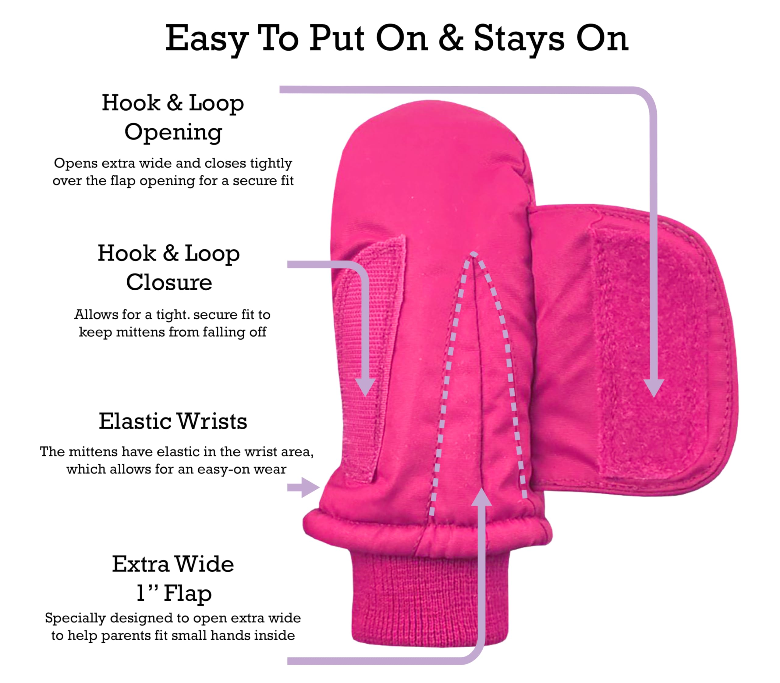 KIDS MITTENS THAT ARE EASY TO PUT ON: The snow mittens are specially designed with a large flap that opens extra wide and there is elastic in the wrist area, which allows plenty of room to fit small hands inside and to find the thumb holes. The hook and loop closure allows for a tight, secure fit. These are great for first-time mitten wearers and little boys, girls, toddlers and infants who love playing outside!