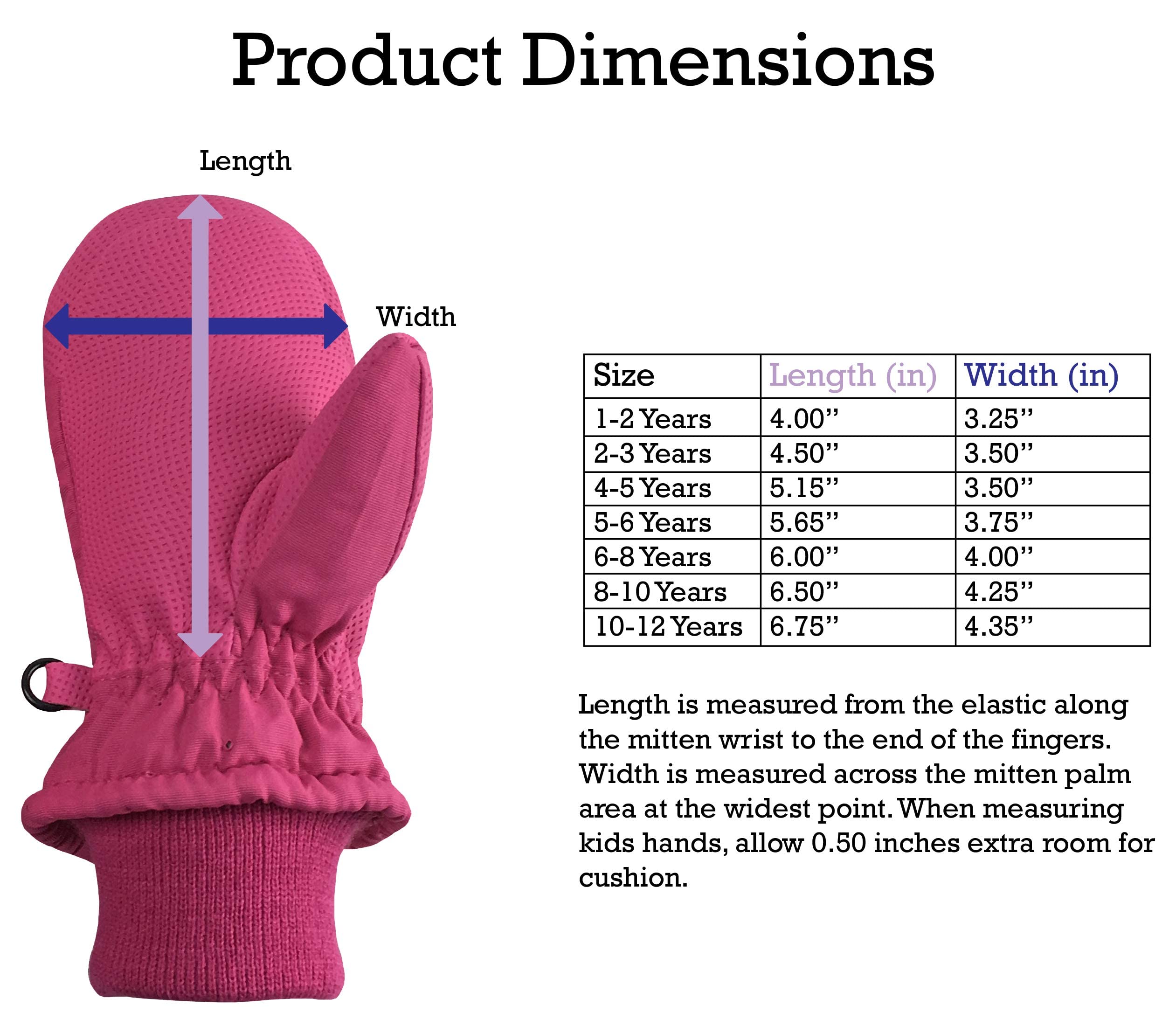 PRODUCT DIMENSIONS: Length (L) is measured from the elastic along the mitten wrist to the end of the fingers; Width (W) is measured across the mitten palm area at the widest point: 1-2 years (4.0" L, 3.25" W); 2-3 years (4.5" L, 3.5" W); 4-5 years (5.15" L, 3.5" W); 6-8 Years (6.0" L, 4.0" W); 8-10 Years (6.5" L, 4.25" W). When measuring kids hands, allow 0.5 inches extra room for cushion.