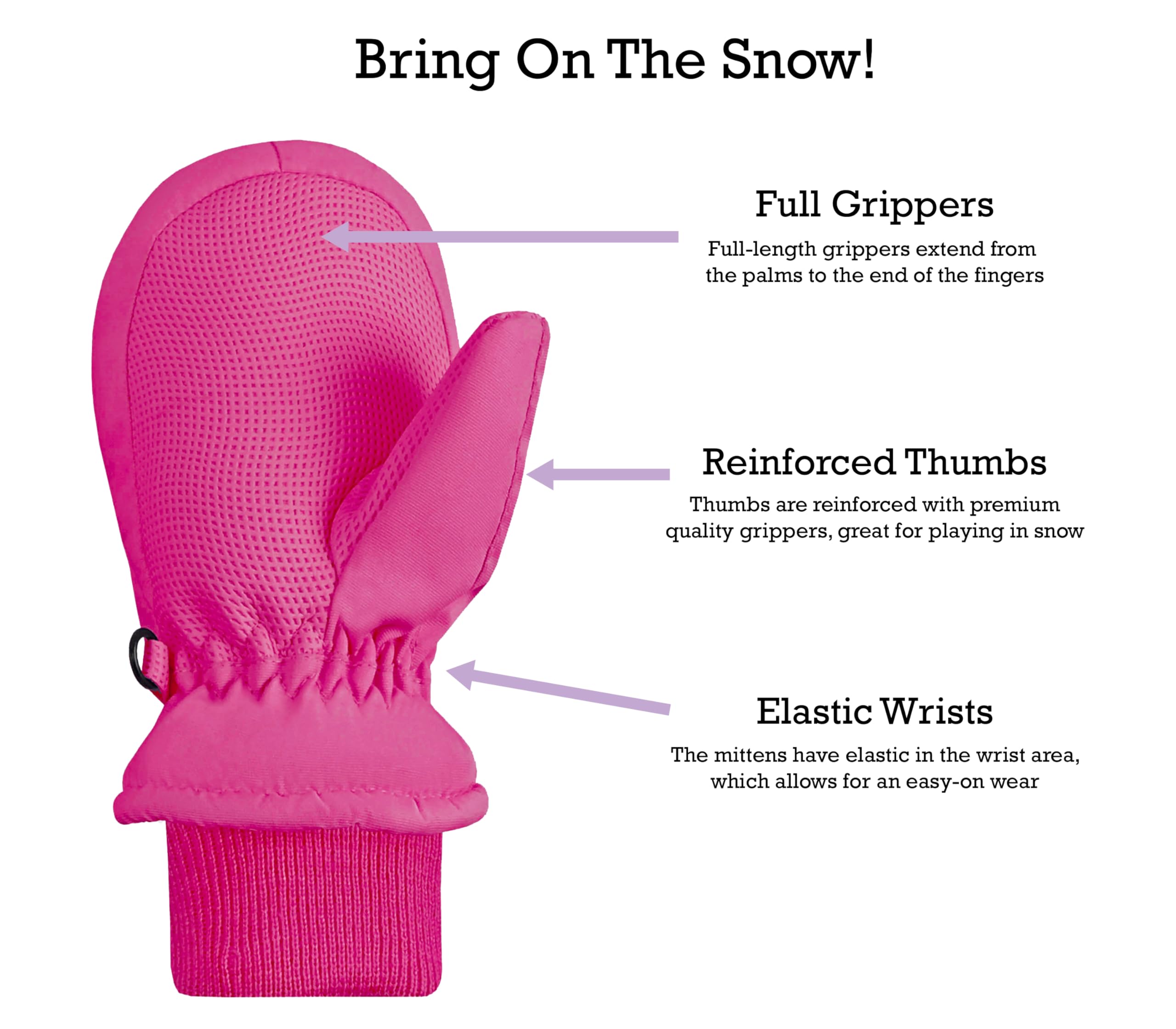 BRING ON THE SNOW! Your little girls, boys, toddlers and infants will love playing in the snow wearing these warm and high quality kids insulated winter mittens. The children’s winter gloves have a grippy palm area as well as grippers on the thumbs, which makes them well suited for playing in the snow and other cold weather activities.