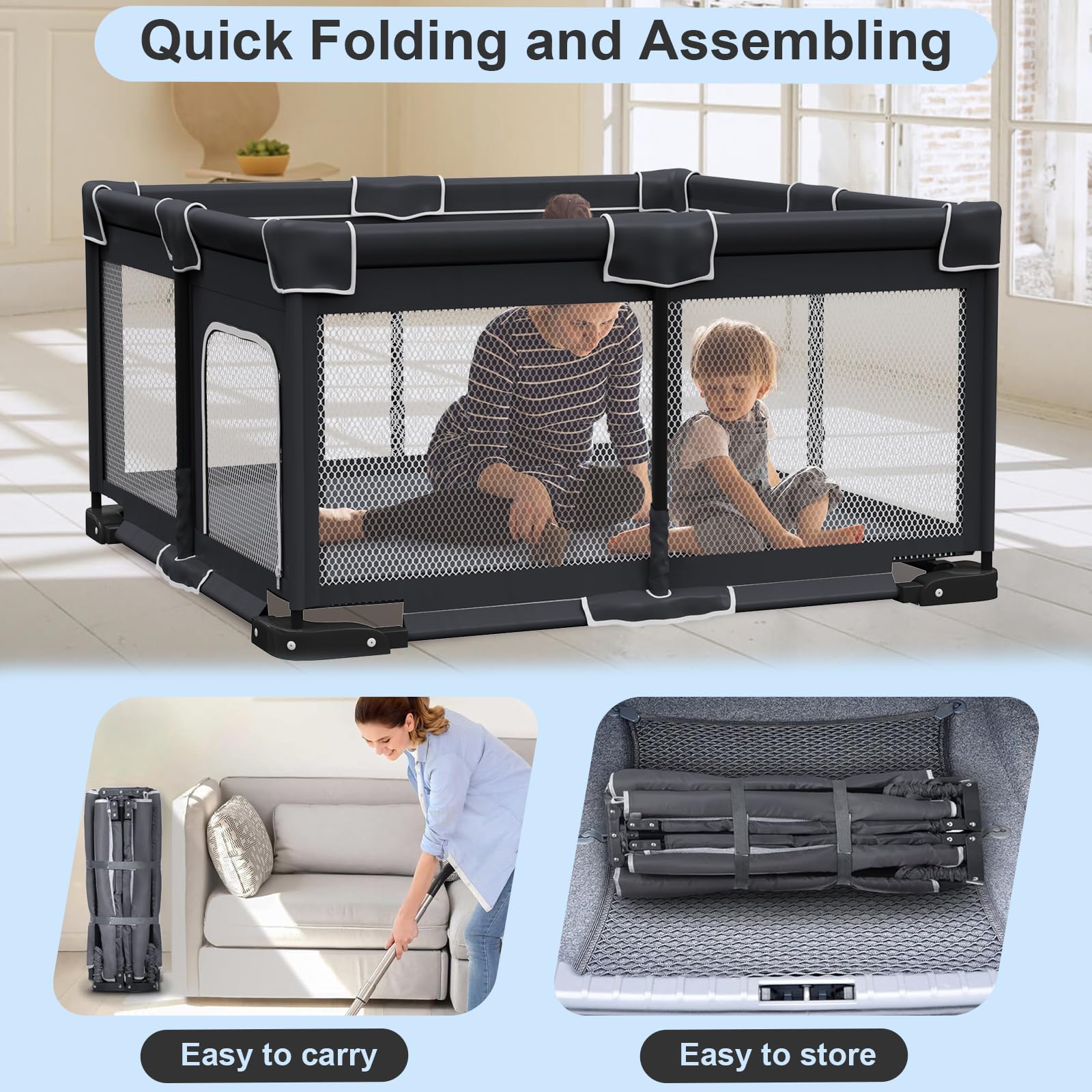 Top Choice for Traveling with a Baby: Grobeybees foldable playpen eliminates the complexity and multitude of accessories and installation process associated with traditional playpens. It can be effortlessly set up or folded in just 1 minutes, and comes equipped with a travel storage bag for enhanced portability. After folding, it can easily be placed in the trunk of a car. The all-mesh design allows for better monitoring of every movement your baby makes.