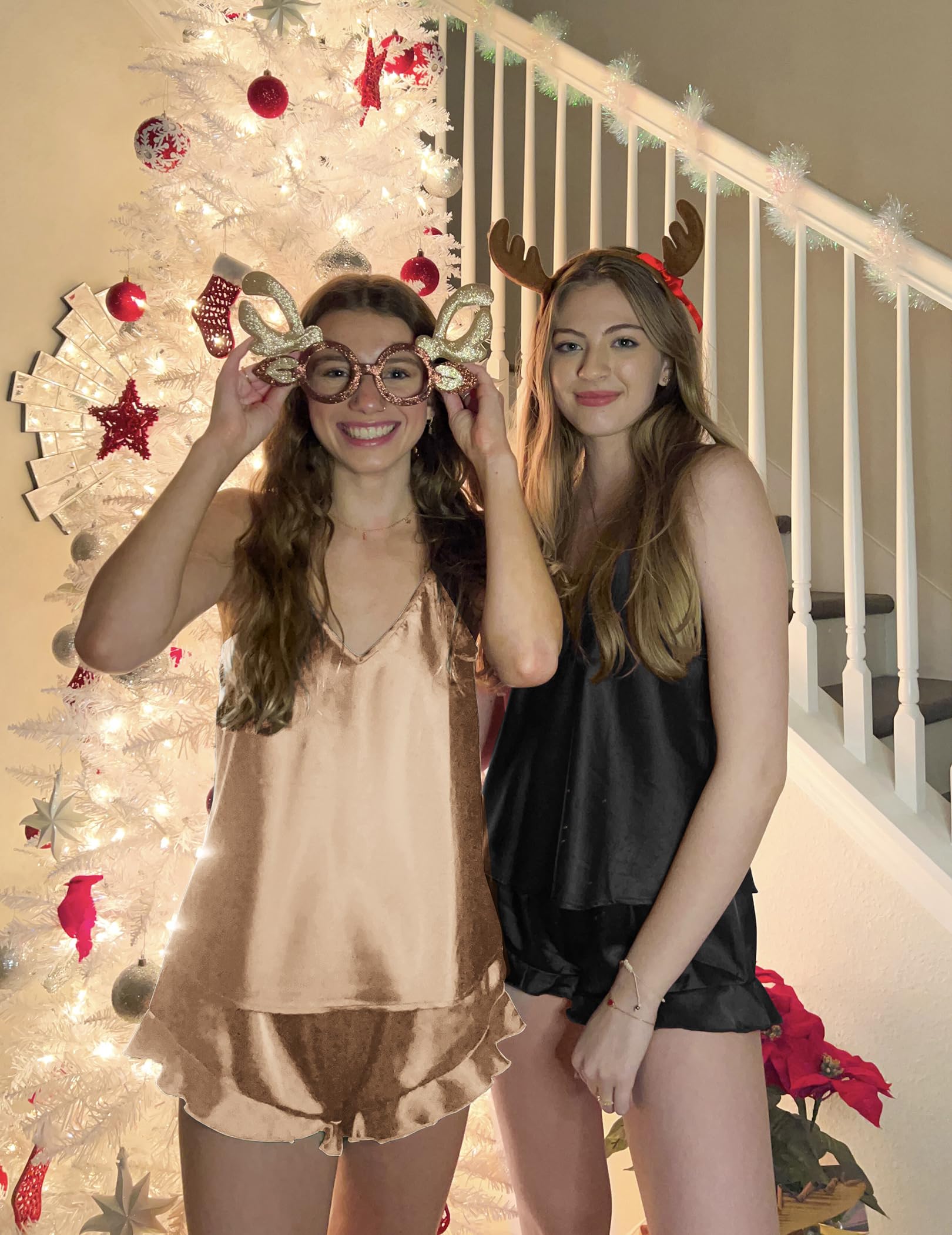 DESIGN&FEATURES: Silk camisole top: adjustable shoulder straps, V-neck, racerback. Bottom: ruffle hem booty shorts, high stretch elasticated trousers. The cute nightwear set with popular designs makes your family wander more comfortable and elegant.