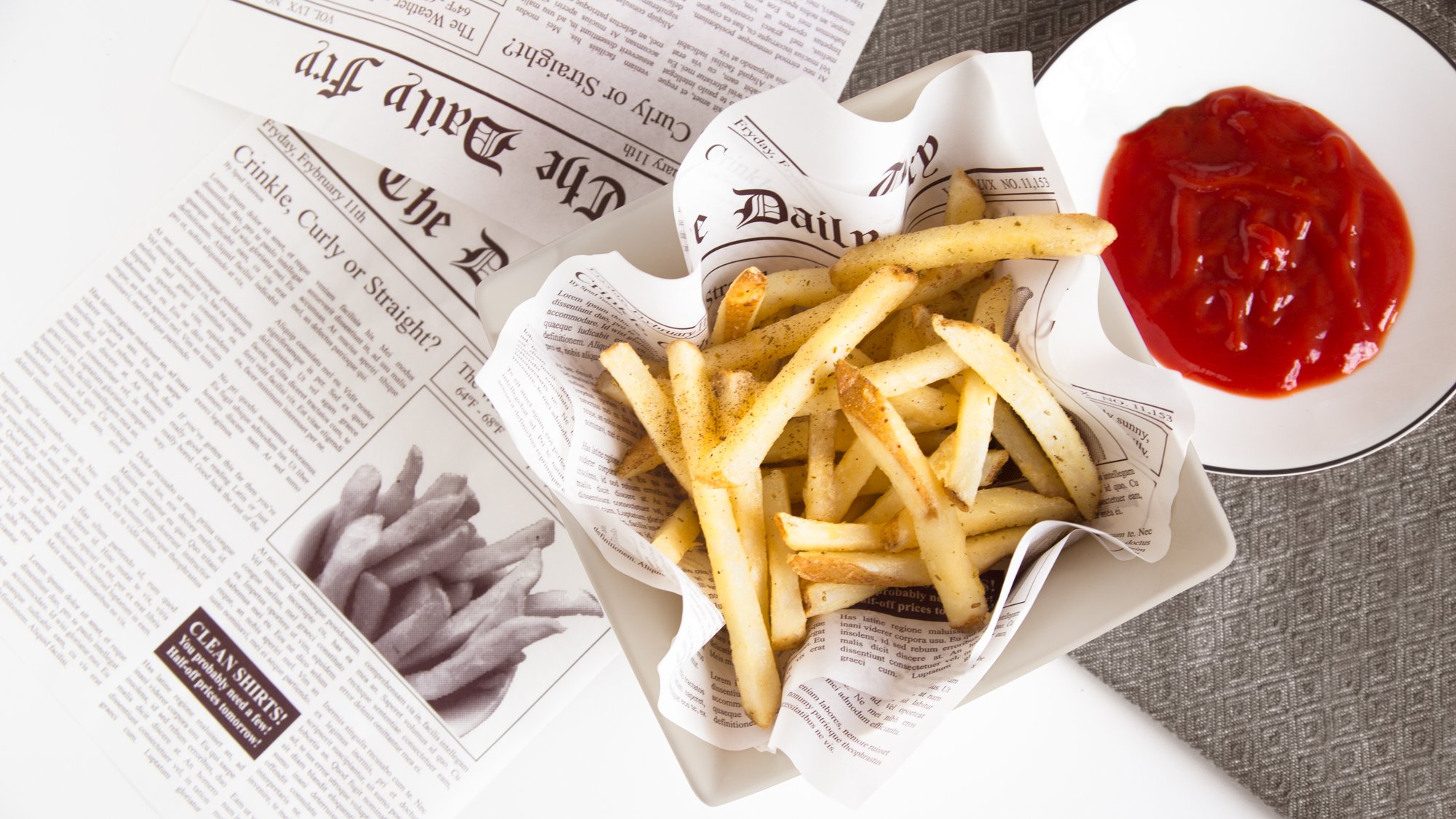 Whether it's an evening dinner inside at the kitchen table, a breezy lunch-time picnic, or a barbecue on a hot summer day, serve your food in style! Designed to be placed in the bottom of a fry or sandwich basket, these wax paper liners will help soak up the grease from your favorite pub foods. Featuring a fun newsprint design, this pack of 24 disposable liners will make both serving your guests and cleaning up afterwards a breeze. Everyone will love reading the news of the "The Daily Fry" printed on the liners while enjoying their favorite snacks. Perfect for french fries, burgers, hot dogs, chicken fingers, sandwiches, potato chips, pretzels, and more! The liners can also be easily rolled and shaped for use in a french fry stand cone. Serve and entertain easier.