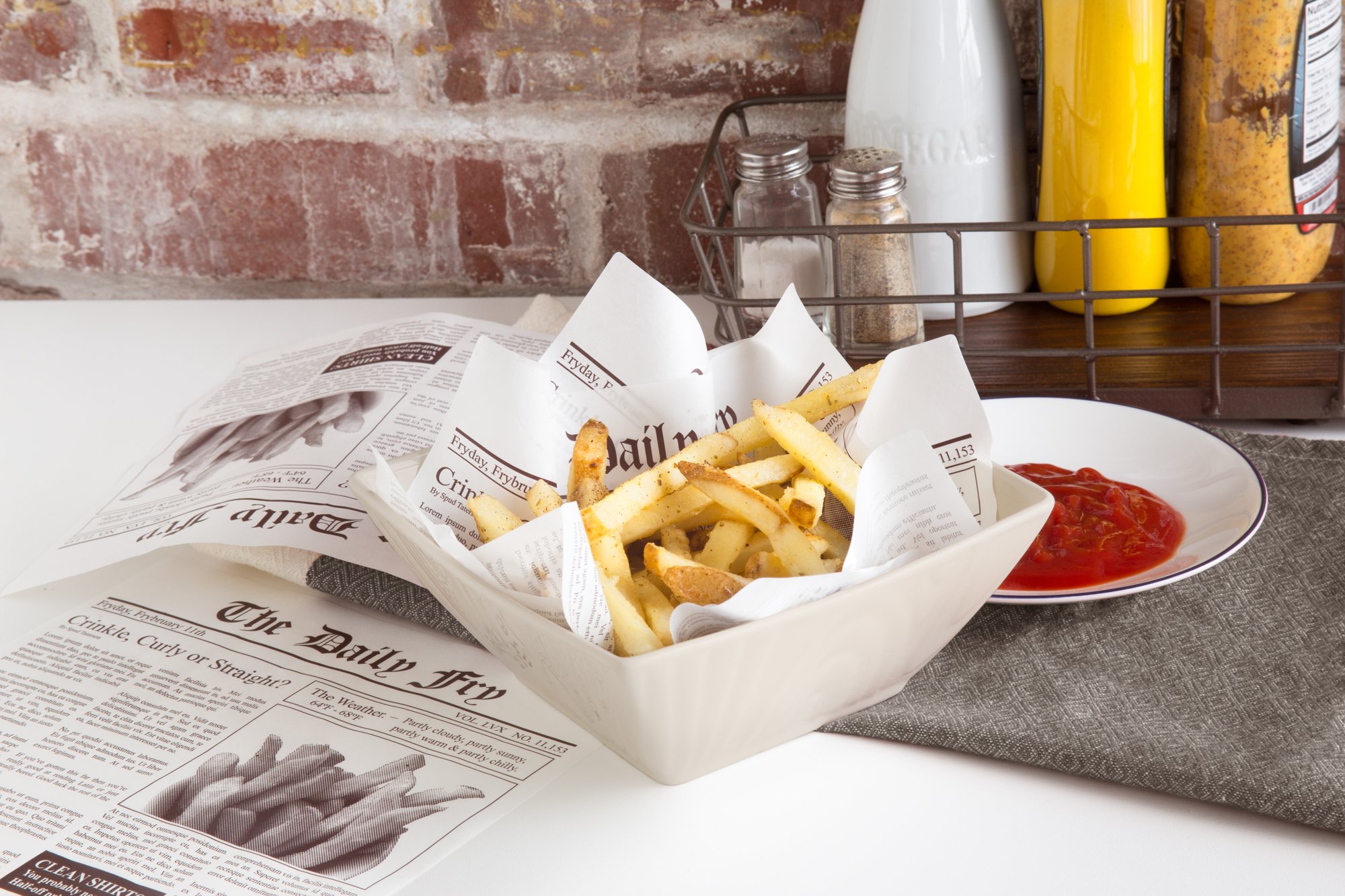 Designed to go in the bottom of a french fry or sandwich basket