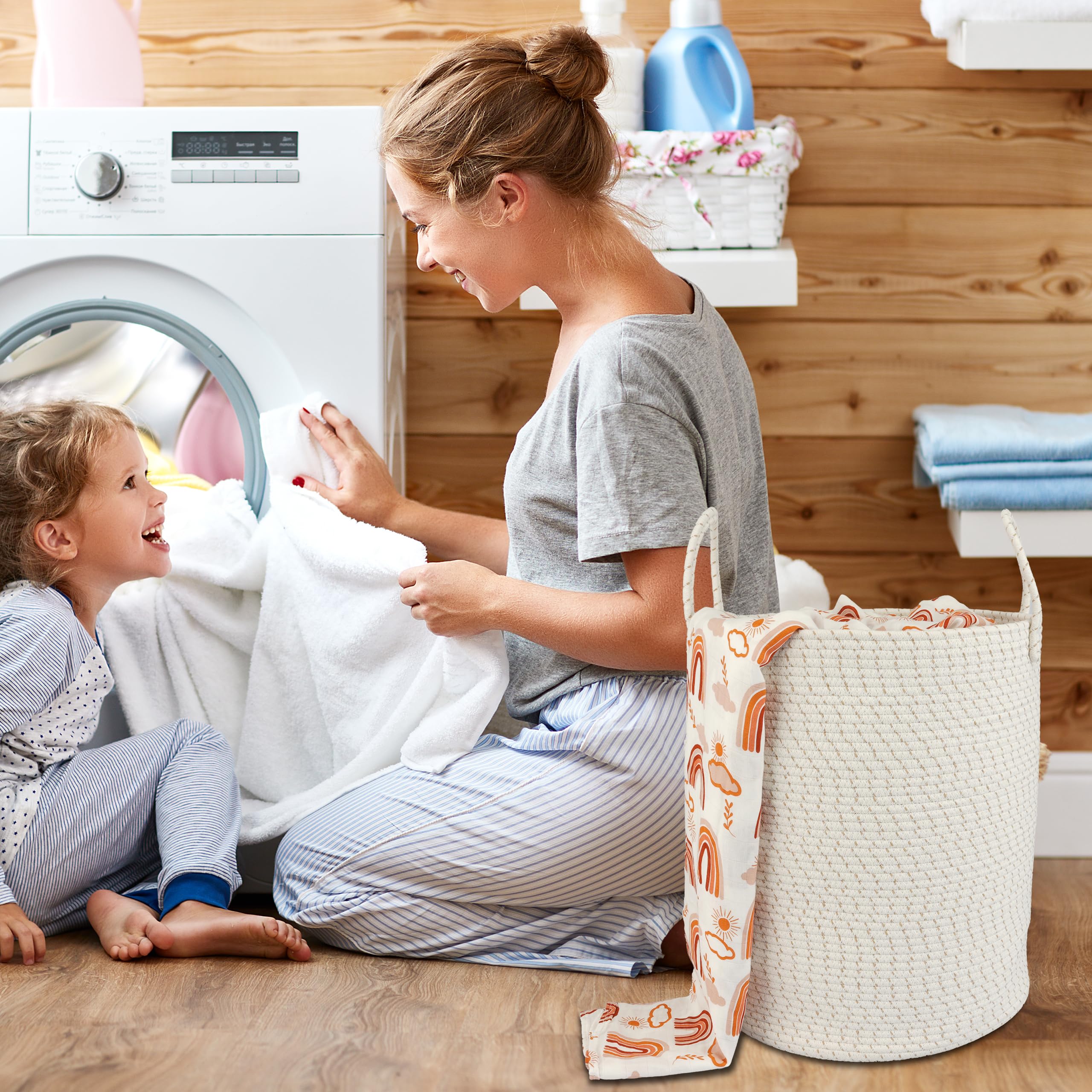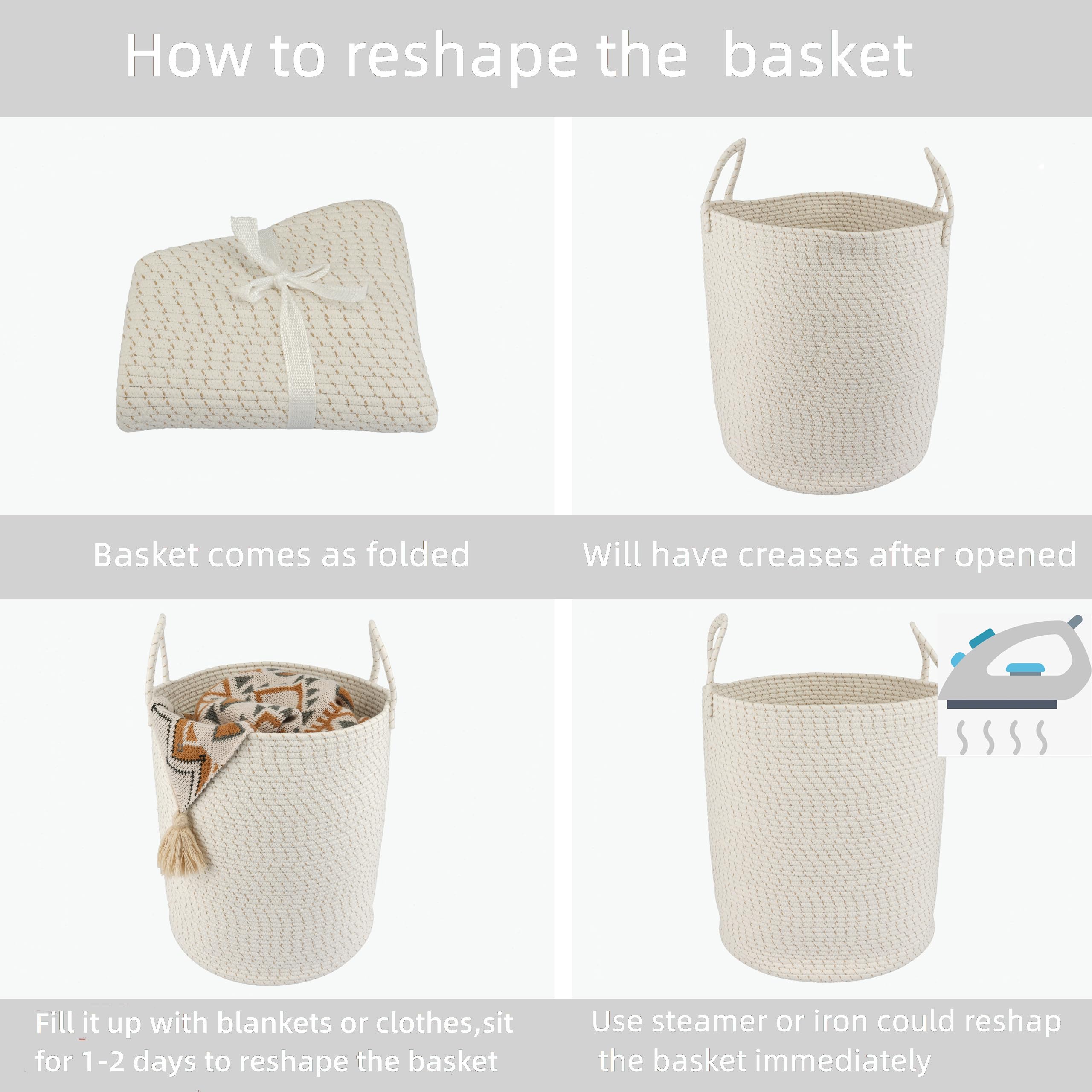 Note: Laundry basket comes folded and may have creases. Fully filling the laundry hamper with towels or clothes and waiting for 1-2 days will help reshape the laundry basket. You can also use steam or ironing to reshape the laundry basket. The rope hamper is machine washable. If machine washing the laundry hamper, please put it in a wash bag for delicate and air dry it.
