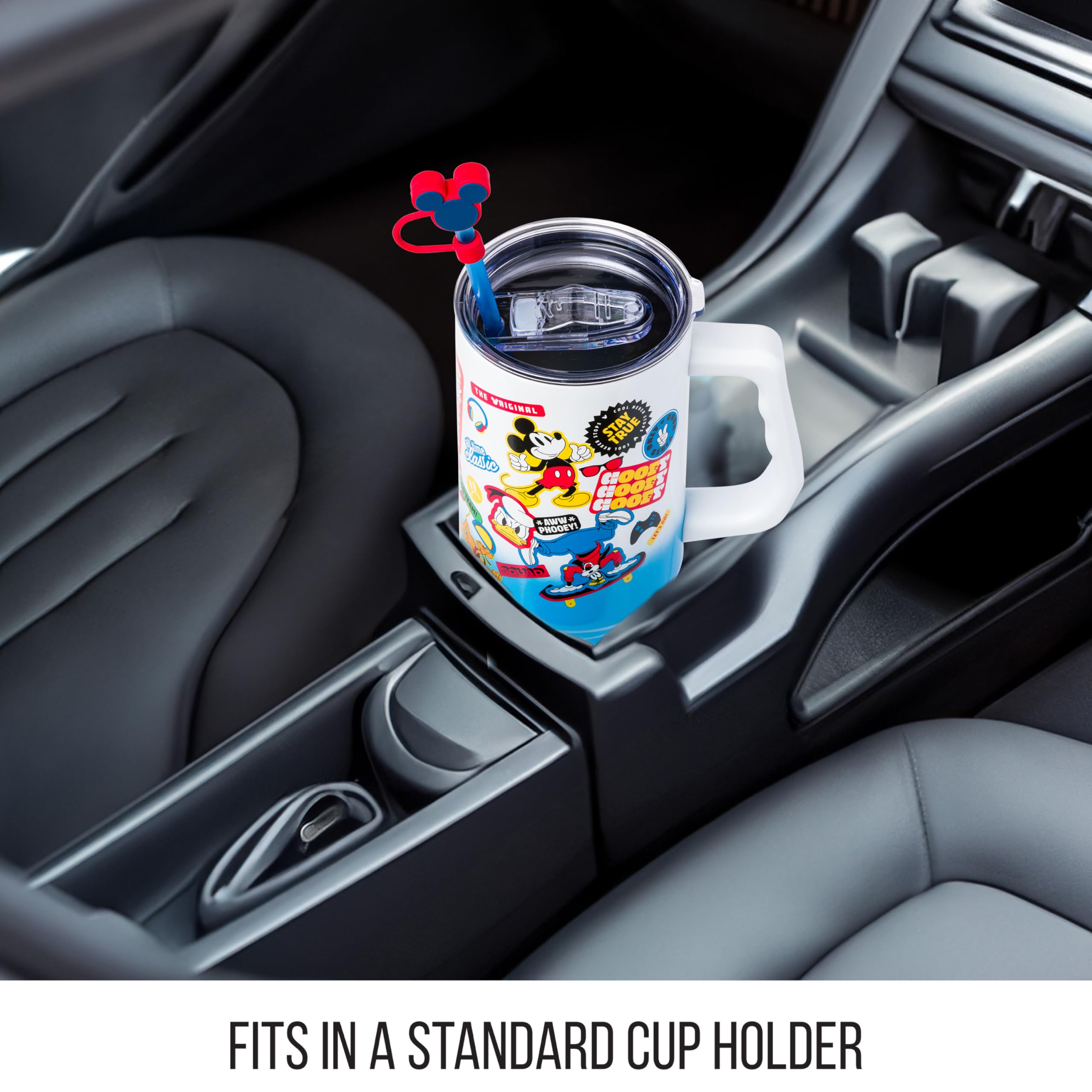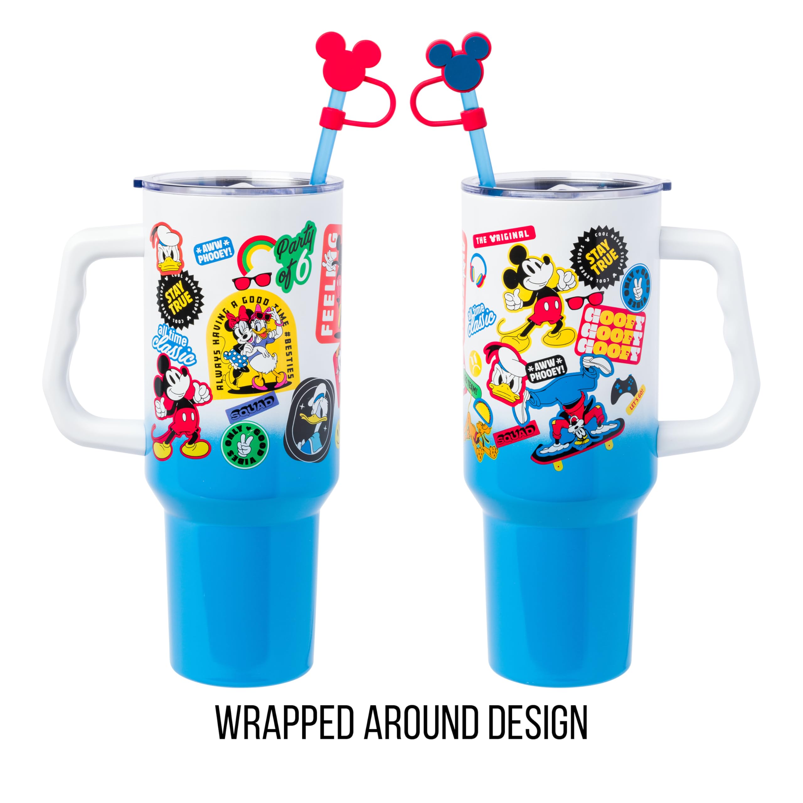 FUN DESIGN AND MATERIAL: Features a bold ombre background with Mickey Mouse and Friends in playful sticker-style art; made from stainless steel and holds 40oz with handle and secure lid.