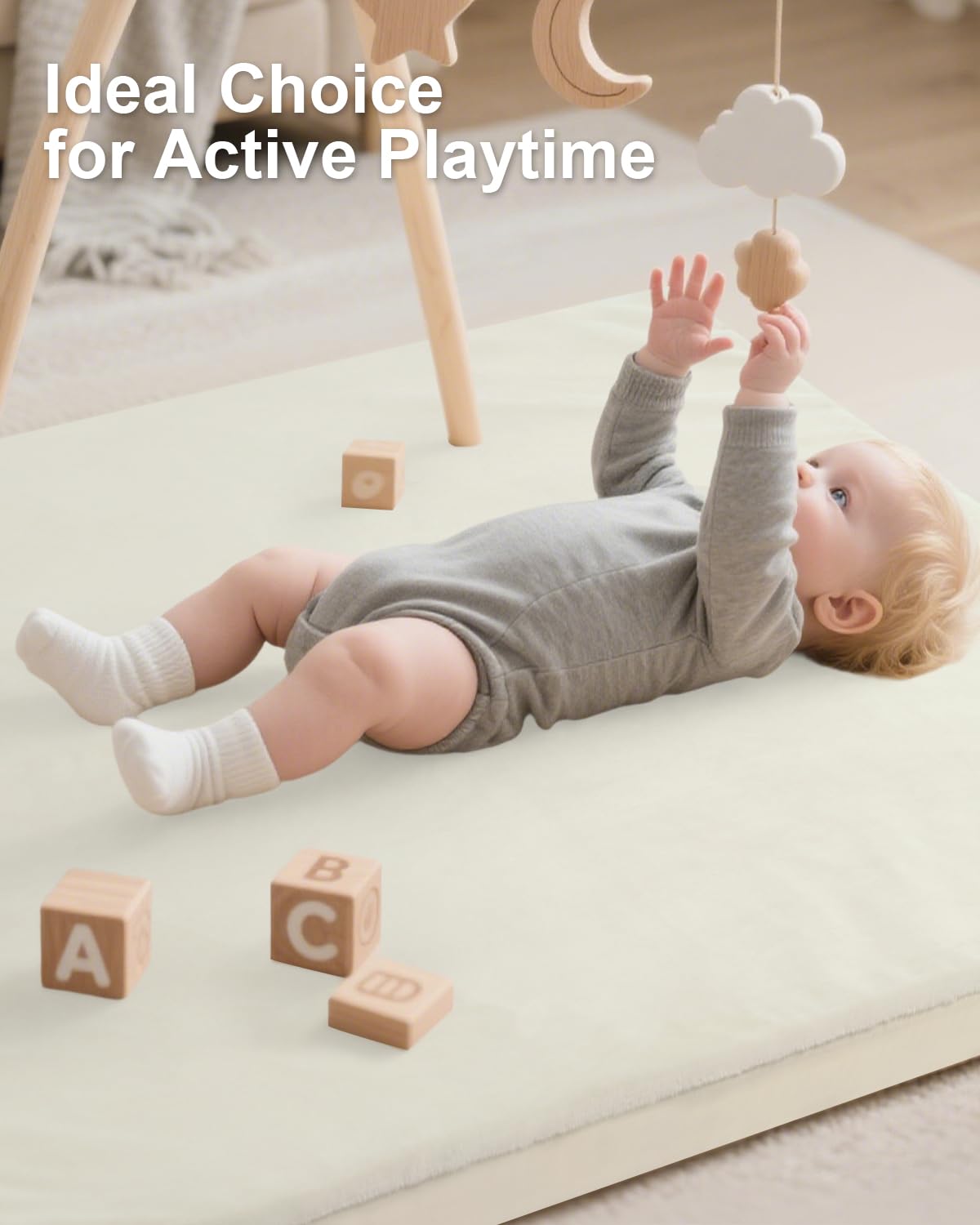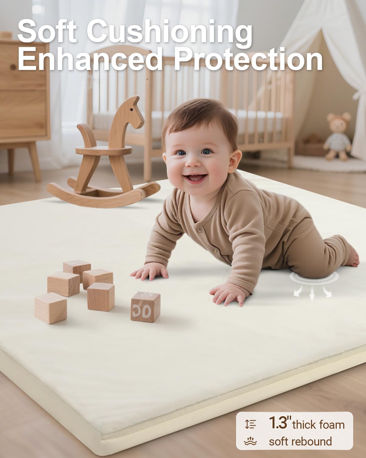 Stylish Design for Multi- Scenarios Use: This Baby mat comes in 3 colors, beige, grey and green. Beige mats appears as soft white-beige in natural light,versatile and warm, fitting various home decors;The mat size is 50x50 inches, which can perfectly fit 50x50 inches baby playpen, you can also use it in tents, playrooms, bedrooms, living rooms, and even outdoors. Size may temporarily exceed specs due to foam compression during shipping. Please allow 24-72 hours for full recovery. If the size still doesn’t meet expectations, feel free to ask for support—we’re happy to help!