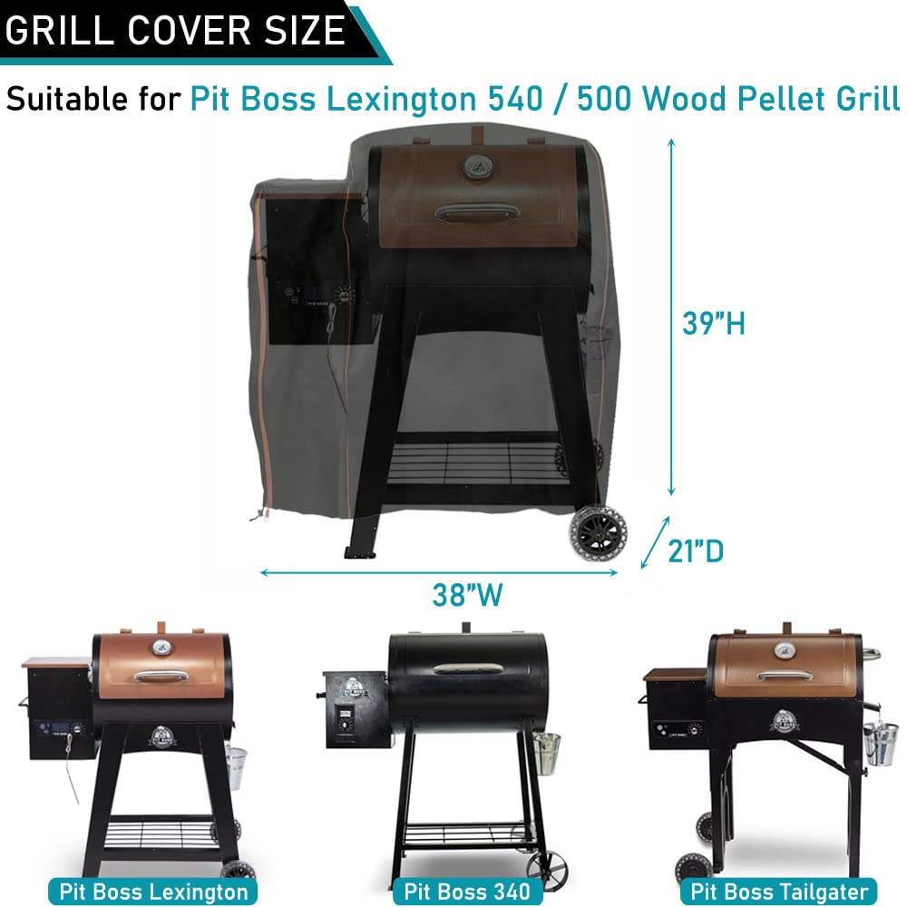 【Custom Fit】Measured 38"W x 21"D x 39"H. Custom fit for the Pit Boss Lexington PB500LXW1 / PB500LX1, Lexington Onyx PB500NX, PB340 / 340 Tailgater 340TGW1 Wood Pellet Grill, fits for Traeger 20 series wood pellet grills, fits for Rec Tec RT-340 and Rectec Road Warrior 340P Pellet Grill. Also fits other pellet grills with similar sizes.
