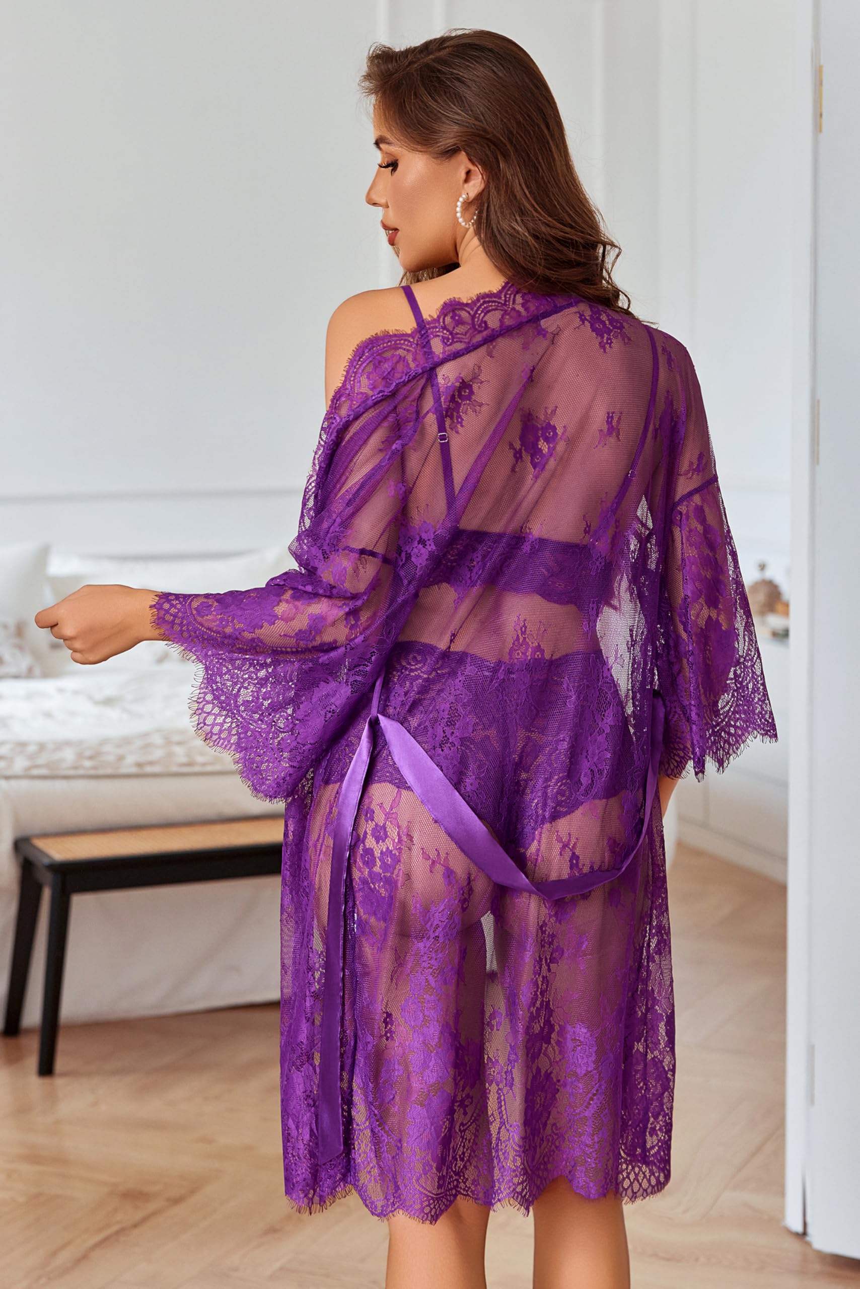Package Content: 3pack Floral Lace Lingerie Set With Mesh Robe (1 X Lace Robe,1 X Lace Bra,1 X Lace Panty,1 X Satin Belt).