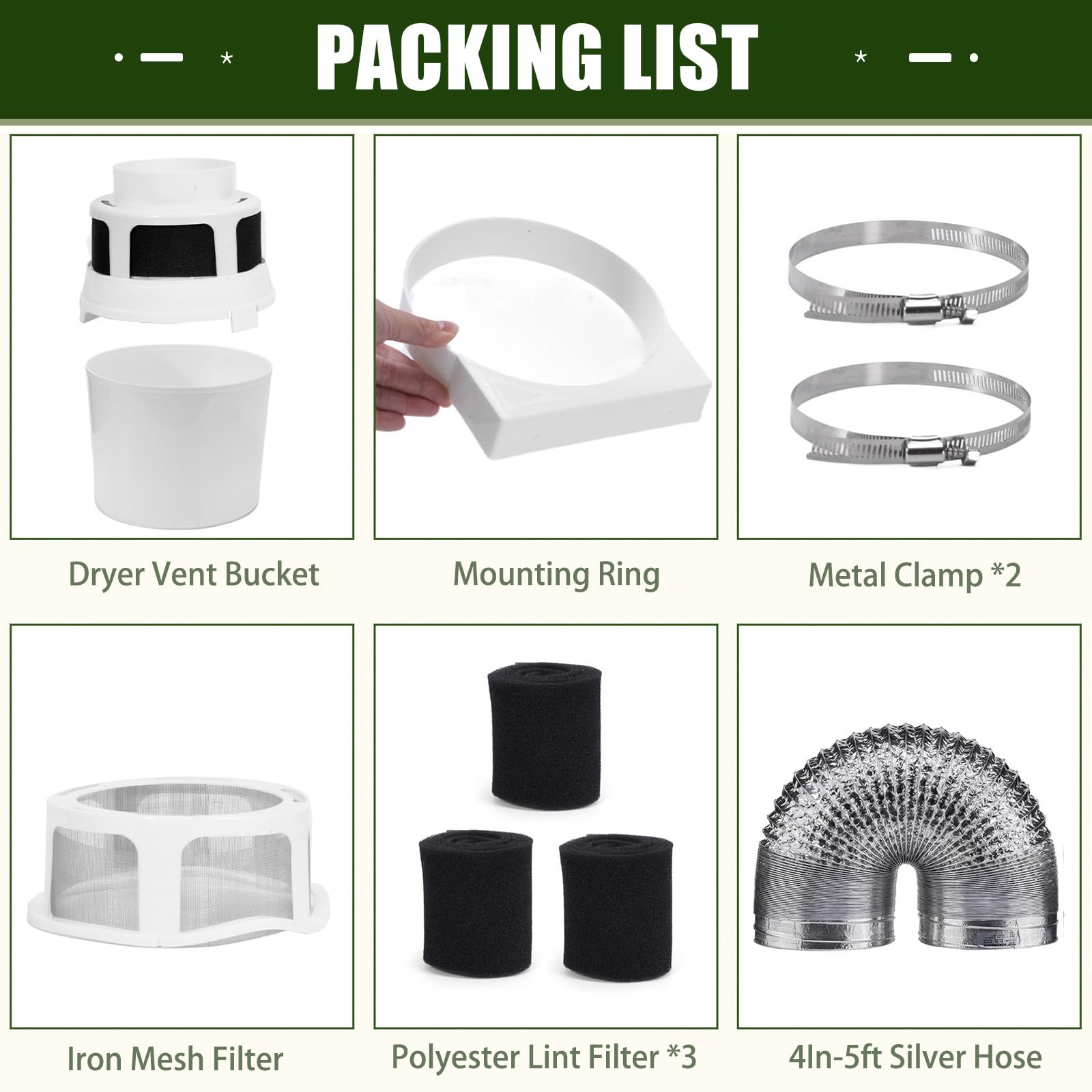 [Cost-effective kit Includes] - Dryer Vent Bucket *1, Mounting Ring*1, Metal Clamp*2, Iron Mesh Filter*1, Polyester Filter*3, 4in-5ft dryer vent hose*1