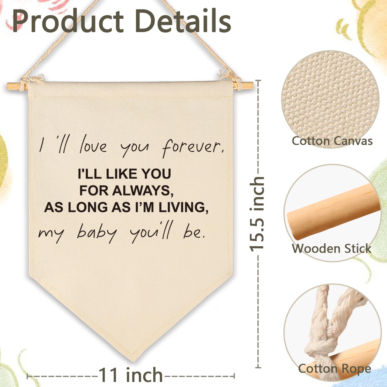 This natural beige cotton canvas banner features inspiring quotes or cute prints that add instant charm to a nursery, baby room, kid’s room, playroom, or above the crib. It hangs neatly with twine and a wooden stick, no assembly required, just open and hang. Durable and beautifully made,it brings a warm, unique touch to any wall decor and makes a thoughtful gift for baby kids, boys and girls, or your friend’s little ones.Perfect for baby shower, birthday,christmas,or any special day