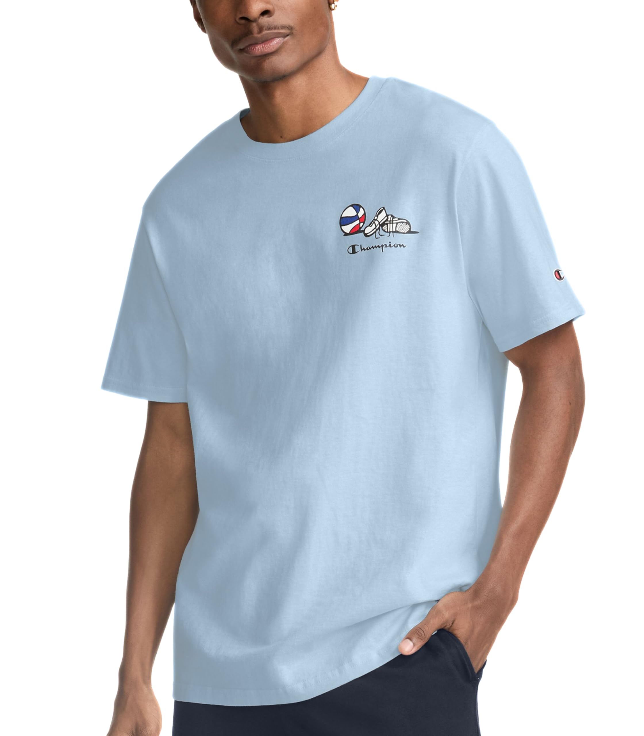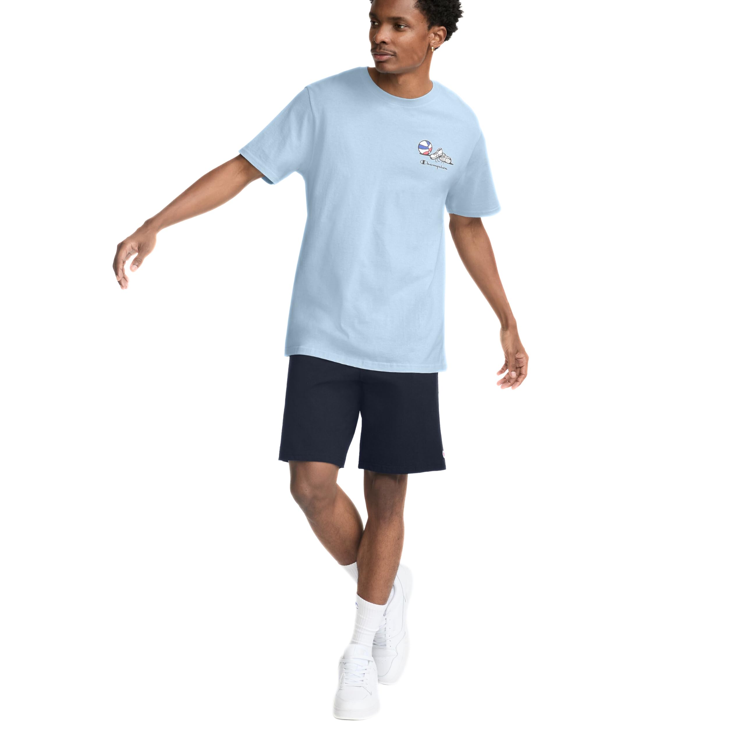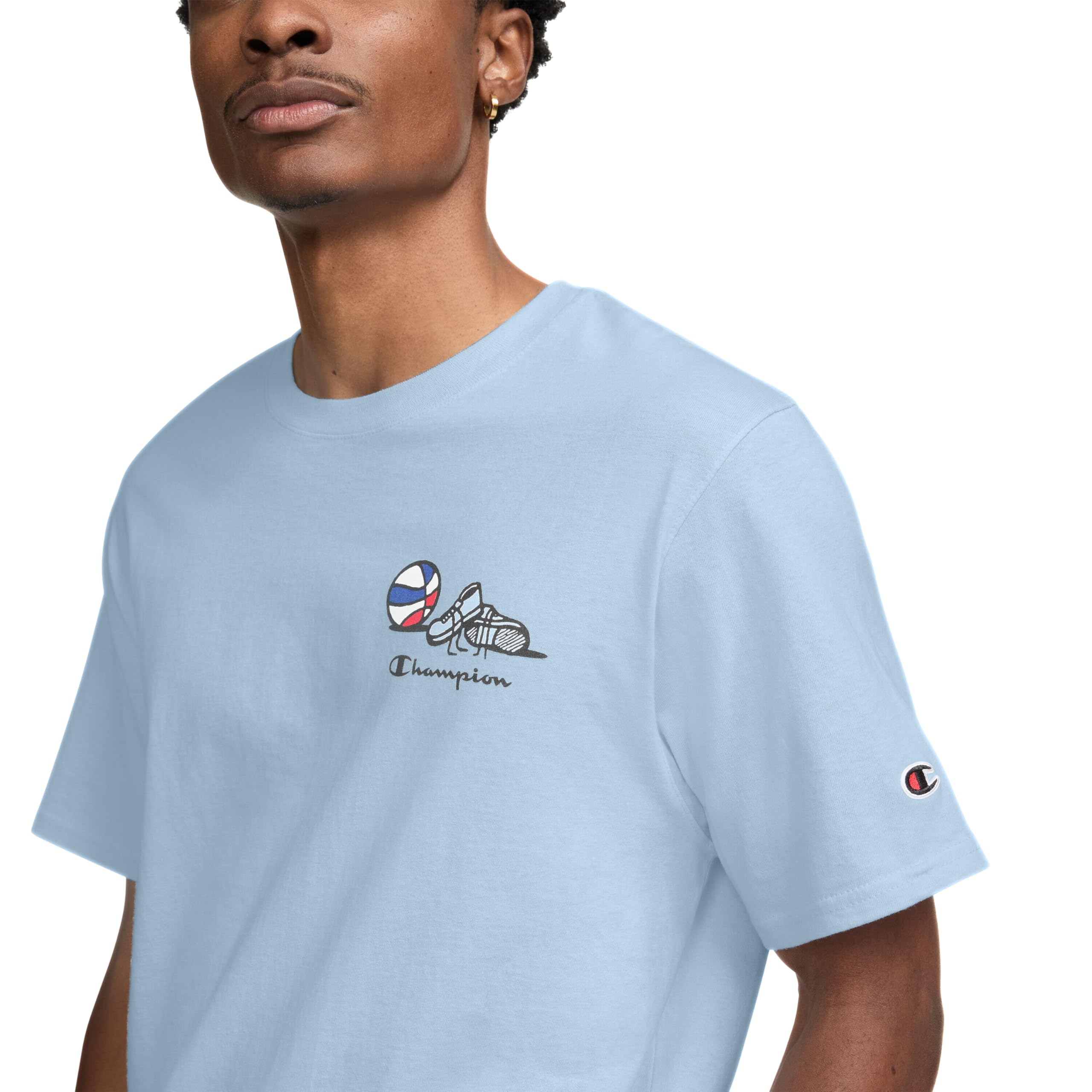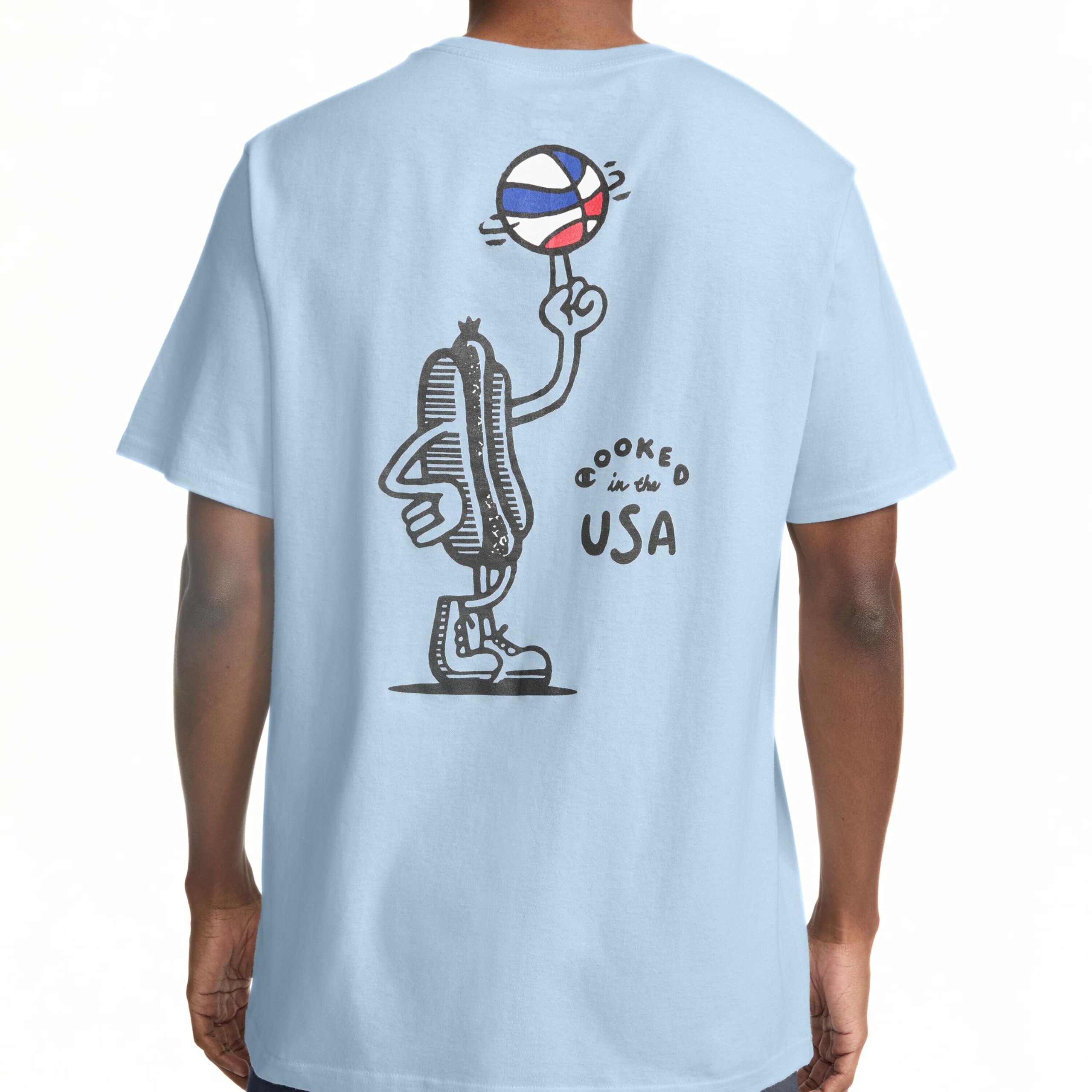 THE GRAPHIC - Shoes next to a basketball over Champion script on the left chest with a quirky hot dog twirling the ball that states "Cooked in the U.S.A" on the back.