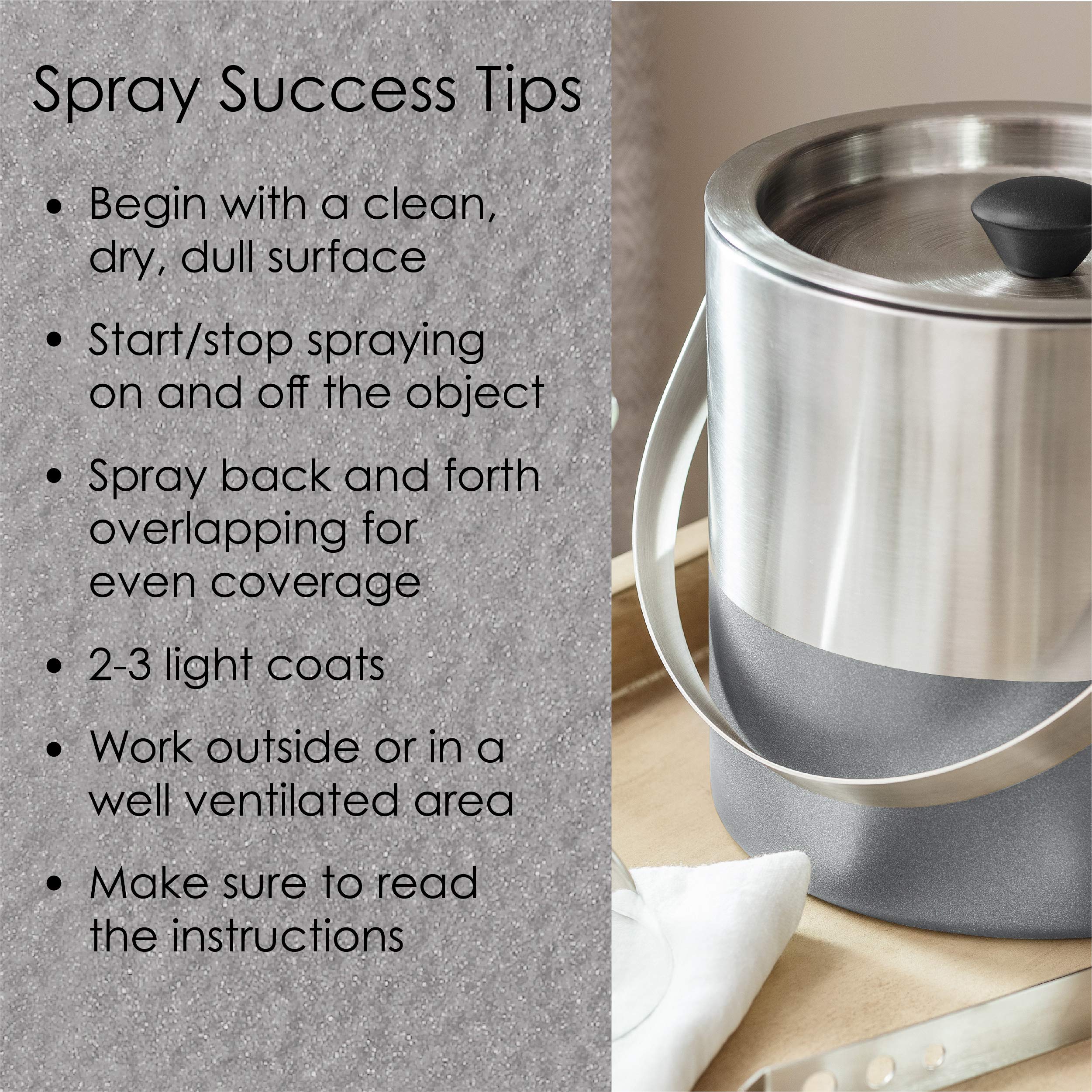 QUICK DRY – Best results when temperatures are 55° F to 75°F and humidity is below 60%. The spray paint adhesive is dry to the touch in 25 minutes, dry to handle in 2 hours.