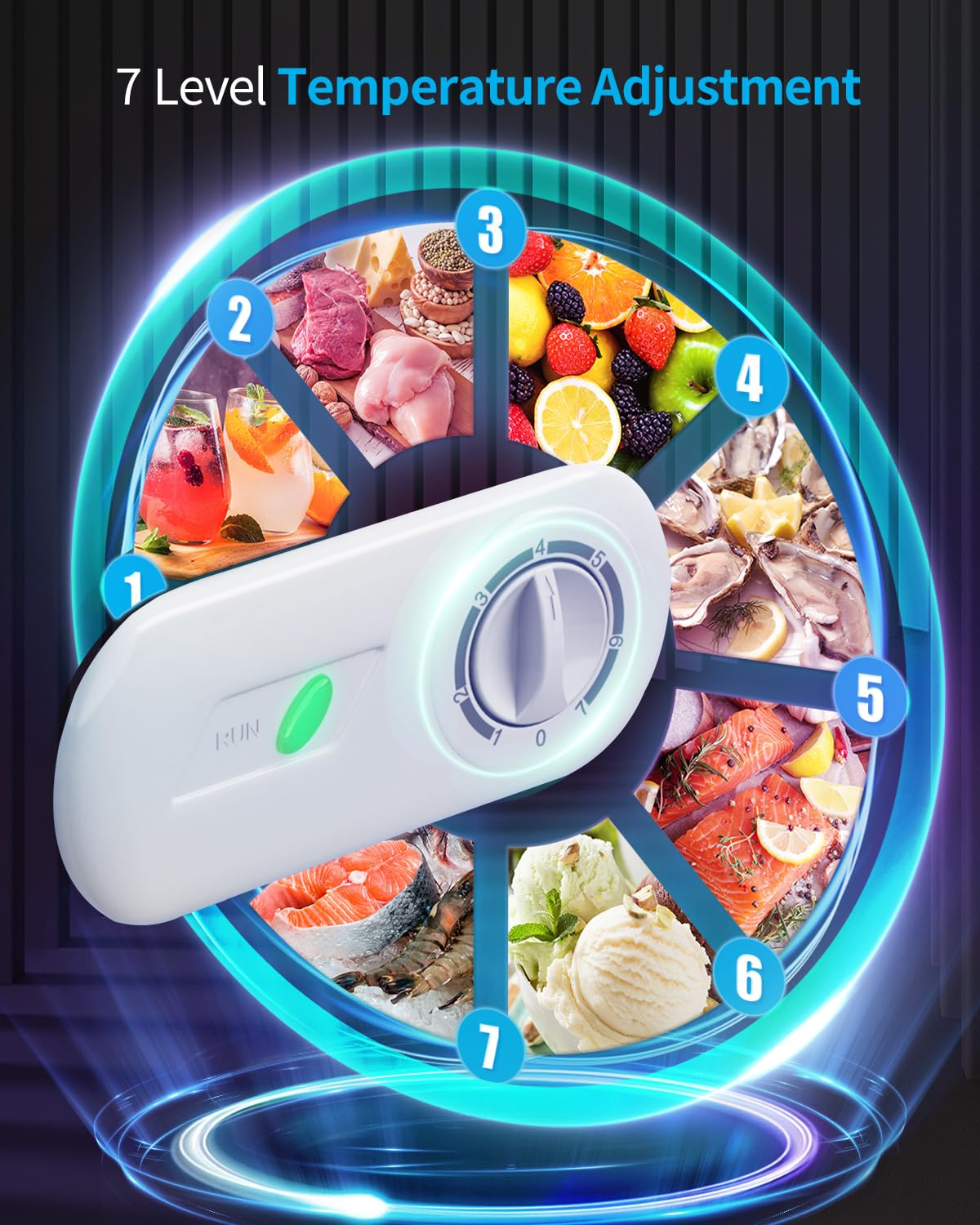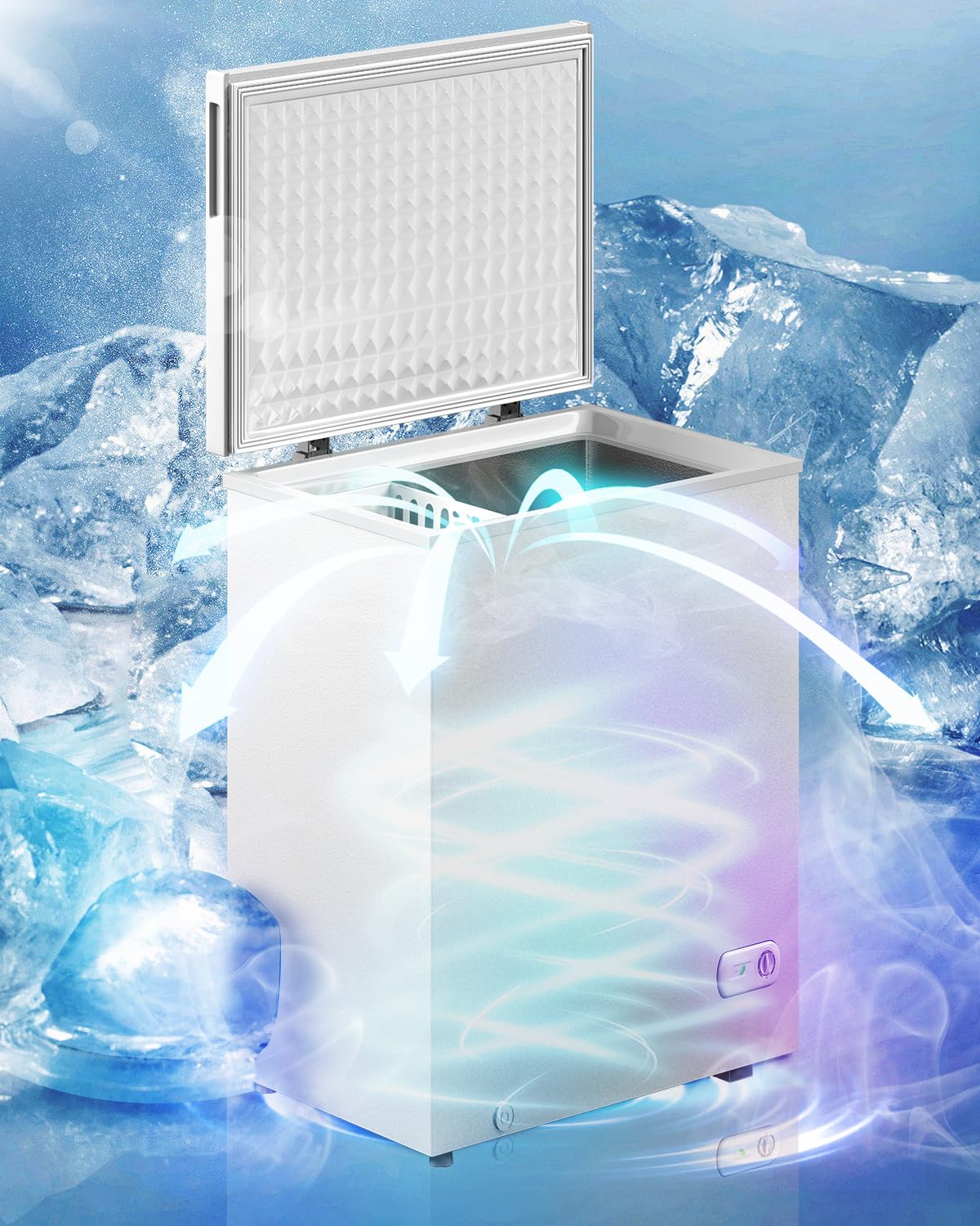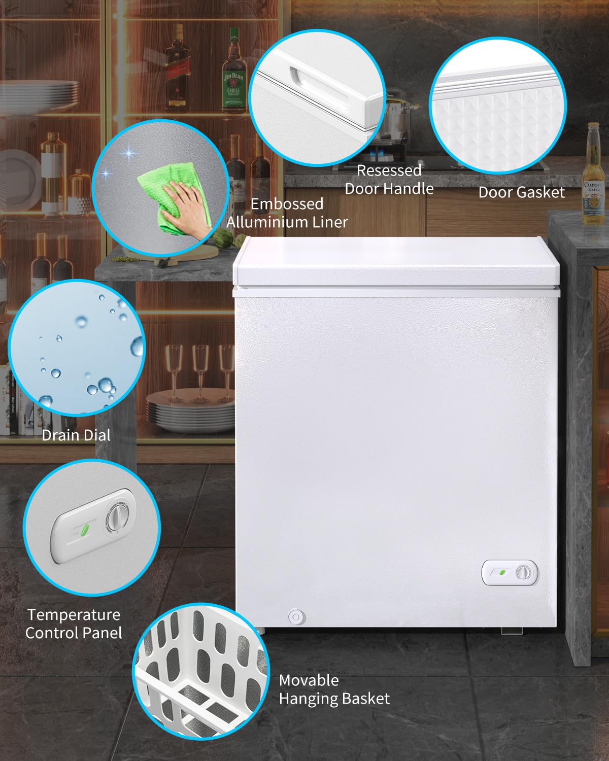 【Temperature Adjustable Control & Manual Defrost】The deep freezer is adjustable 7-level temperature control at the front of chest freezer. It can be controlled from - 7.6 ° F to 6.8 ° F (- 14 ° C to - 22 ° C). The higher the water level, the lower the temperature. Features with the Manual Defrost design, our chest freezer keeps your food fresher.