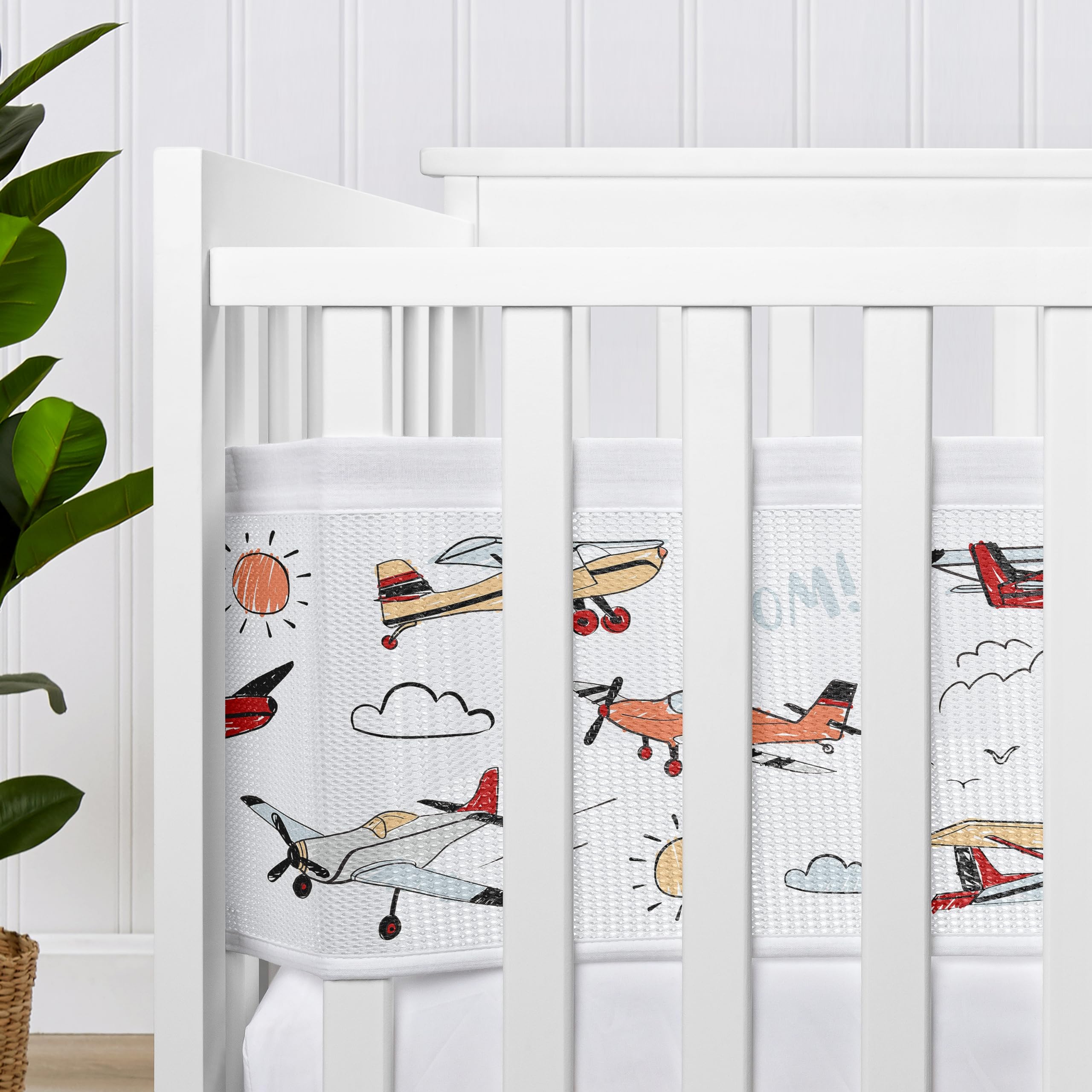 This mesh crib liner features a vintage airplanes transportation air plane clouds sun sky aviator aviation print with complimentary color palette from the matching Sweet Jojo Designs Airplane bedding collection of grey, yellow, orange, gray, red white and blue.