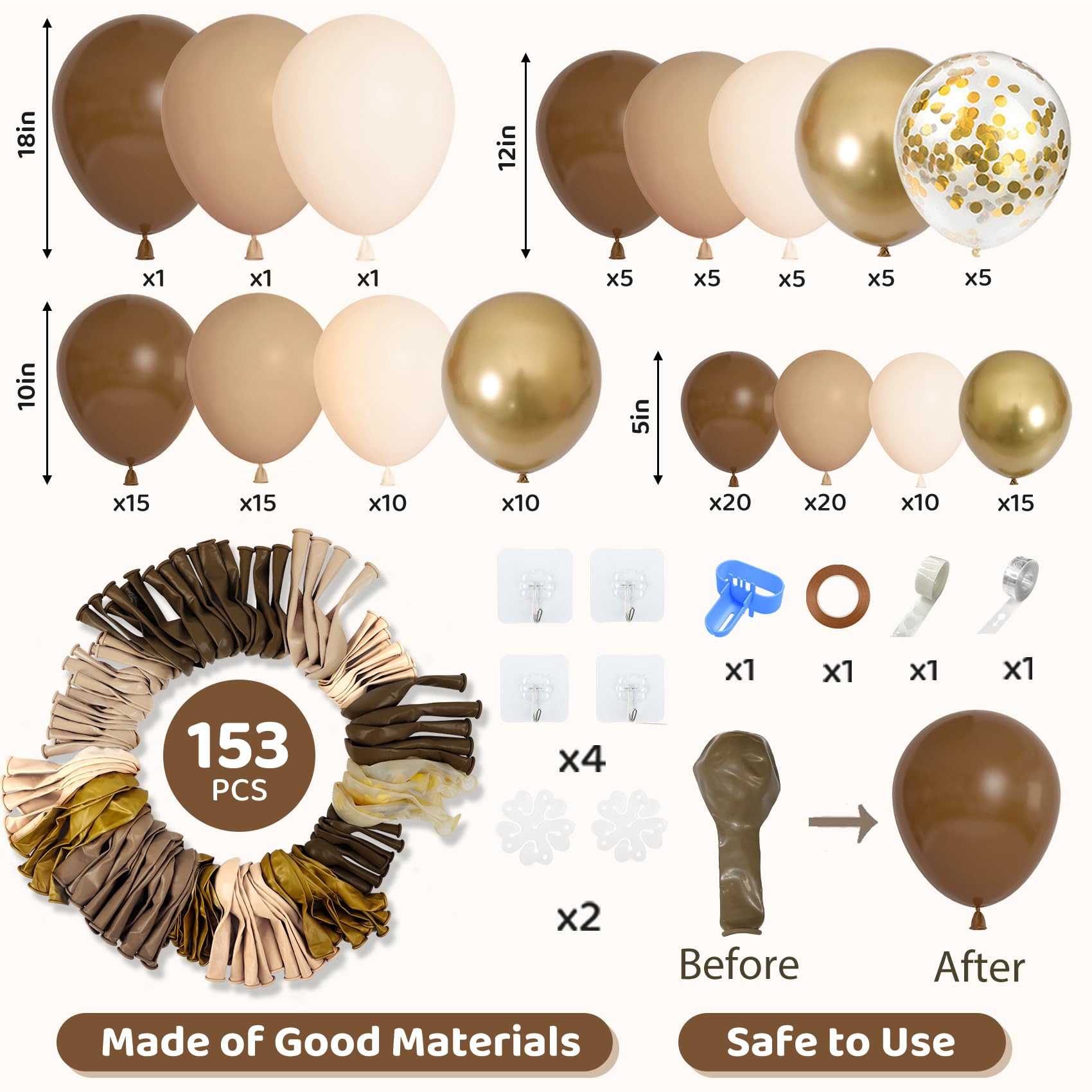 Sufficient Quantity of Brown Balloons: The brown balloon arch kit includes 18” brown/coffee brown(It's coffee brown after inflation, slightly greenish brown before inflation.)/nude balloons(3 pcs), 12” brown/coffee brown/nude/metallic gold/ confetti gold balloons(25 pcs), 10”brown/coffee brown/nude/metallic gold balloons(50 pcs), 5”brown/coffee brown/nude/metallic gold balloons(65 pcs) and 10 pcs balloon tools(balloon arch strips, tying tool, 100 glue points, ribbon, flower balloon clip, hook)