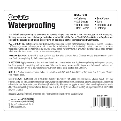 Star brite Waterproofing restores water repellency to virtually all marine fabrics from boat covers to bimini tops. It is also the easiest, most effective way to waterproof car covers, tents, tarps, foul weather gear, convertible tops and more. Star brite Waterproofing is also great for use on new fabrics, greatly extending their service life by providing an additional barrier to moisture and damaging UV rays. It’s easy to use; simply spray the fabric to be restored, and allow it to dry for 6 hours before use. Always apply Waterproofing outdoors, taking care to not breathe the solution. Waterproofing is safe for use on all premium marine fabrics.