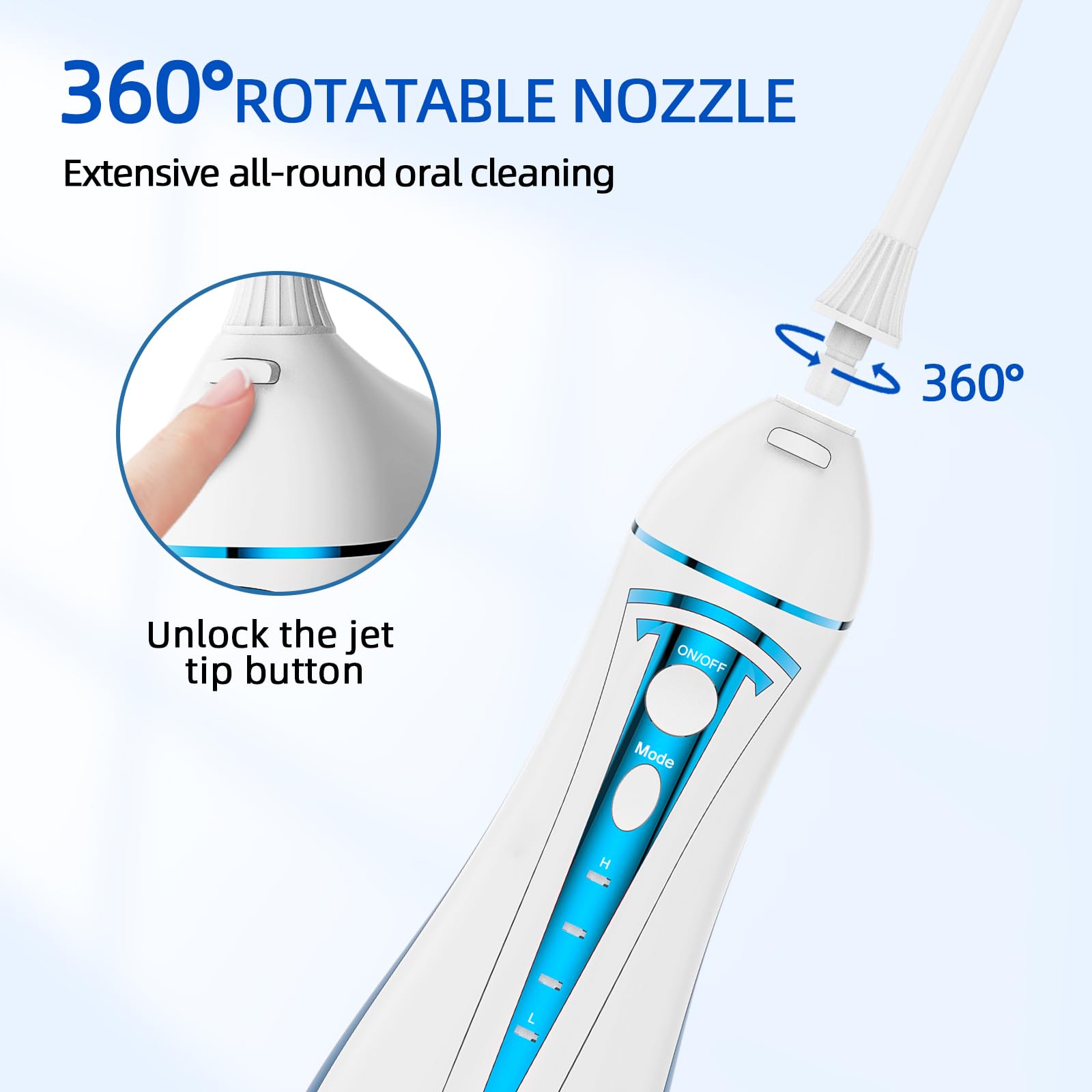 【Upgraded 300ml Extra-Large Water Tank】This water dental flosser features an upgraded 300ml water tank, it is enough for a 45 seconds full mouth clean. No need to refill or pour out the remaining water and make your oral cleaning more convenient and efficient