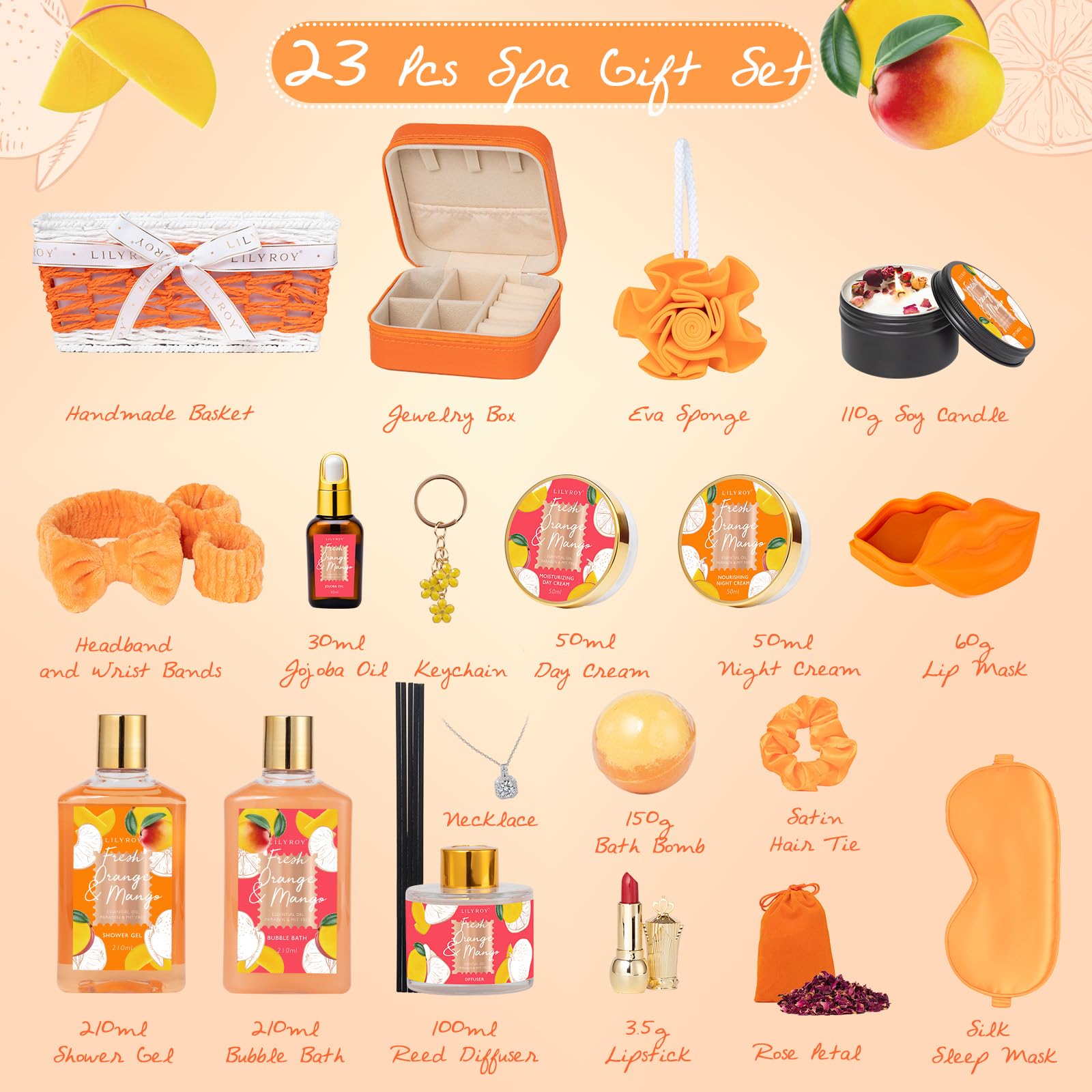 23PCS SPA GIFT BASKET: Shower Gel, Bubble Bath, Diffuser Oil, Soy Candle, Jojoba Oil, Bath Bomb, Day Cream, Night Cream, EVA Sponge, Lip Mask, Dry Flower, Necklace, Keychain, Satin Hair Tie, Headband, Wrist Bands, Silk Sleep Mask, Jewelry box, Reed Diffuser Stick packaged in a nice beautiful basket. The spa gift baskets for women offer the most luxurious and perfect bath experience