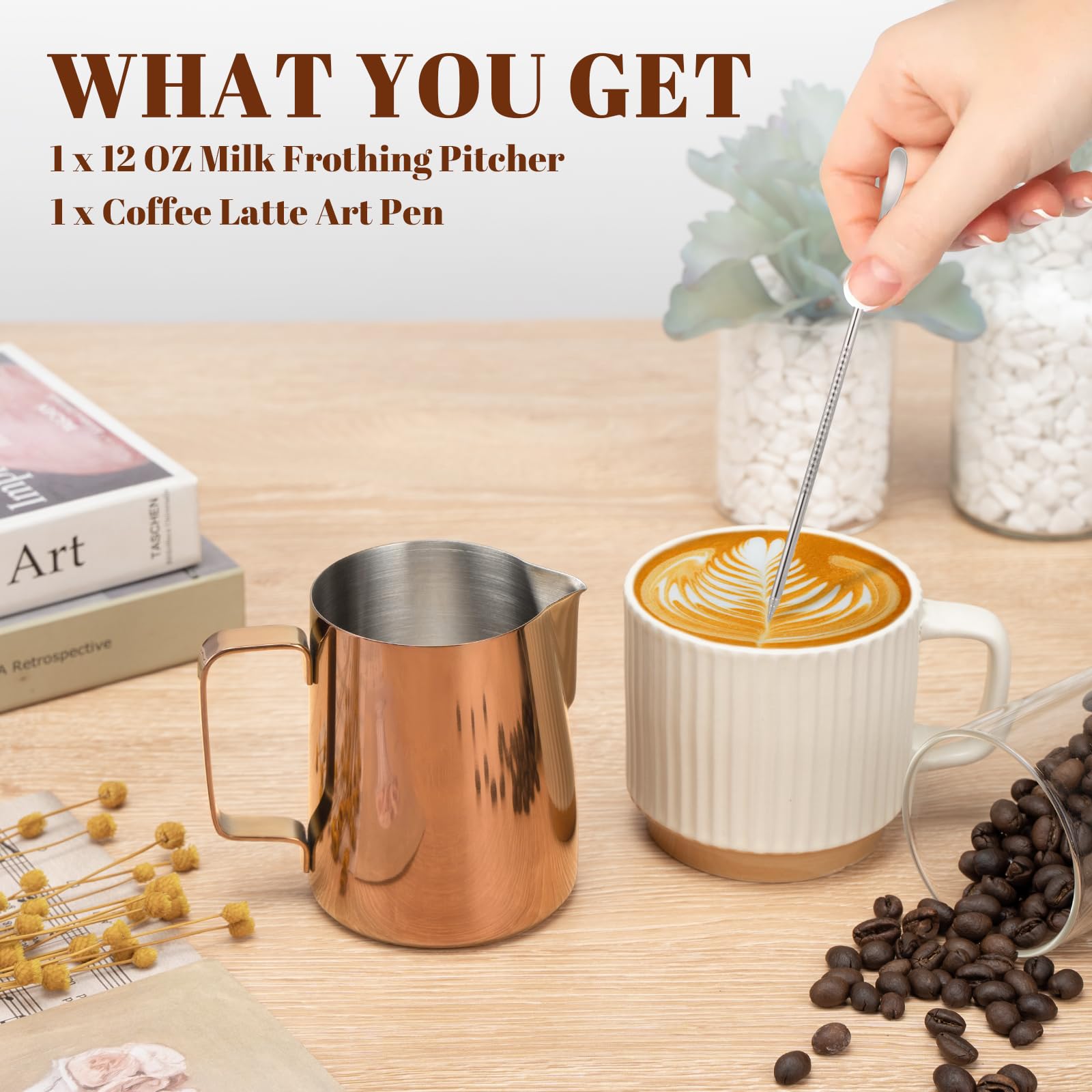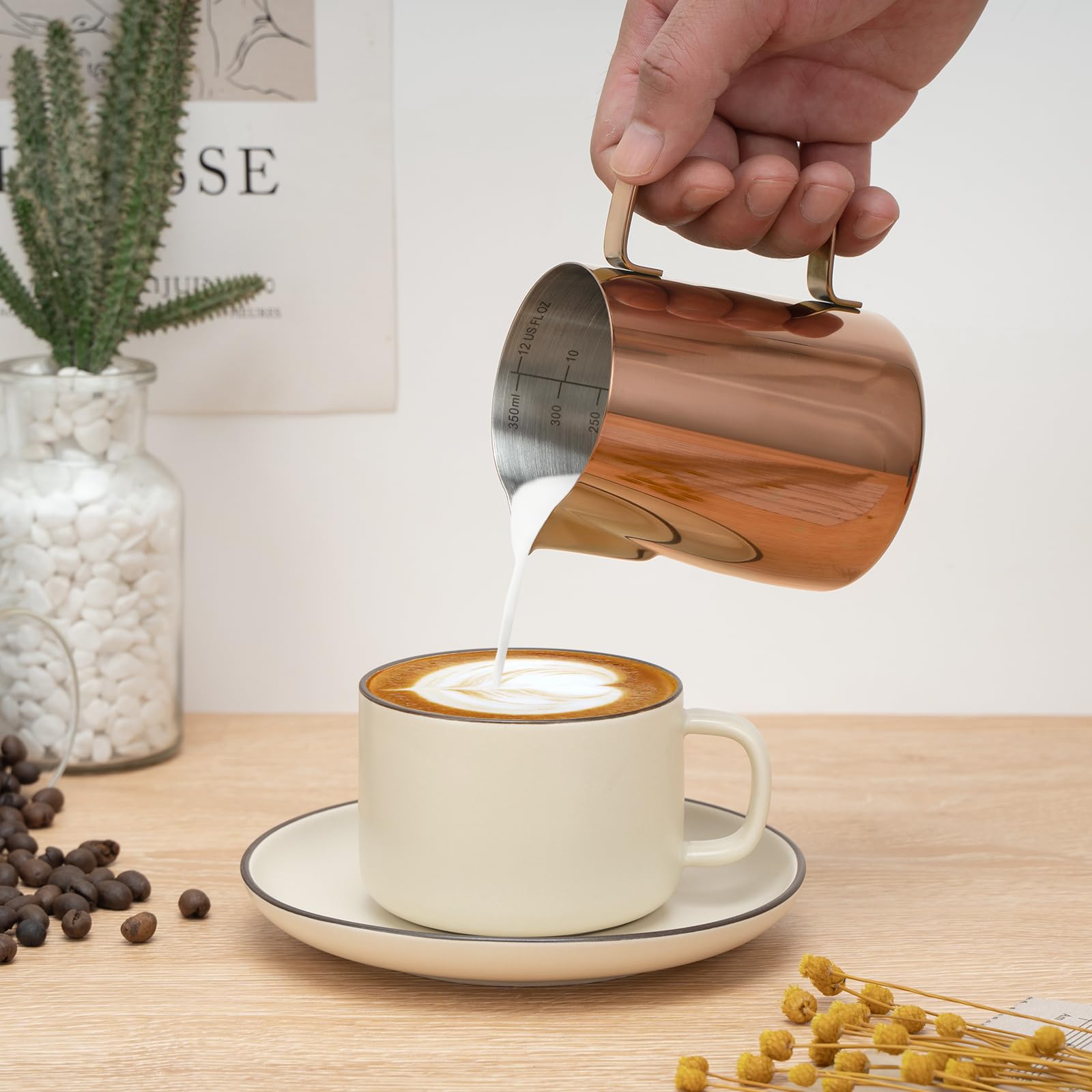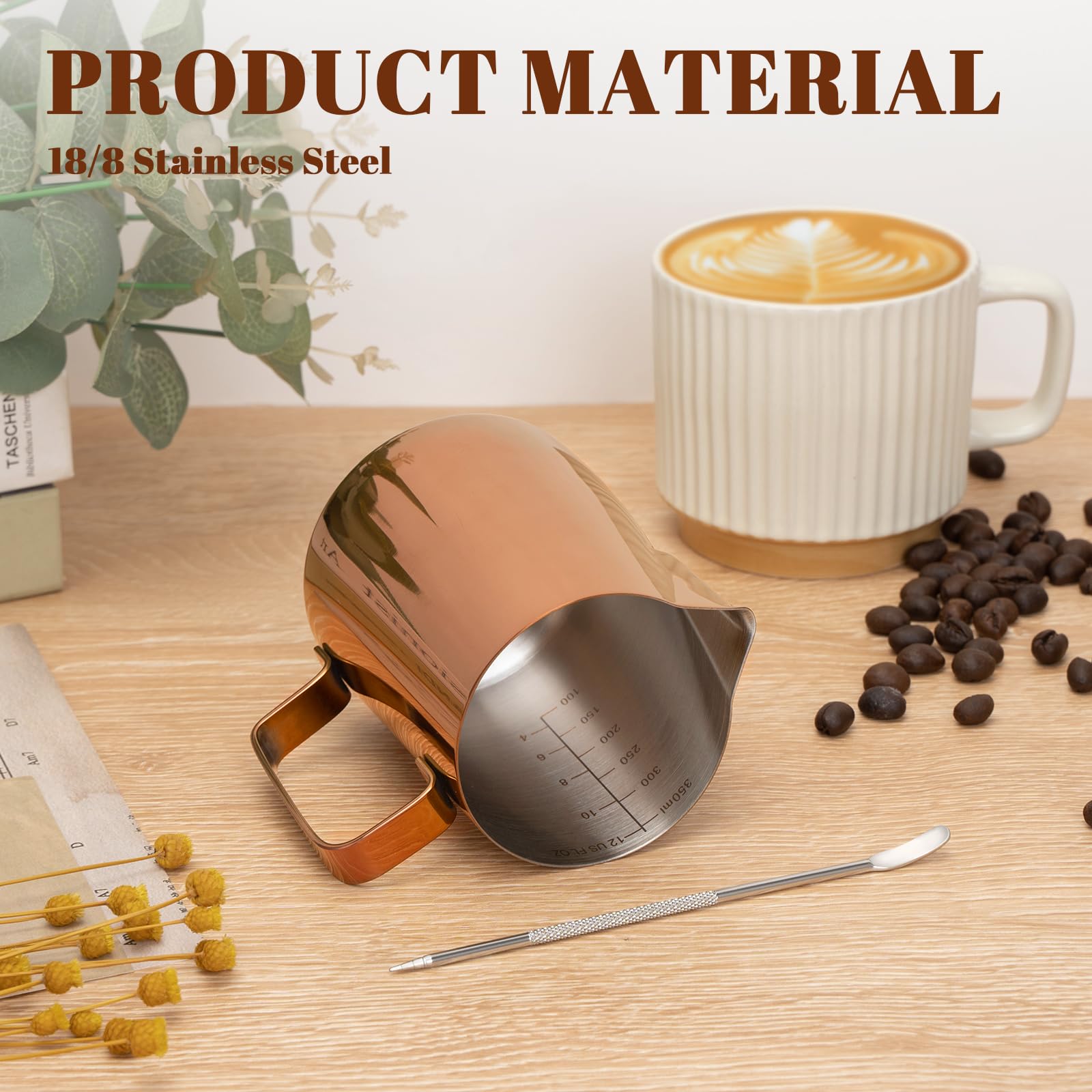 COMFORTABLE HANDLE: The handle of the milk frothing cup is ergonomically designed, with rounded top and bottom corners; easy to gripping and use, allowing you to make beautiful coffee art patterns with your hands