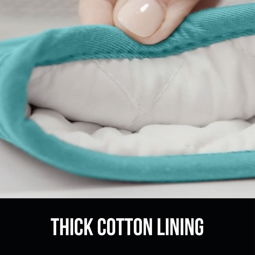 THICK COTTON LINING THROUGHOUT: stay comfortable while you cook; soft cotton lining offers additional protection and comfort, and feel simply amazing; plus, silicone is flexible and conforms easily to your unique grip