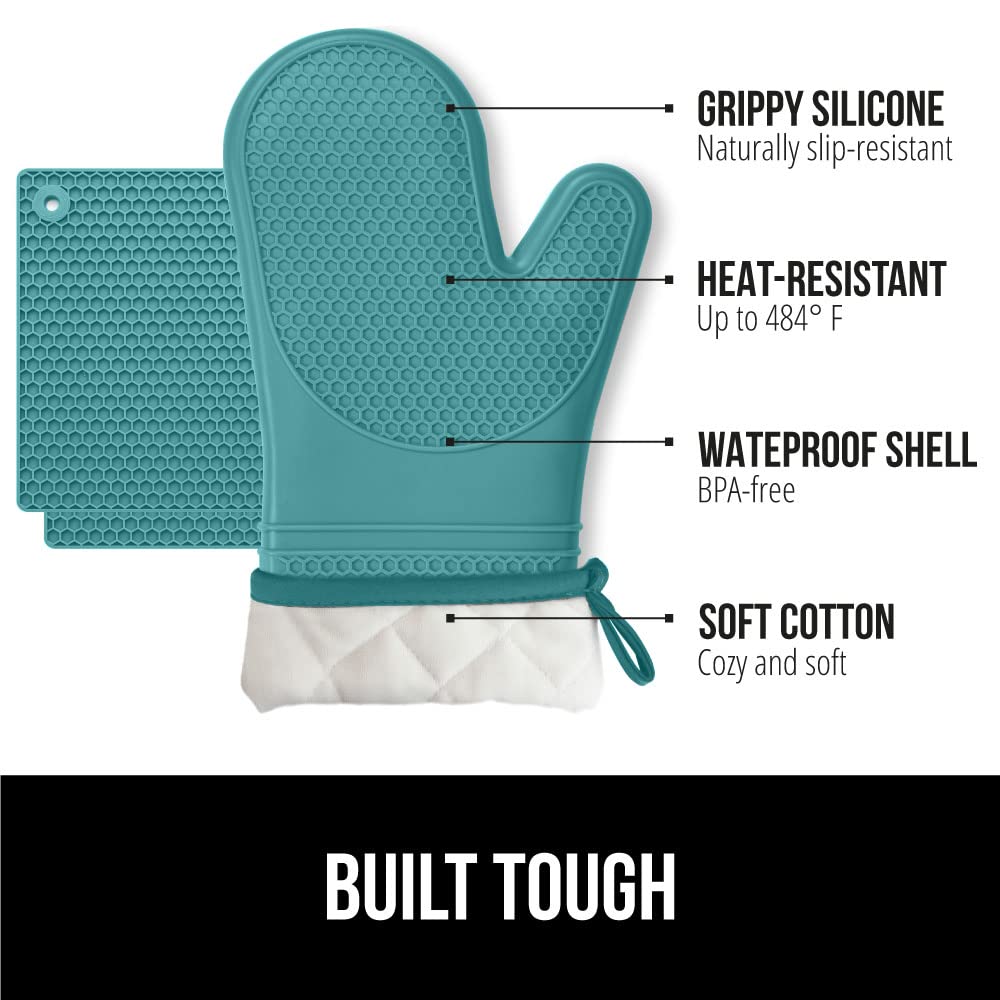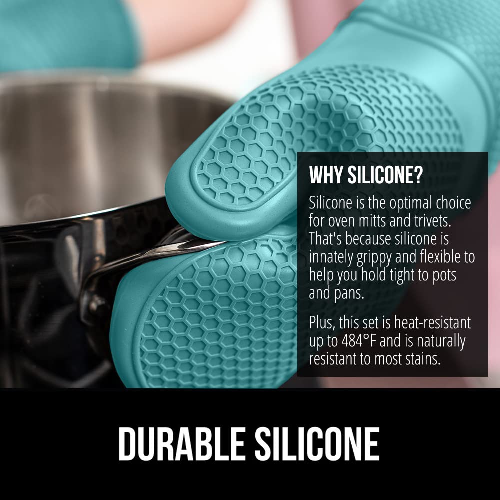 WATERPROOF AND STAIN RESISTANT: no more constantly stained oven mitts and trivets; Gorilla Grip Silicone Mitts and Trivets are both stain resistant and waterproof; spills can easily and instantly be rinsed away under water; hot liquids won’t soak through and scald your skin as they would with other materials; trivets are also dishwasher safe