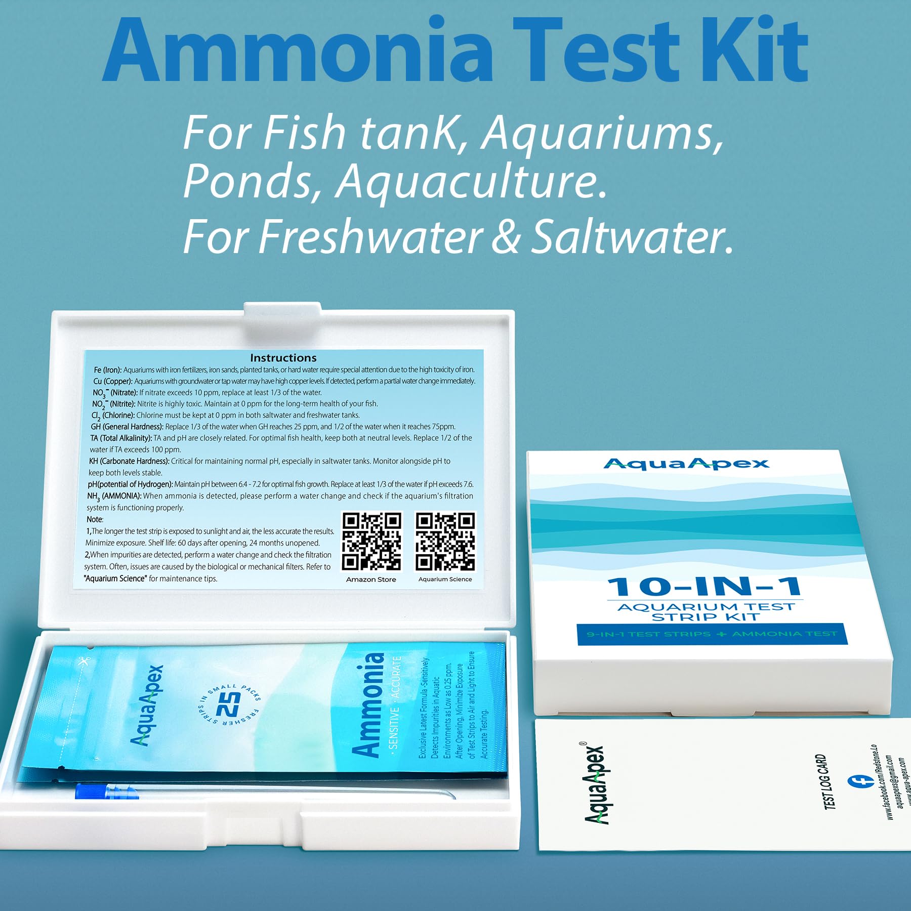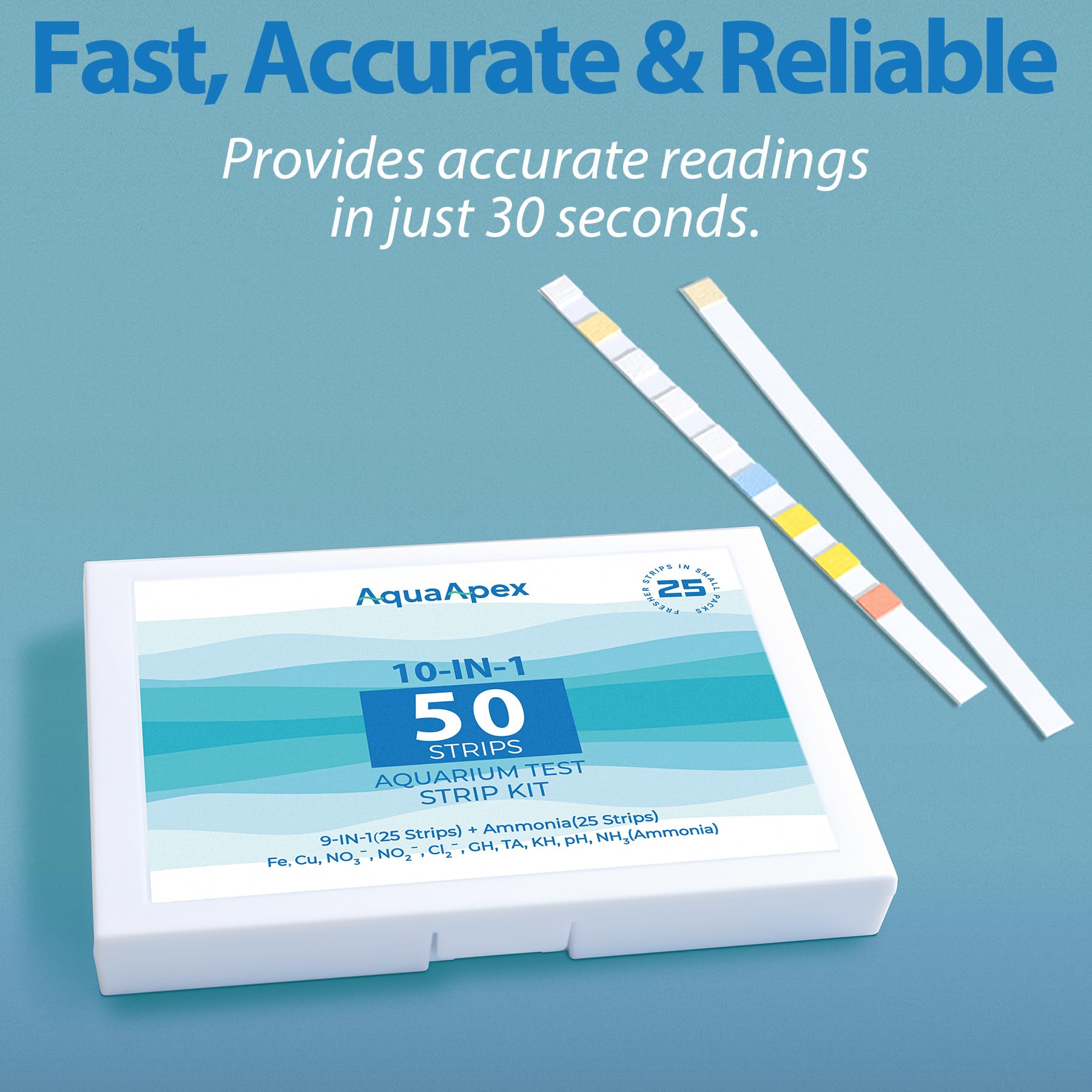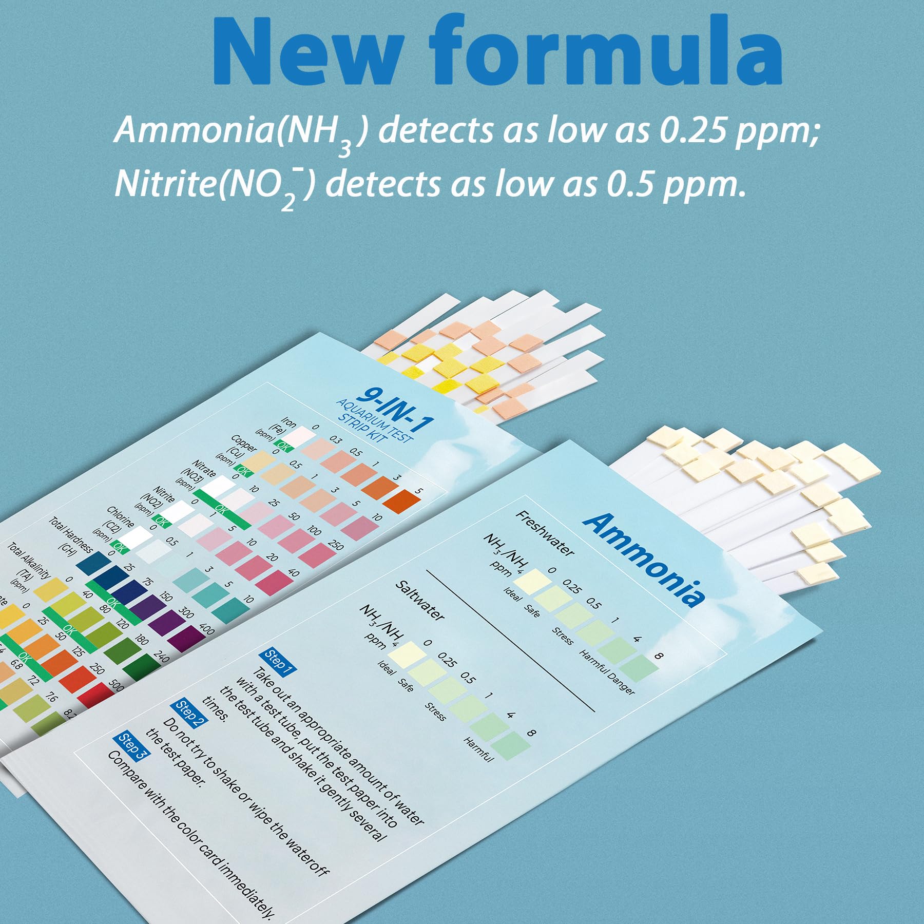 10-in-1 Ammonia test kit aquarium: 50 Strips (25 Multi-Test Strips + 25 Ammonia Strips). Works in freshwater & saltwater. precisely measures NH₃ (0.25ppm) and NO₂⁻ (0.5ppm) - the most dependable ammonia test kit for aquariums available