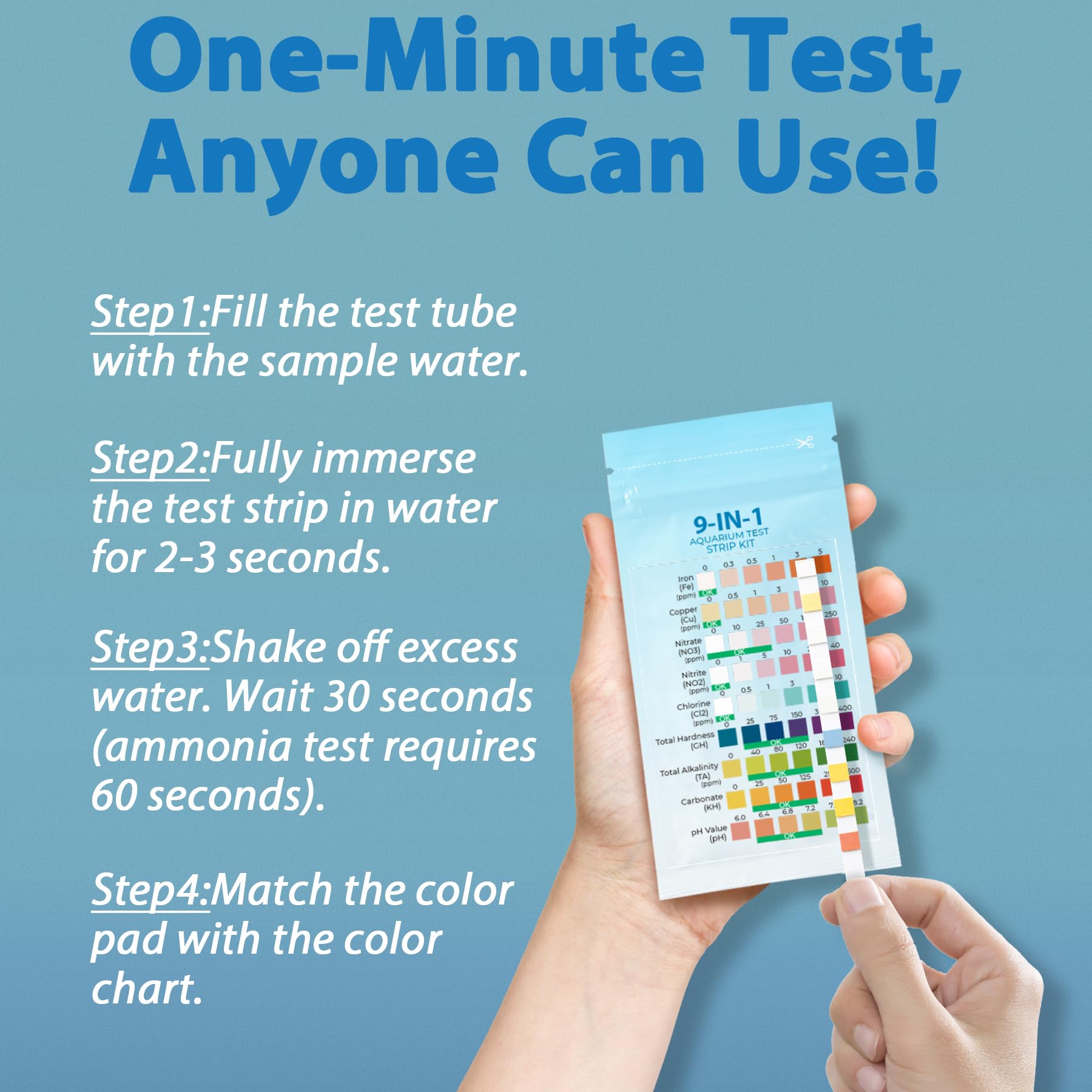 Simple, Fast & Reliable:1,Fill the test tube with water. 2,Fully immerse the test strip for 2-3 seconds. 3,Shake off excess water. Wait 30 seconds (60 seconds for the ammonia test). 4,Match colors to the chart