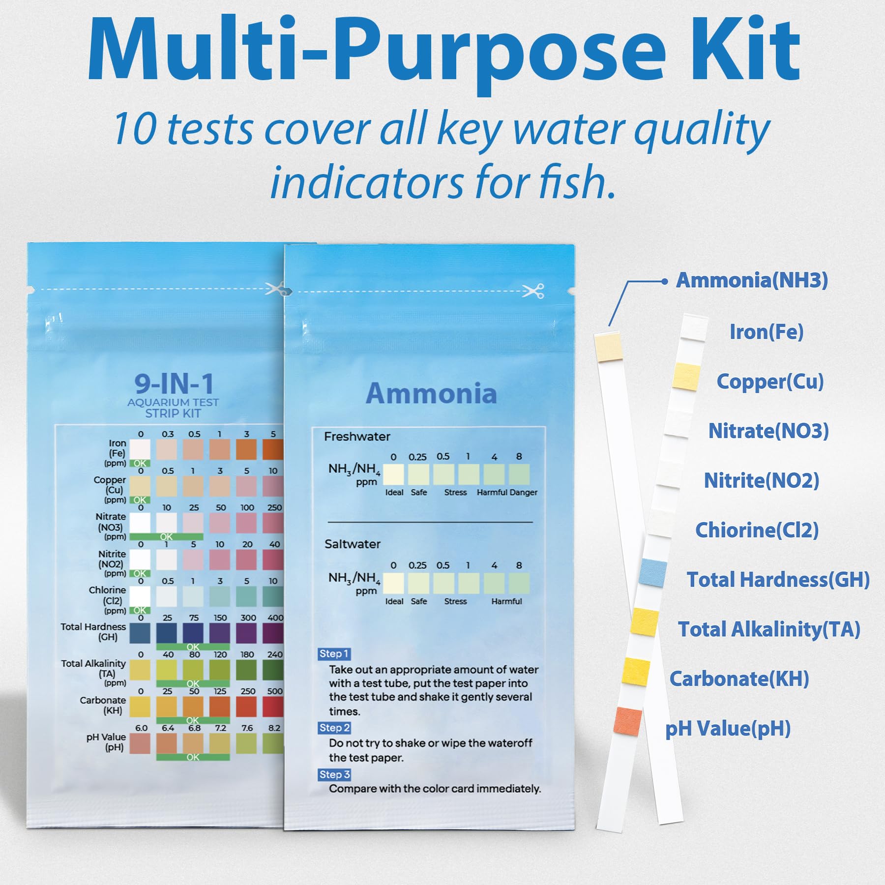 Ammonia test kit aquarium: Also detects 9 additional parameters - Iron (Fe), Copper (Cu), Nitrite (NO₂-), Chlorine (Cl₂), General Hardness (GH), Total Alkalinity (TAL), Carbonate Hardness (KH), and ammonia (NH₃). provides complete water testing coverage for your aquarium