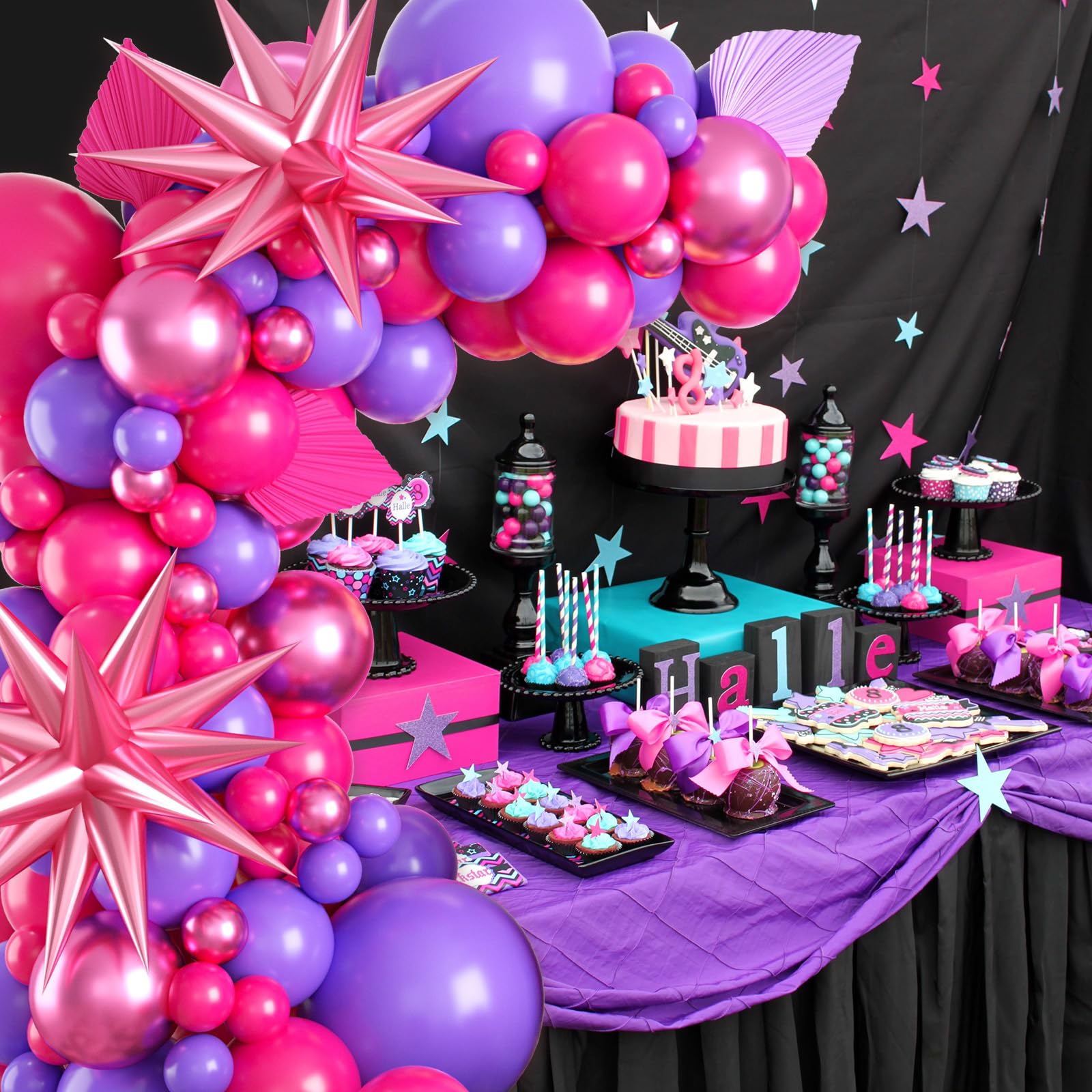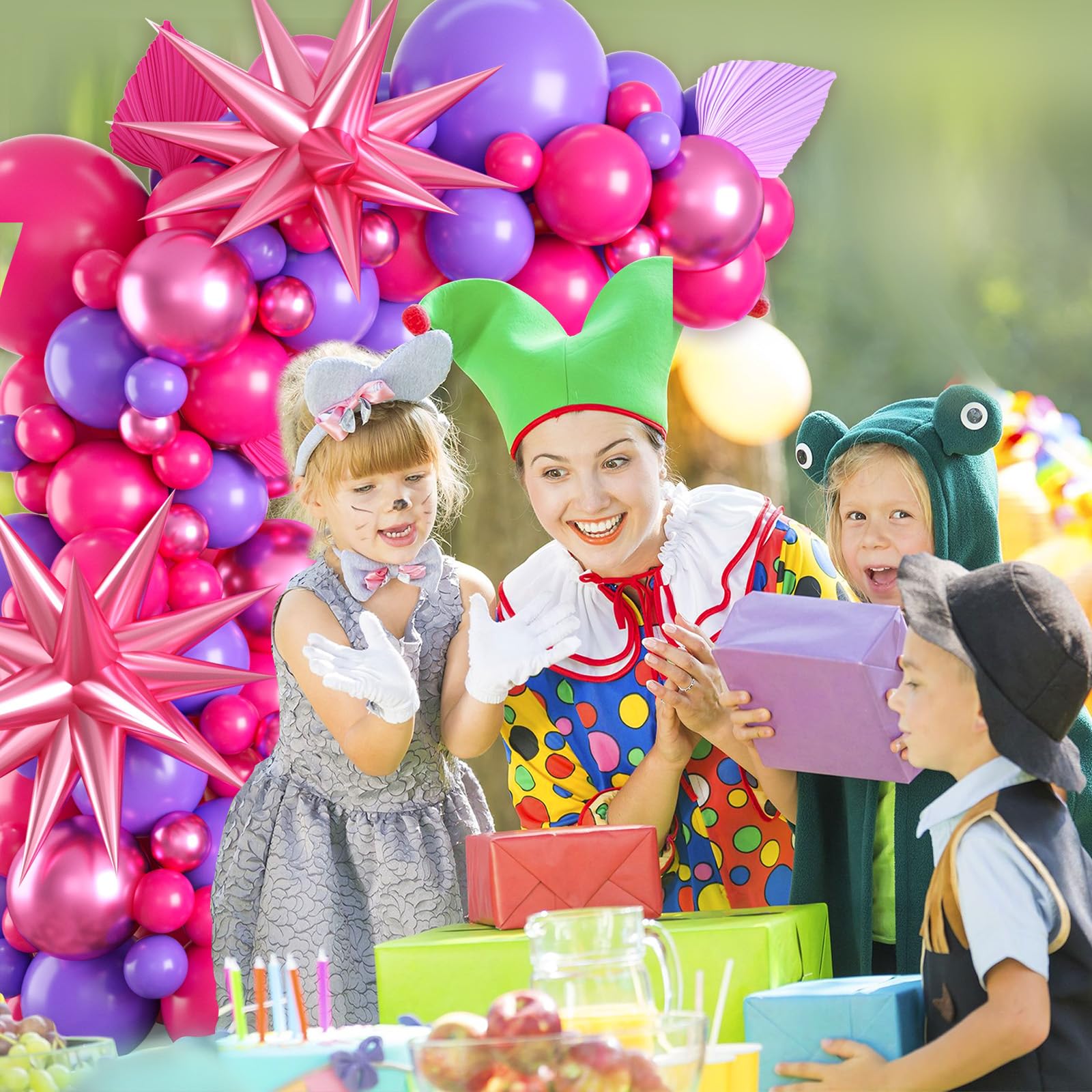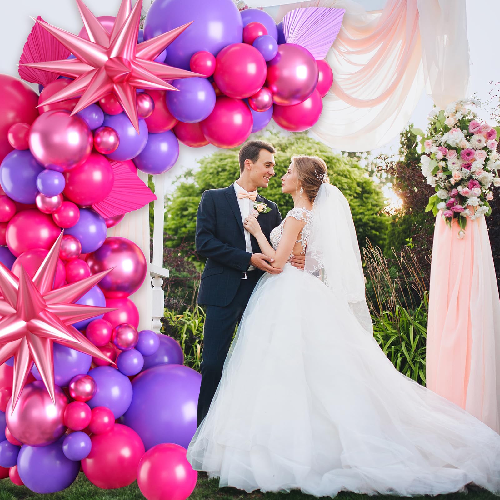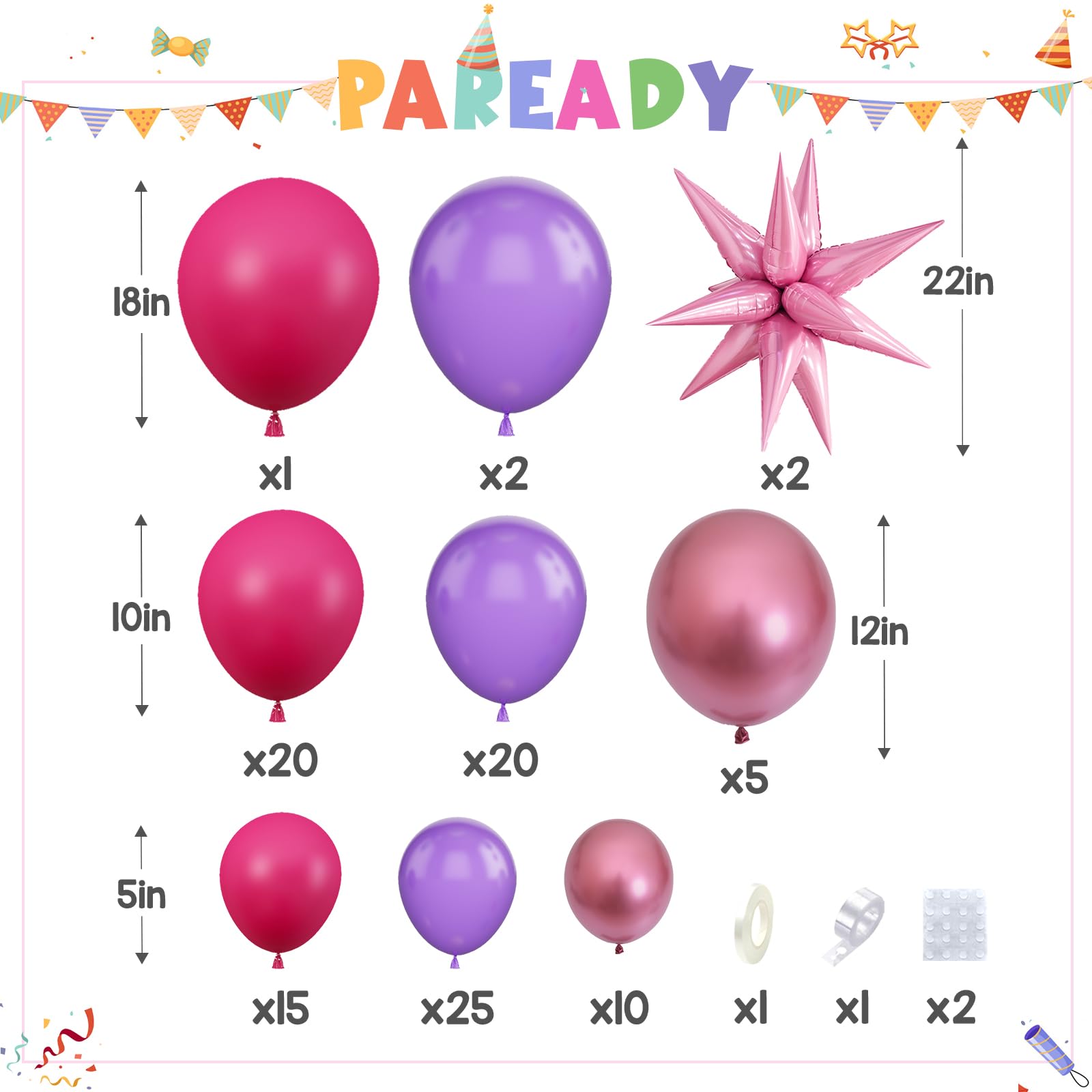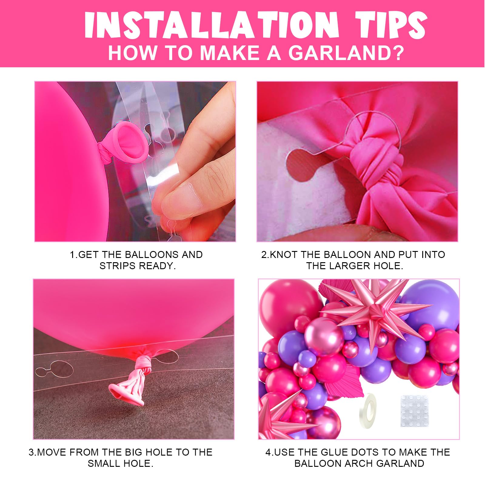 【Hot Pink Balloon Garland Kit】 The hot pink balloons arch kit included hot pink, purple, metallic red balloons for size of 5, 10, 12, 18 inches. Also with foil balloons: 22 inches pink explosion star. Equipped with 1 white ribbon, 1 roll of balloon chains, 2pcs dispensing adhesive.