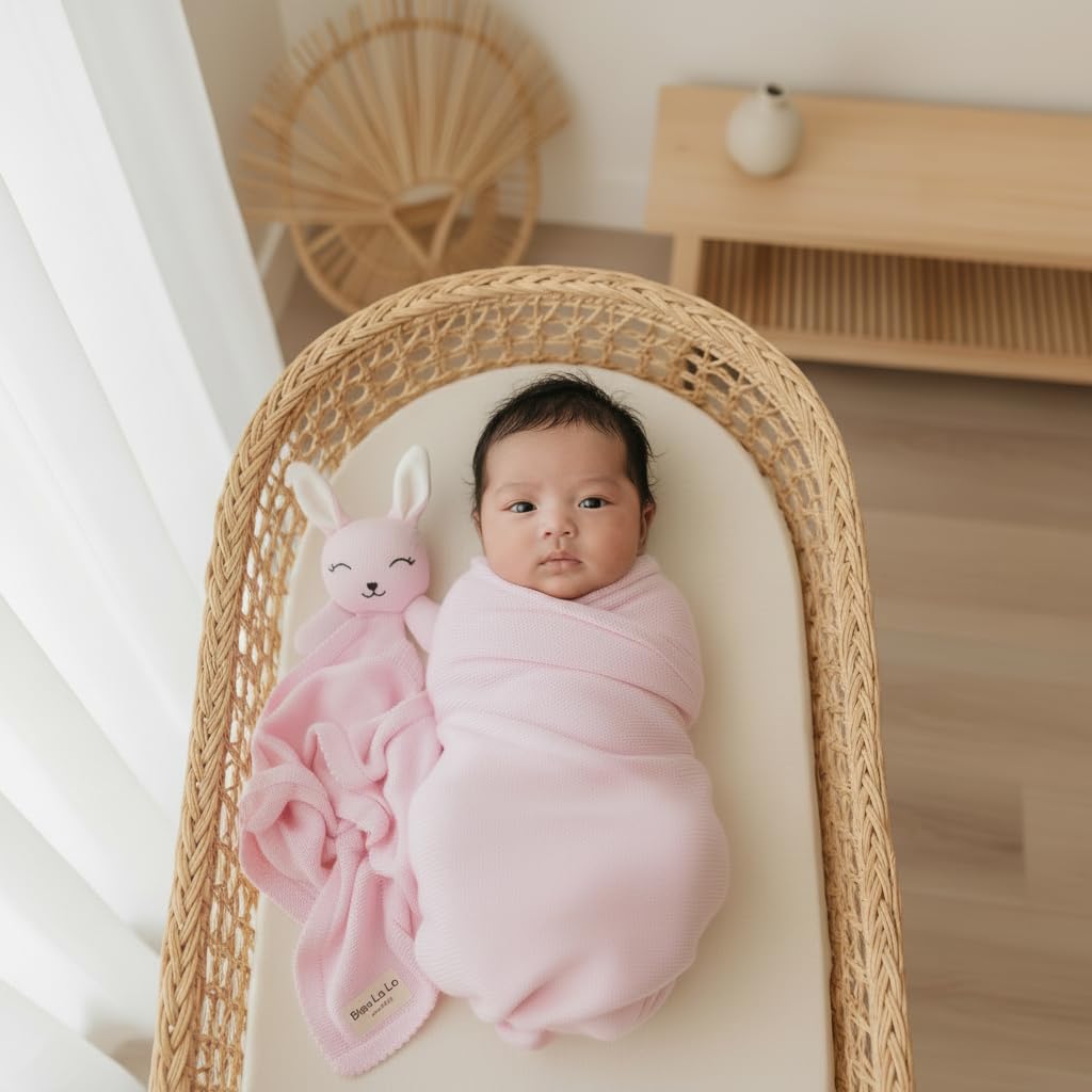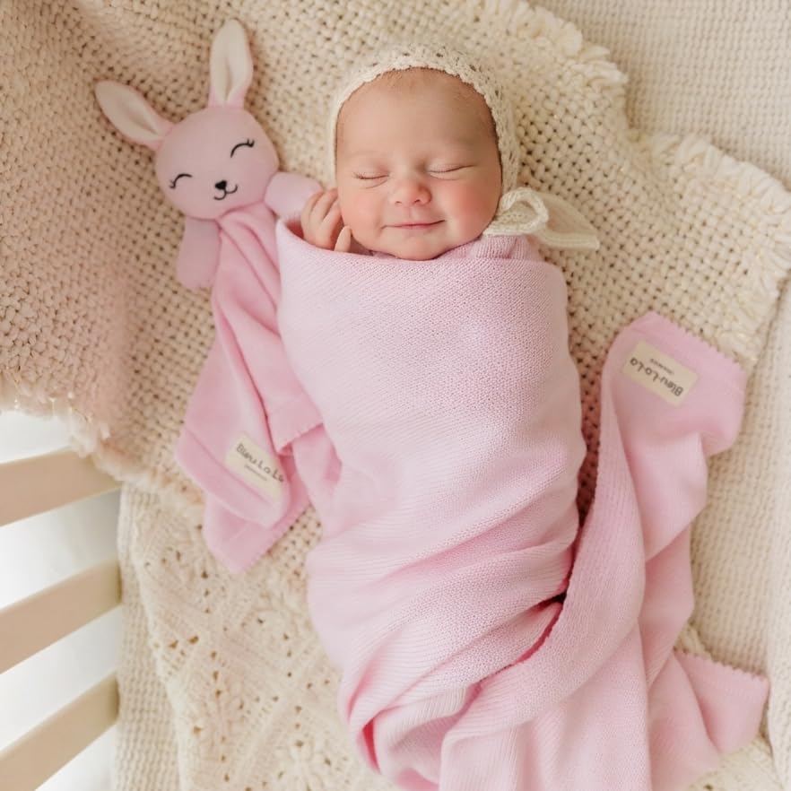 A Cozy Blanket and Lovey Set: This sweet set includes a soft knit baby blanket and a cuddly lovey security blanket, both made from gentle organic cotton that feels soft and comforting against delicate newborn skin.