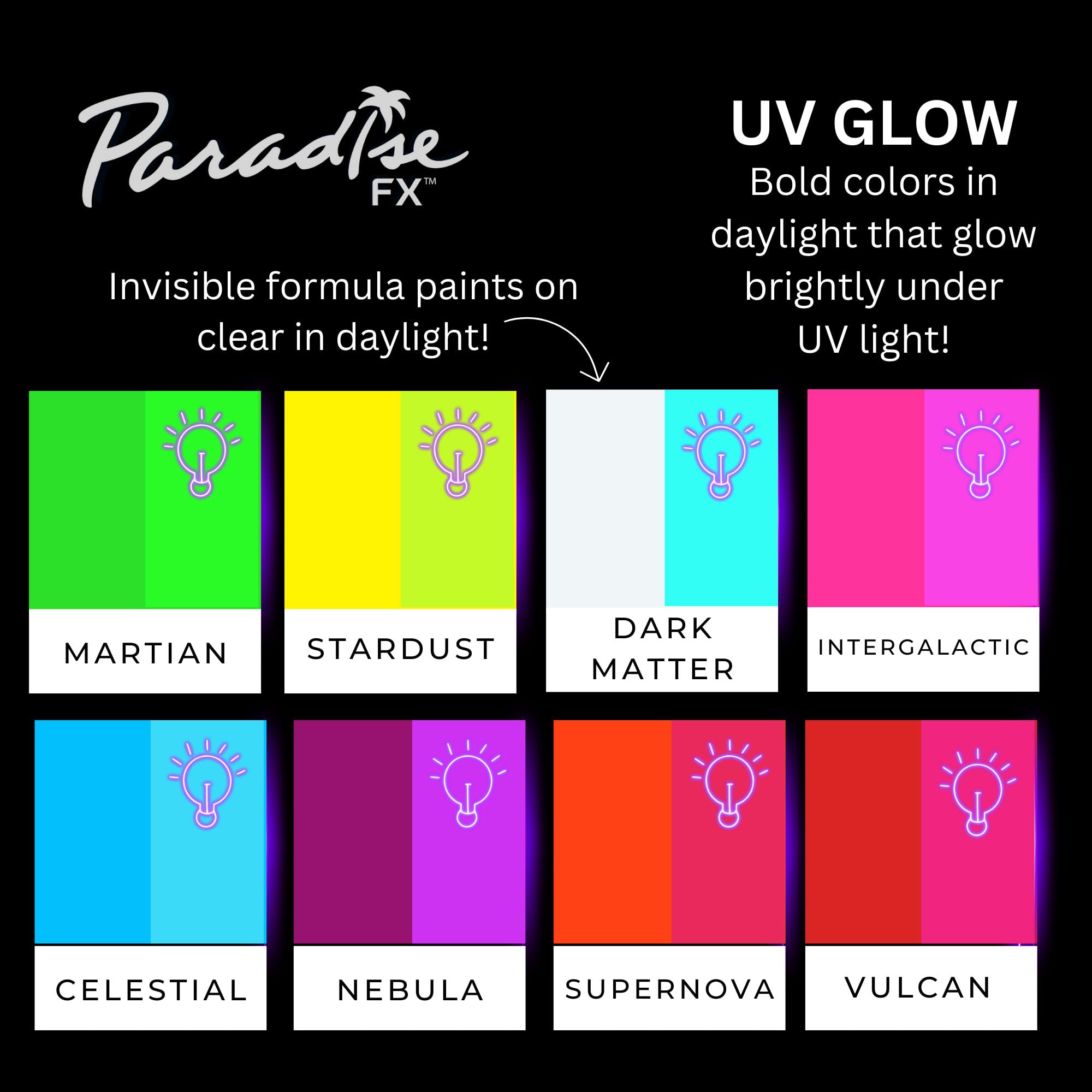 HIGH QUALITY: Made in the USA with the highest quality ingredients, Mehron Makeup Paradise FX Neon Glow UV Paint & Metallics are the preferred choice of award-winning artists around the world.