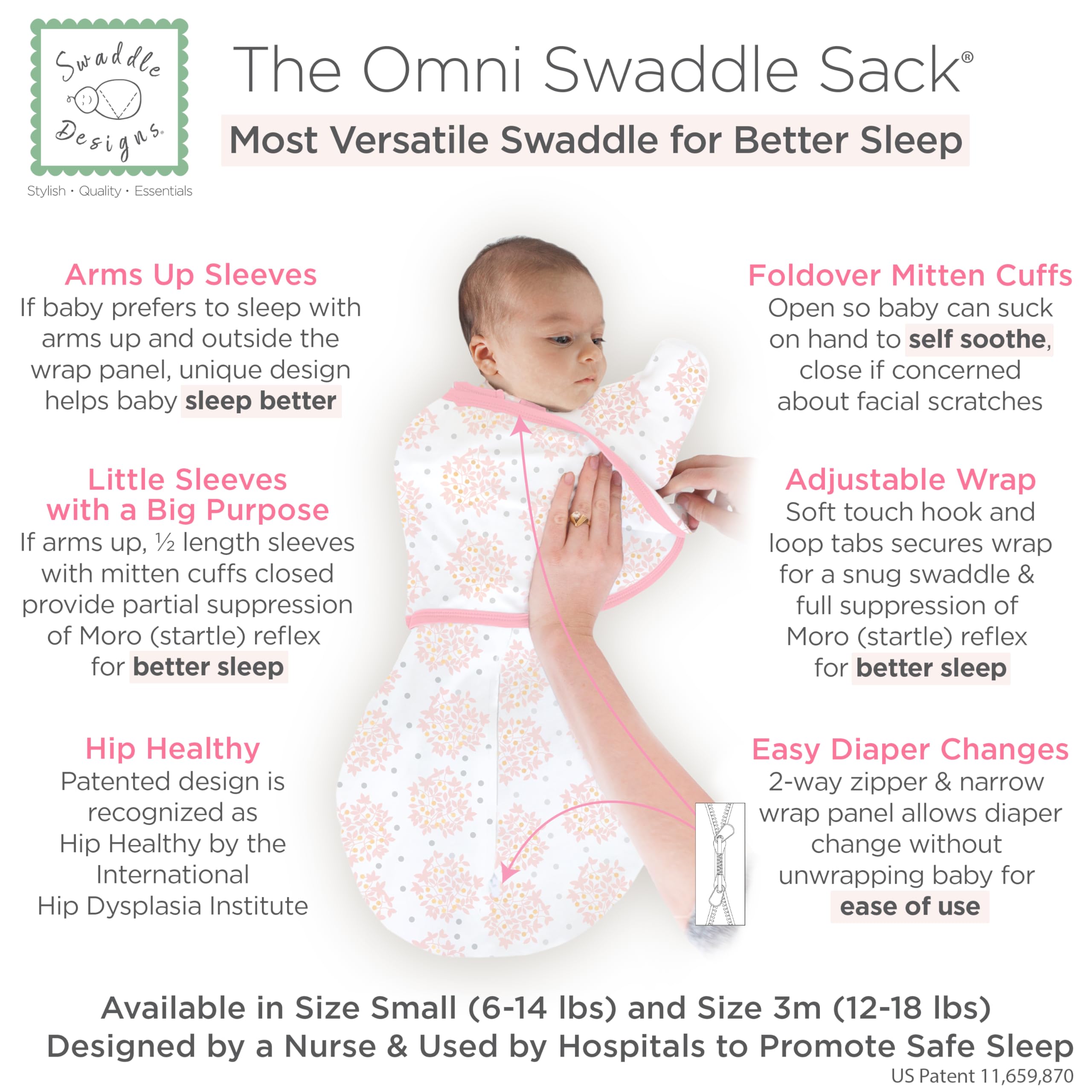 Description The 6-way Omni Swaddle Sack with Adjustable Wrap and uniquely shaped 1/2 length sleeves with mitten cuffs is the ideal swaddle designed by a nurse. The ergonomic and convertible design supports more natural hand and arm positions, and provides parents with more options when preparing baby for safe sleep. The design allows parents to swaddle with (1) arms on chest under the wrap (2) one or both hands up, and (3) both arms up and out from under the wrap. The sleeves with mitten cuffs keep baby's arms warm. Foldover mitten cuffs may be worn open or closed, parents can open the cuffs, so baby can self-soothe by sucking on hands or close the cuffs to protect baby from facial scratches. Many experts recommend parents to swaddle baby with hands within reach of mouth, so baby can self-soothe. Babies who can self-soothe sleep longer and better. When baby is swaddled with hands up or arms up, baby can self-soothe by sucking on hands. The ergonomic, patented design with 2-way zipper is easy to use. The adjustable wrap is narrow and does not interfere with baby's hips and the soft hook-and-loop fasteners make it easy to swaddle baby. The 2-way zipper allows parents to unzip from the foot to check baby's diaper without unwrapping the swaddle. The 2-way zipper makes it easy to place baby in the sack by unzipping from the top. Size Small 6-14 lbs, 0-3m. Size 3m 12-18 lbs for bigger baby. When baby shows signs of attempting to rollover, the AAP recommends that parents stop restraining baby's arms with a swaddle or wrap. Parents can use the Omni as a transition swaddle with arms up and wrap secured around tummy and chest. When baby outgrows the Omni Swaddle Sack, we recommend a SwaddleDesigns Transitional Swaddle Sack® or a zzZipMe Sleeping Sack wearable blanket. Super soft, premium cotton knit is breathable, stretchy, and natural. 100% Cotton. Machine wash. Tumble dry. US Patents 11,659,870 & D924,539. Int’l patents EU, UK, Canada and others online