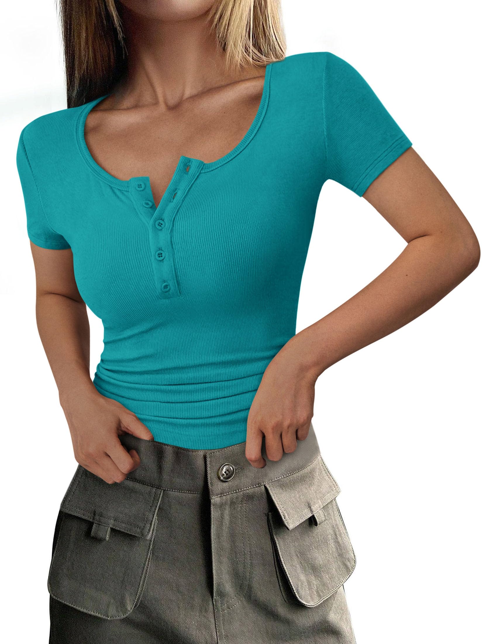 Features - Womens summer tops are designed with ribbed knit, scoop neck, short sleeve, slim fit. Suitable for daily wear, home, work, street wear, party, dates, vacation, shopping, cafes and other casual occasions.
