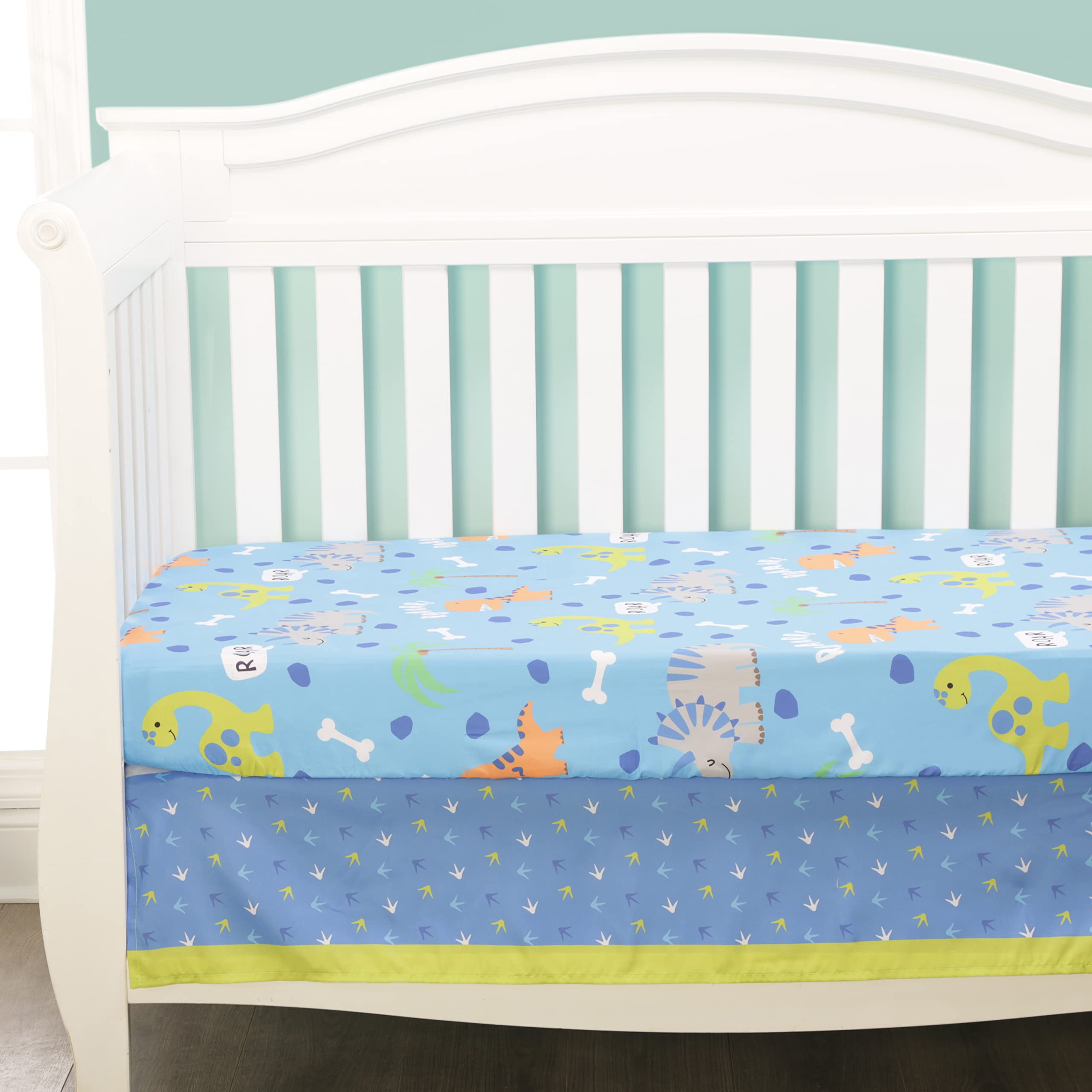 INCLUDES BABY AND TODDLER BEDDING SET PIECES: With a fine quality fitted sheet made of soft-brushed polyester microfiber, a luxurious and oh-so-cute microfiber quilt, as well as a green, gray, white and blue print crib skirt, your baby will sleep comfortably every night! Each piece is machine washable and dryable.