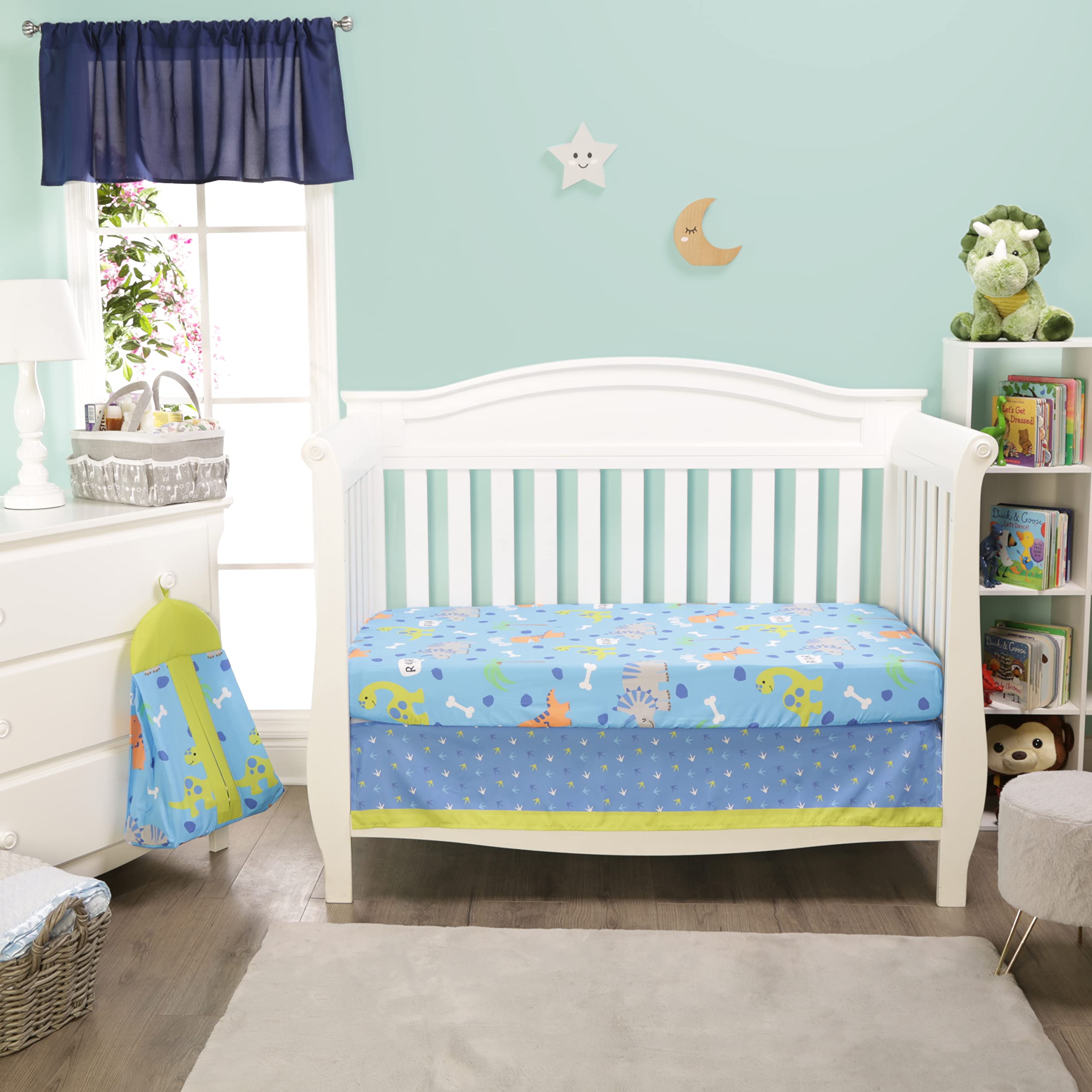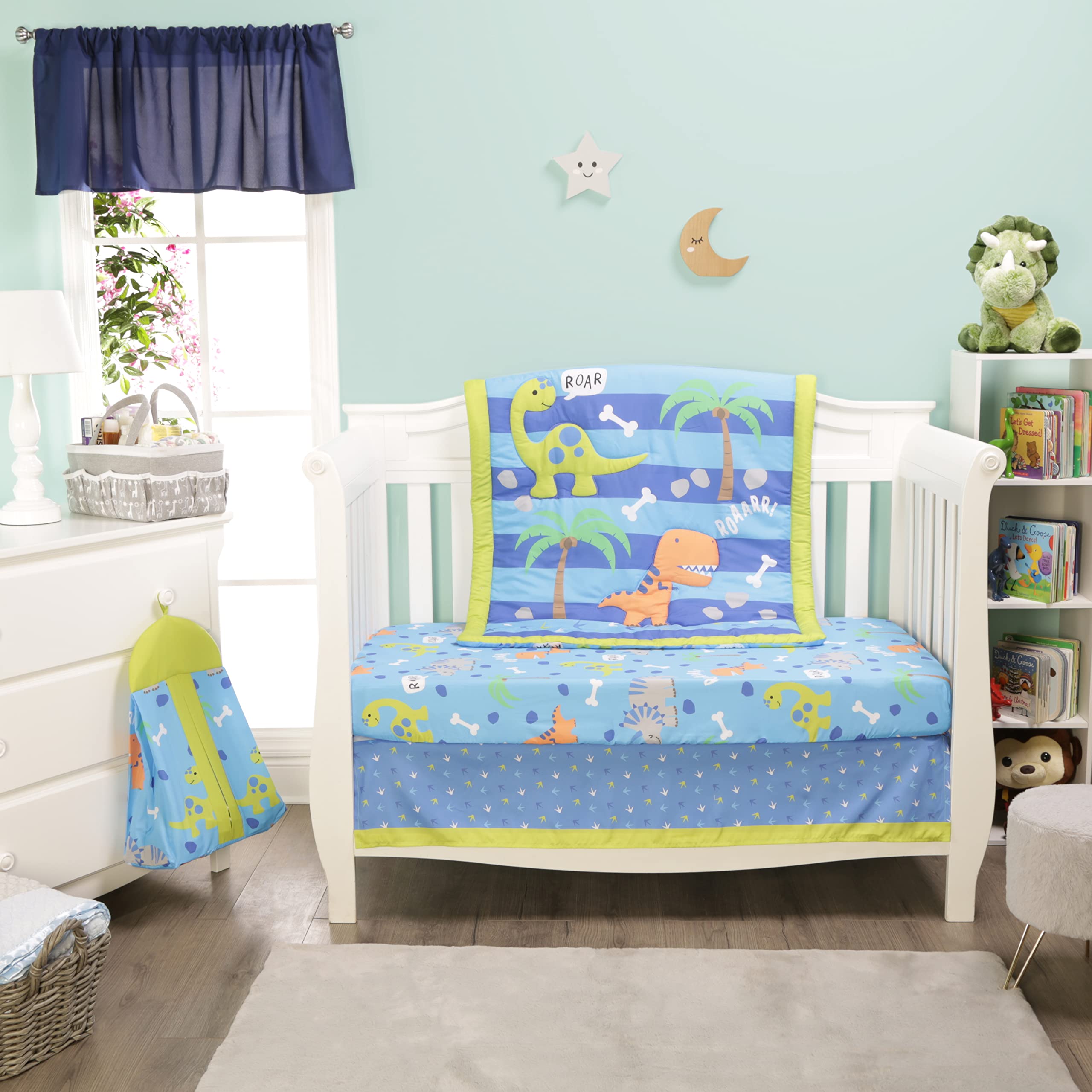 ALSO INCLUDES A HANGING DIAPER ORGANIZER: In coordinating green and blue, the diaper stacker also features delightfully sweet images of dinosaurs!