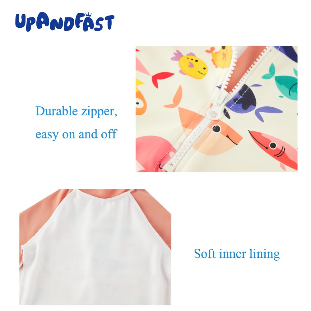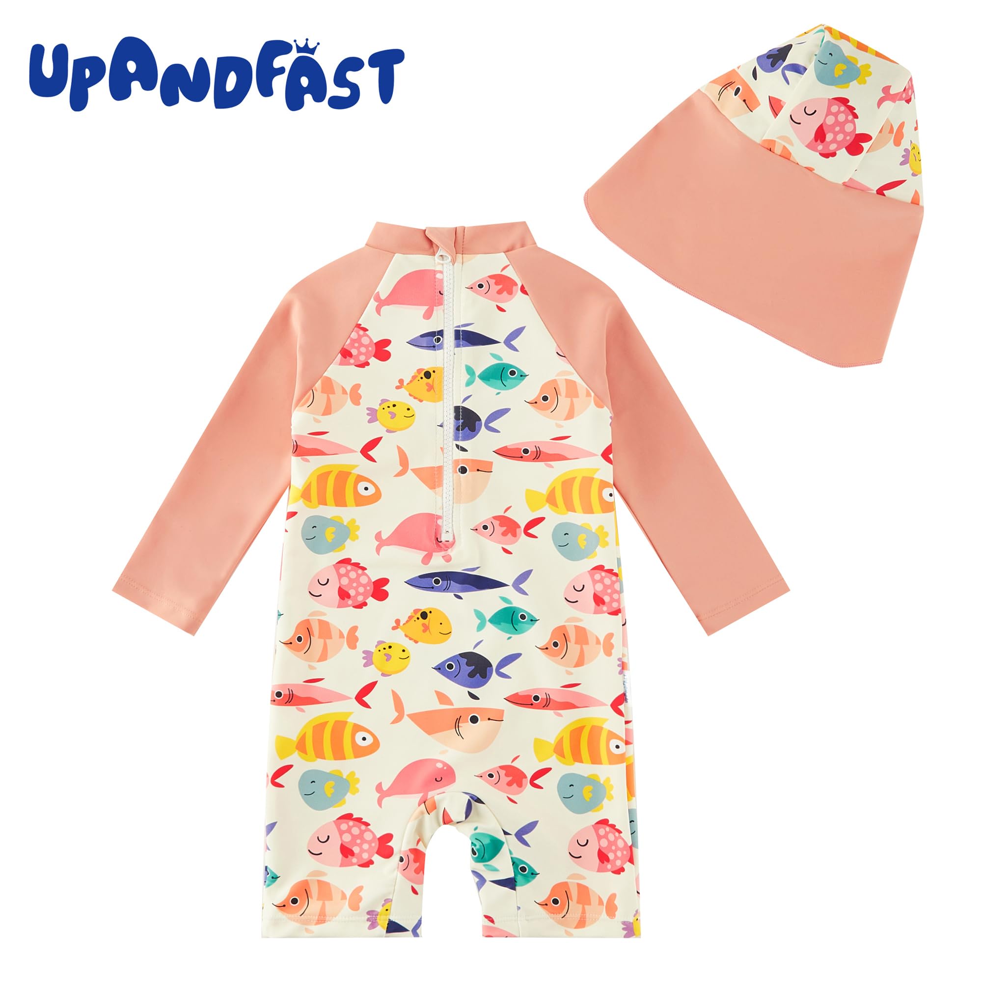 HUMANIZATION DESIGN: This one-piece baby bathing suit has a front / back zip for convenient putting on and taking off. Zipper flap and garage protect your baby's delicate skin