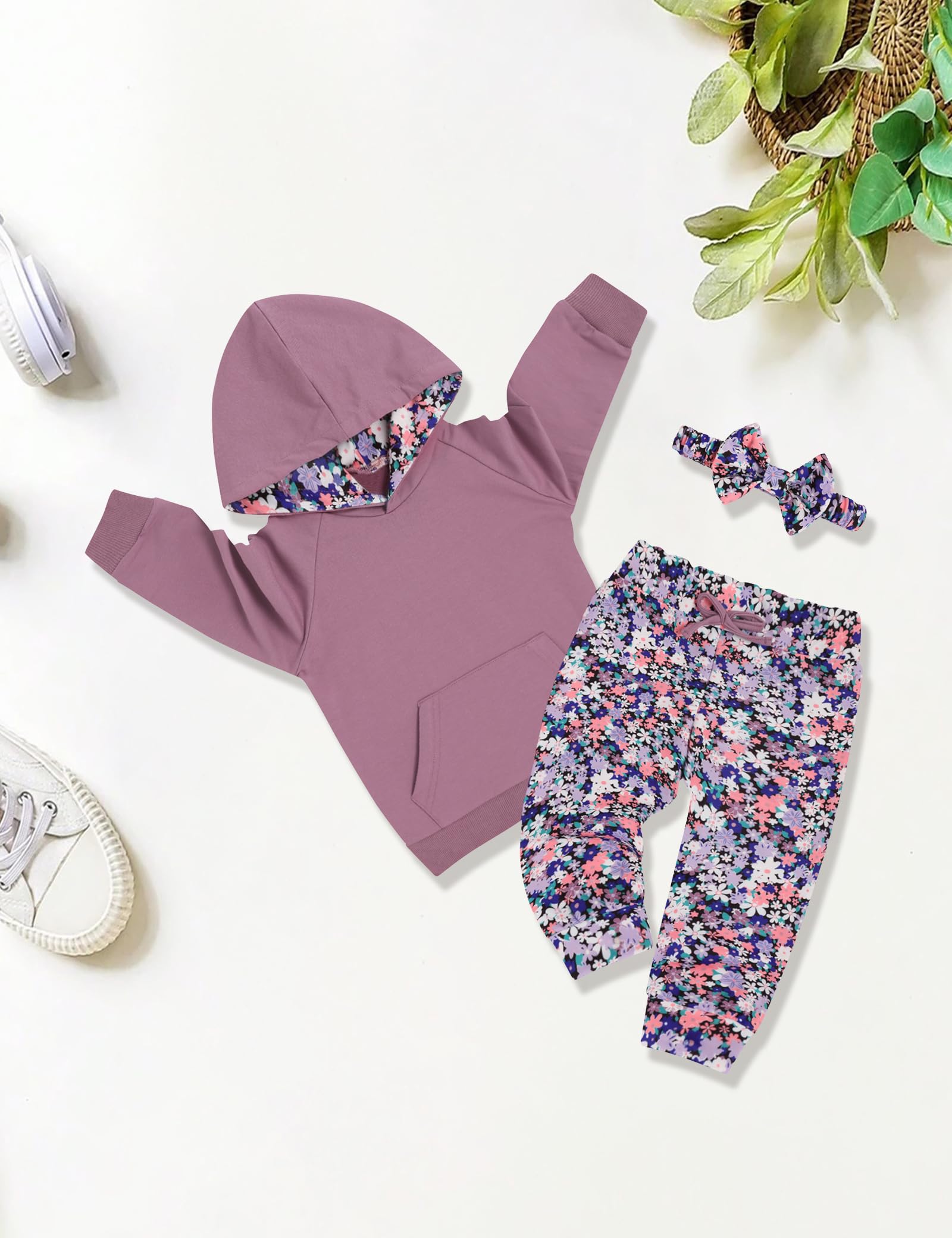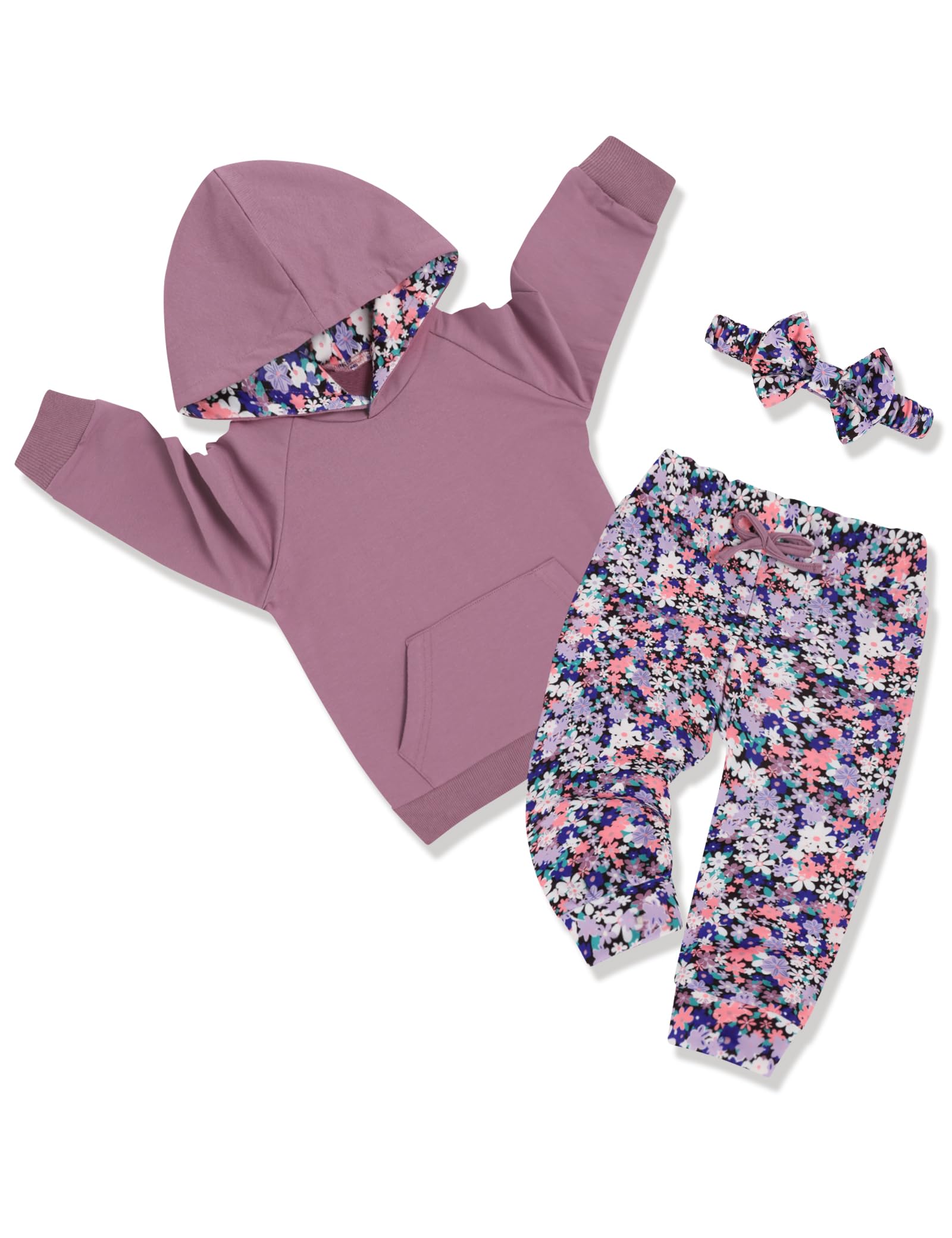 Complete Set:This baby clothes for girls package includes 1 hooded top, 1 printed pant, and 1 cute floral headband, available in diverse designs to suit unique styles and brighten up her childhood days
