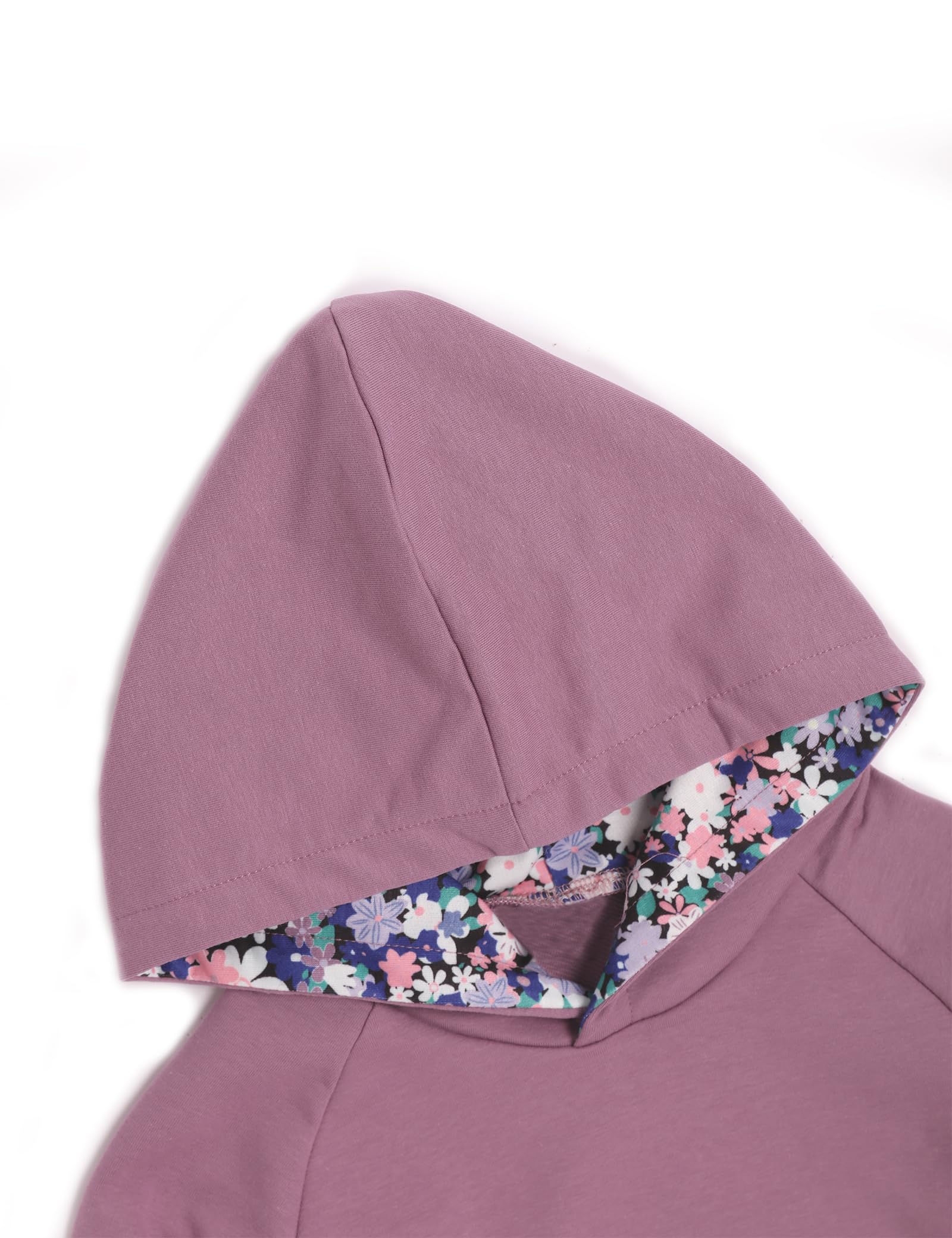 Ingenious Design:A hooded sweatshirt in solid colors, paired with adorable kangaroo pockets, and printed trousers with an elastic waistband for easy wear; Complete with a matching printed headband