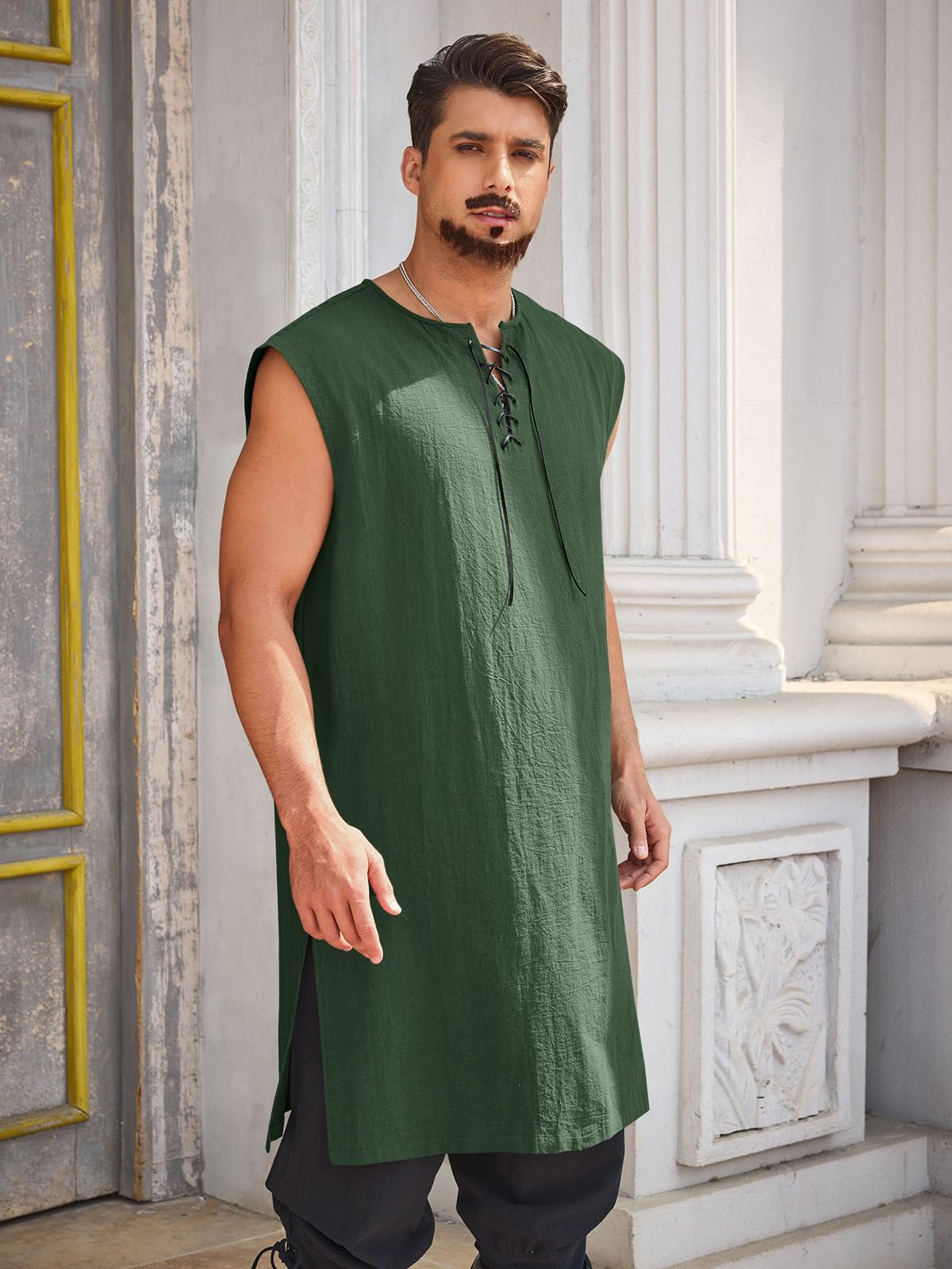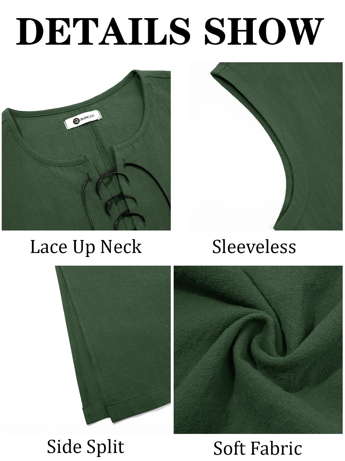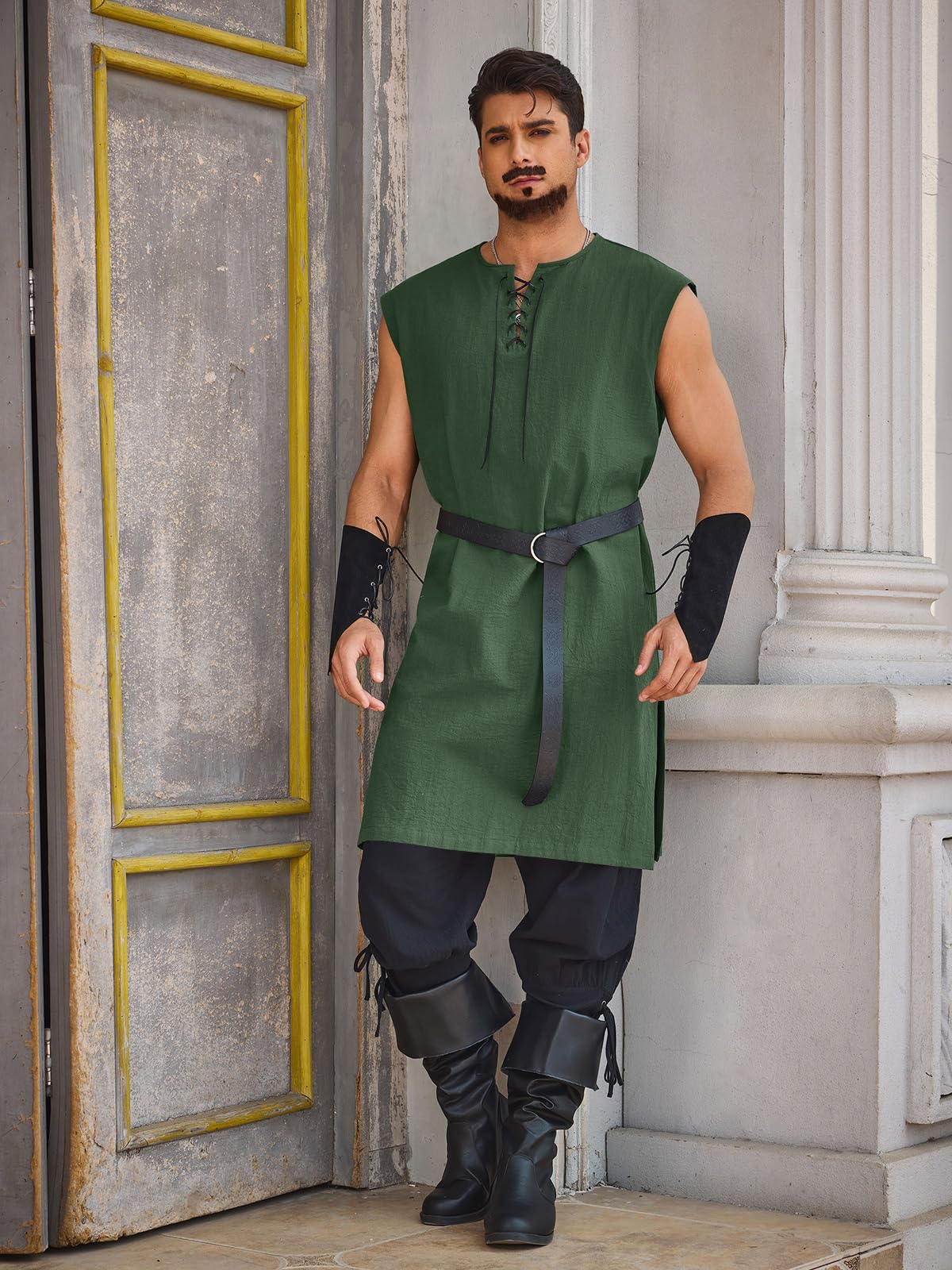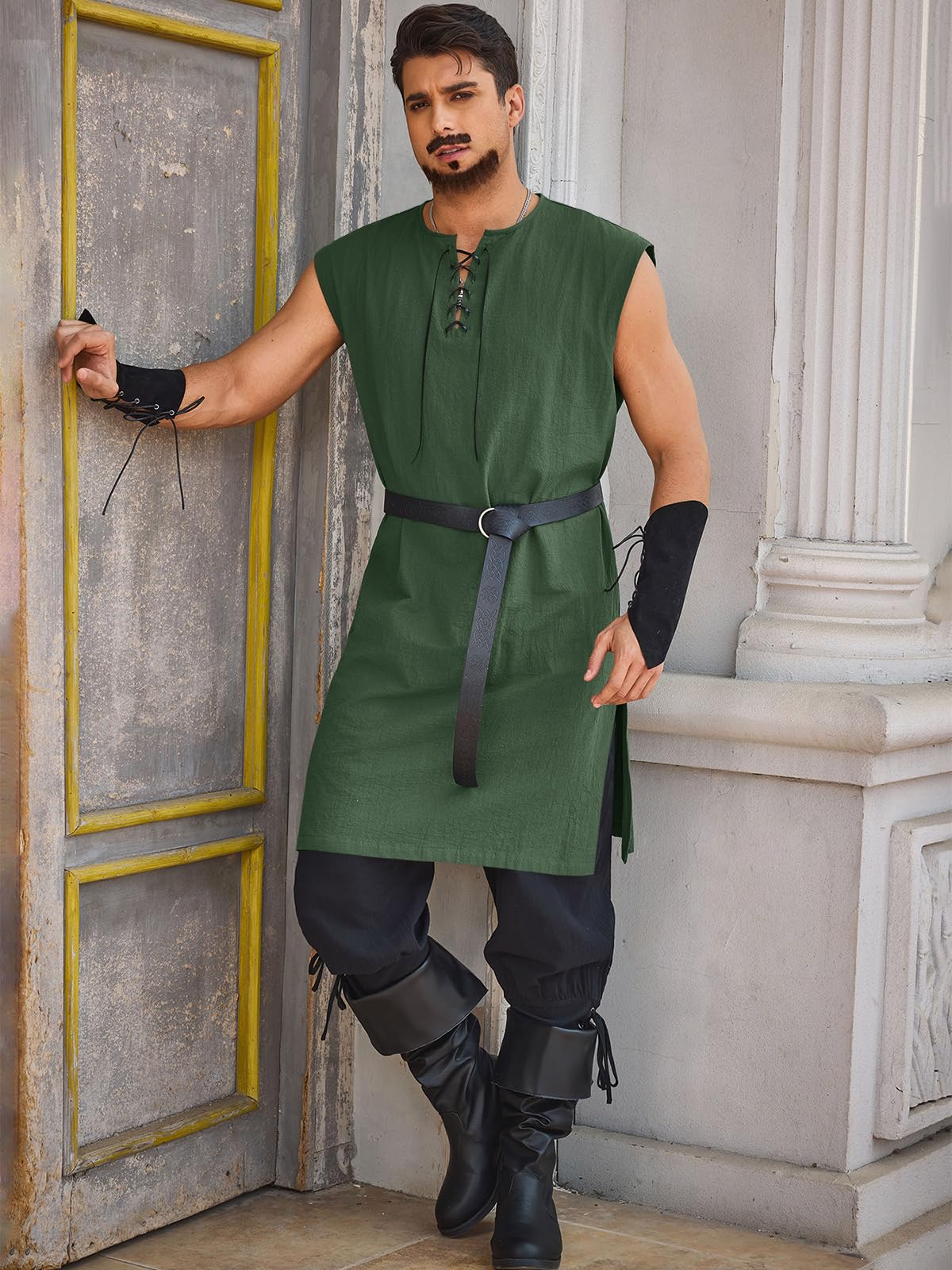 Features: Medieval viking costume tabard with v neck, lace up, sleeveless, split hemline, knight tunic tops with knee length, unisex styles for men and women, Pirate vintage costume shirt for daily dress and Halloween