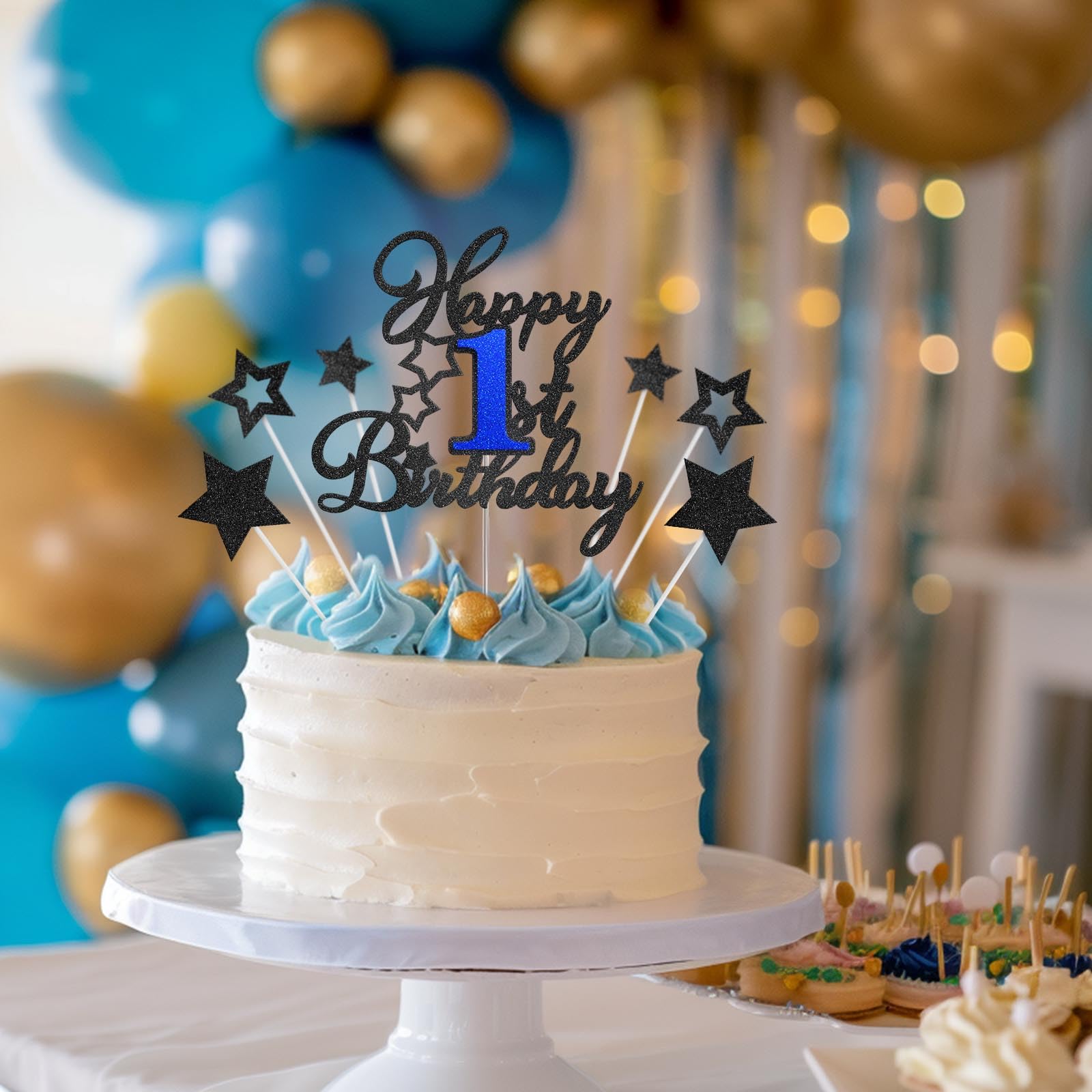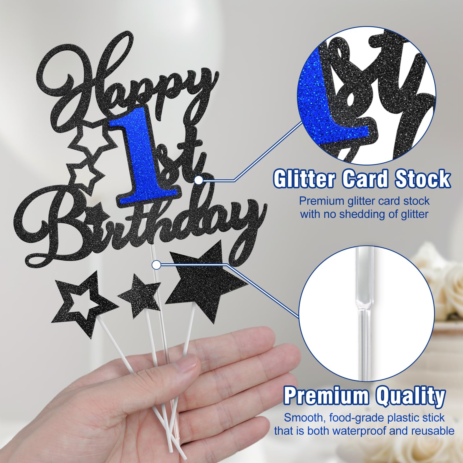 Happy 1st Birthday Cake Topper for Happy 1st Birthday Theme Party Cake Decorations Supplies. Ideal for happy one birthday theme party, 1st anniversary theme party cake decorations supplies. Attention: This cake topper features glitter on one side and is white on the other. It's meant for decoration only, so please do not place it in the oven or microwave. Specifications: Material: - Glitter card stock + Plastic stick - Adhesive dots Package Includes: - 1 pc Happy 1st Birthday cake topper - 1 pc Food-Grade clear plastic stick - 6 pcs Black glitter stars - 6 pcs White plastic sticks - 10 pcs Adhesive dots
