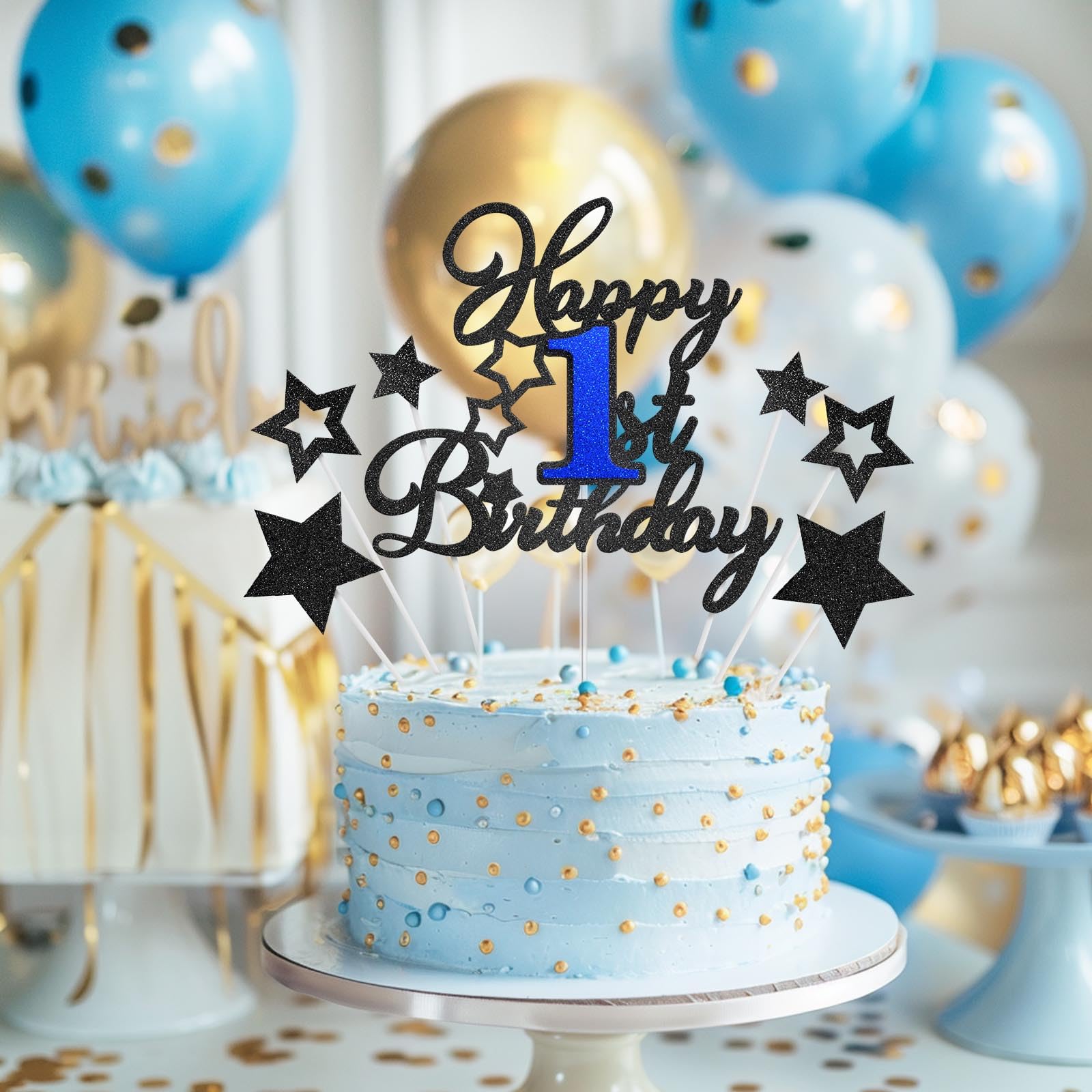 Stylish and Elegant Design: Happy 1st Birthday cake topper with star decorations, crafted from the same glitter card stock, shines brightly, bringing a unique charm to any birthday cake, making it more elegant, eye-catching, and enhancing the festive atmosphere.