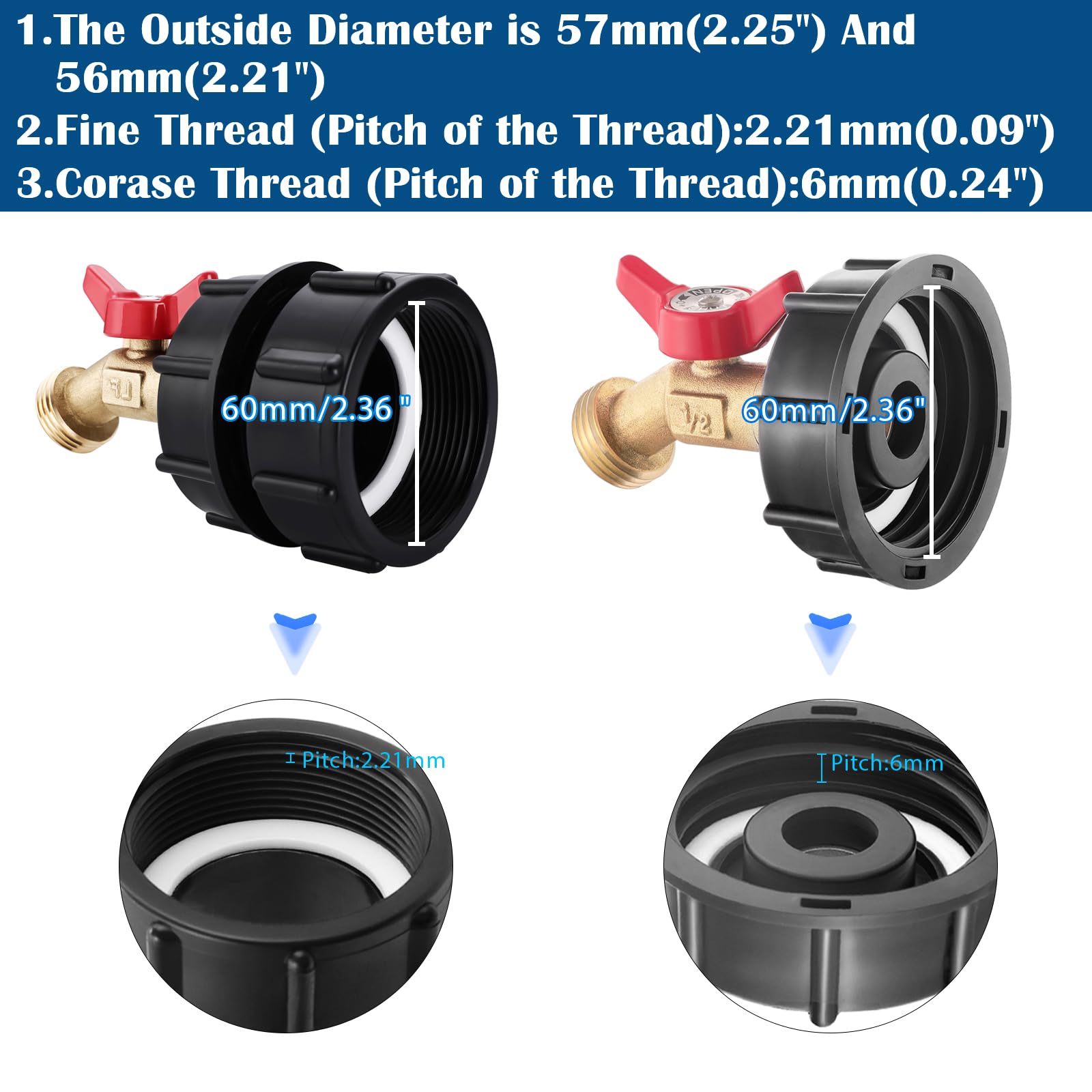 Practical and Reliable: Replace your water tank adapter with this high-quality brass hose faucet valve connector to protect your existing valve and facilitate fine flow control. It also acts as a useful backup safety valve, ensuring smooth water extraction from the tank. Package includes gasket and sealing tape for added convenience. Note: Before purchasing, please confirm that the thread diameter of your IBC tote adapter is 60mm (2.36") to ensure compatibility.