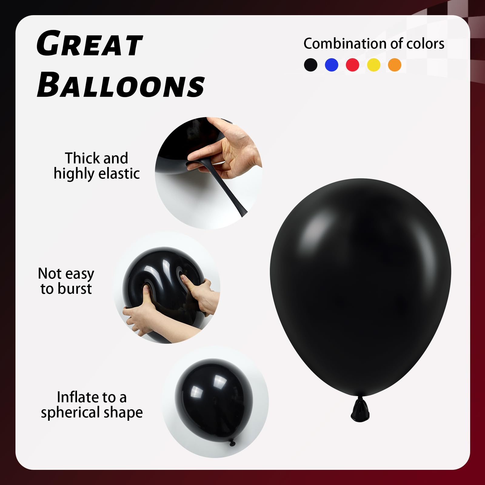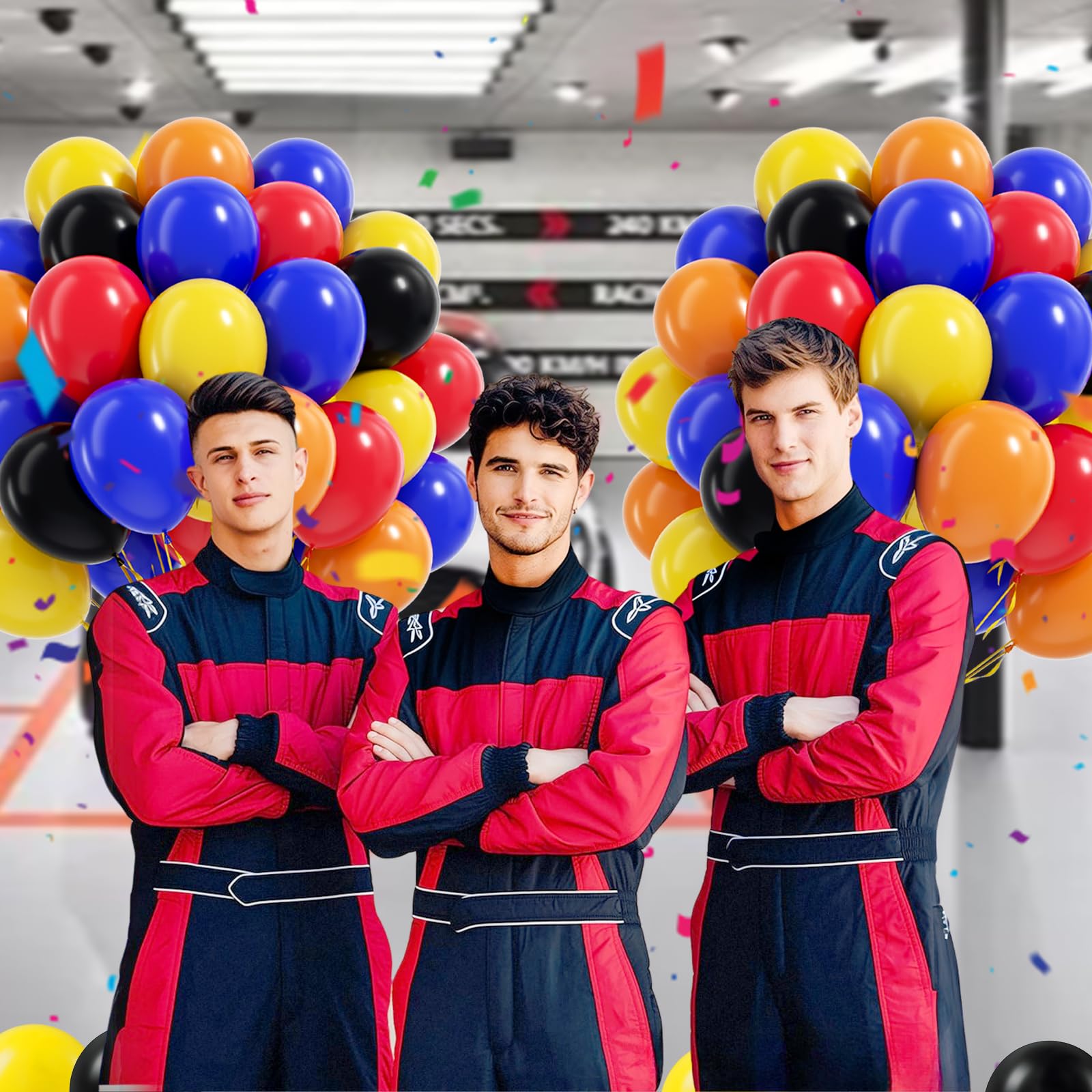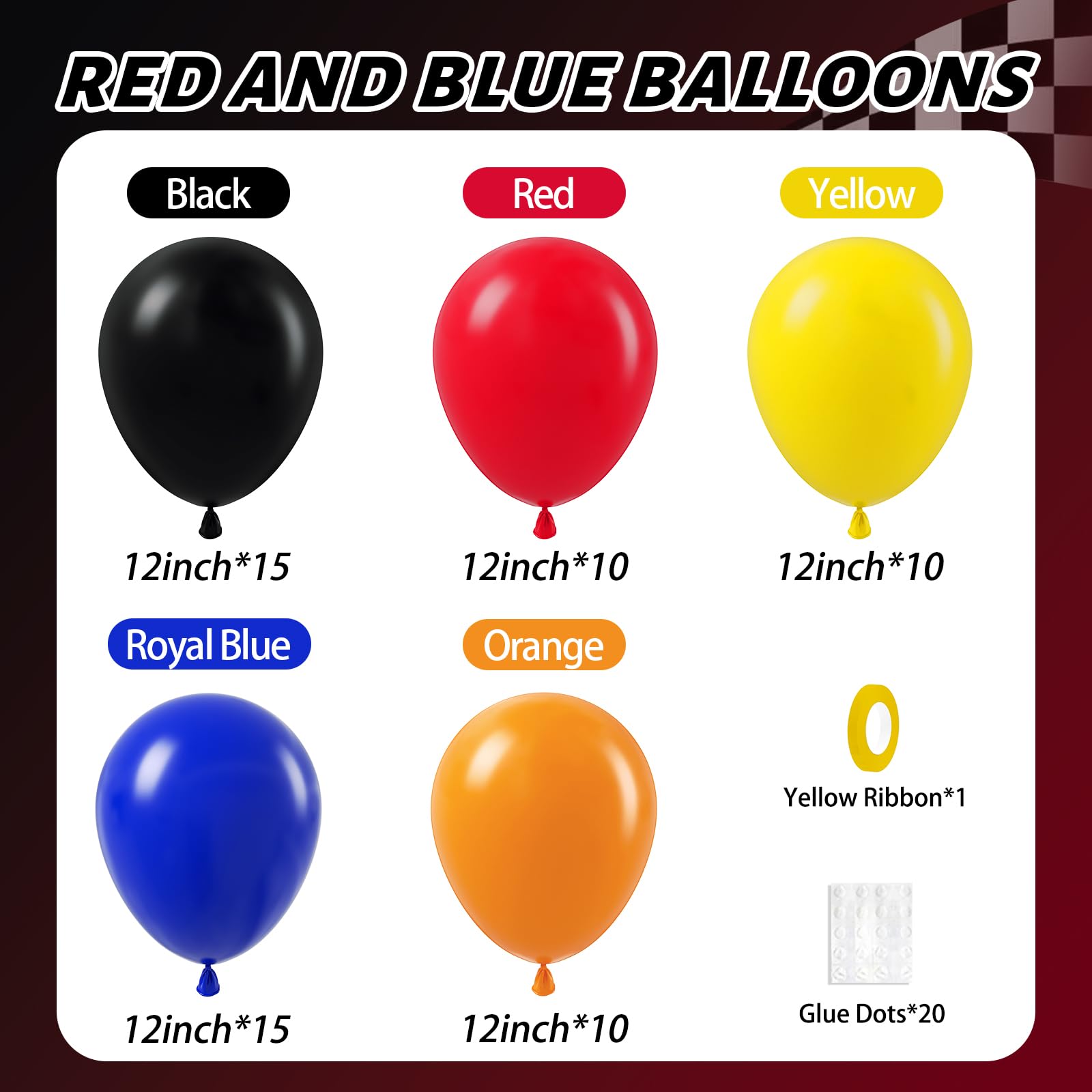 Package Include:The race car balloons include 12inch black balloonsx15, 12inch royal blue balloonsx15, 12inch yellow balloonsx10, 12inch red balloonsx10, 12inch orange balloonsx10, glue dotsx20, yellow ribbonx1